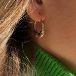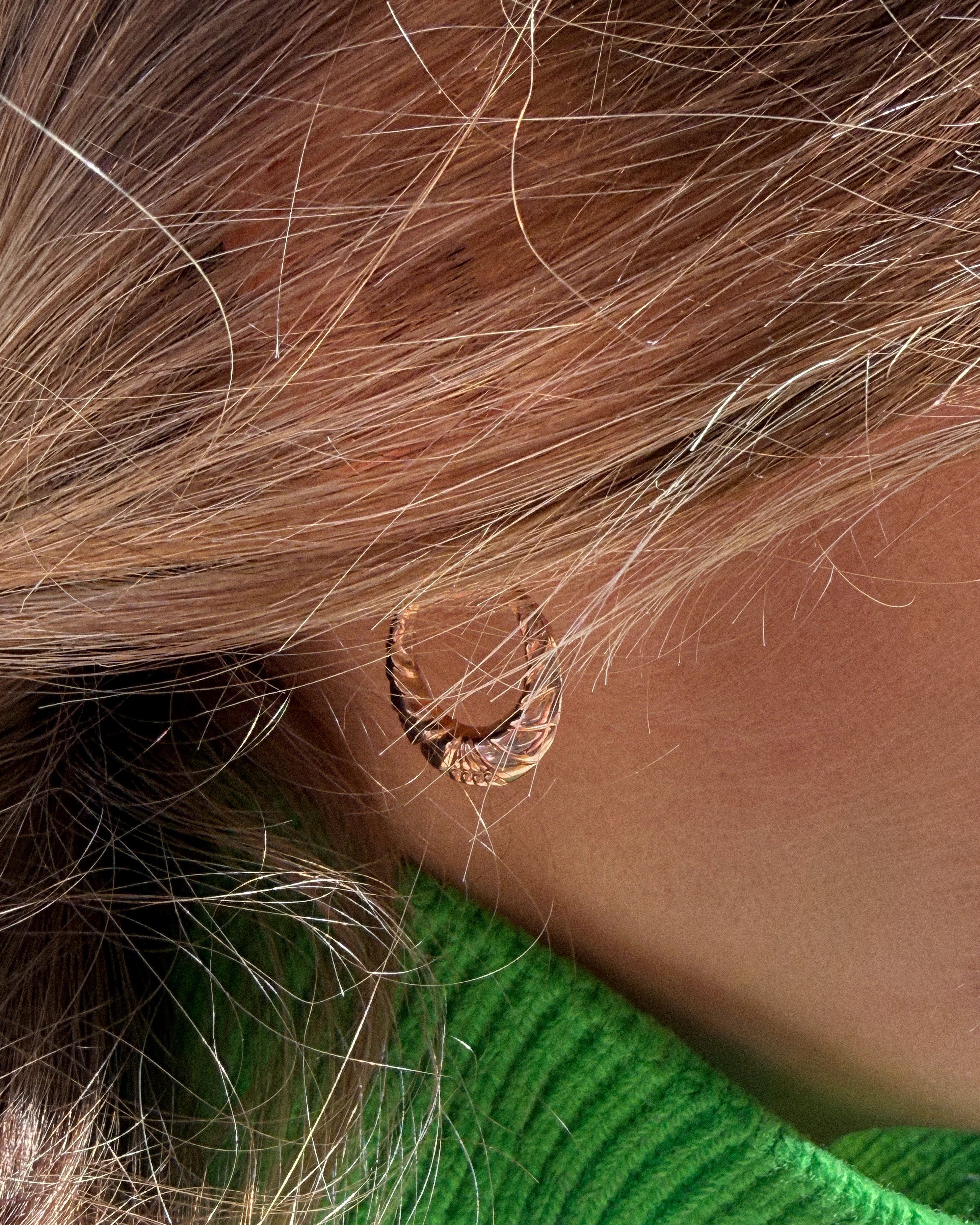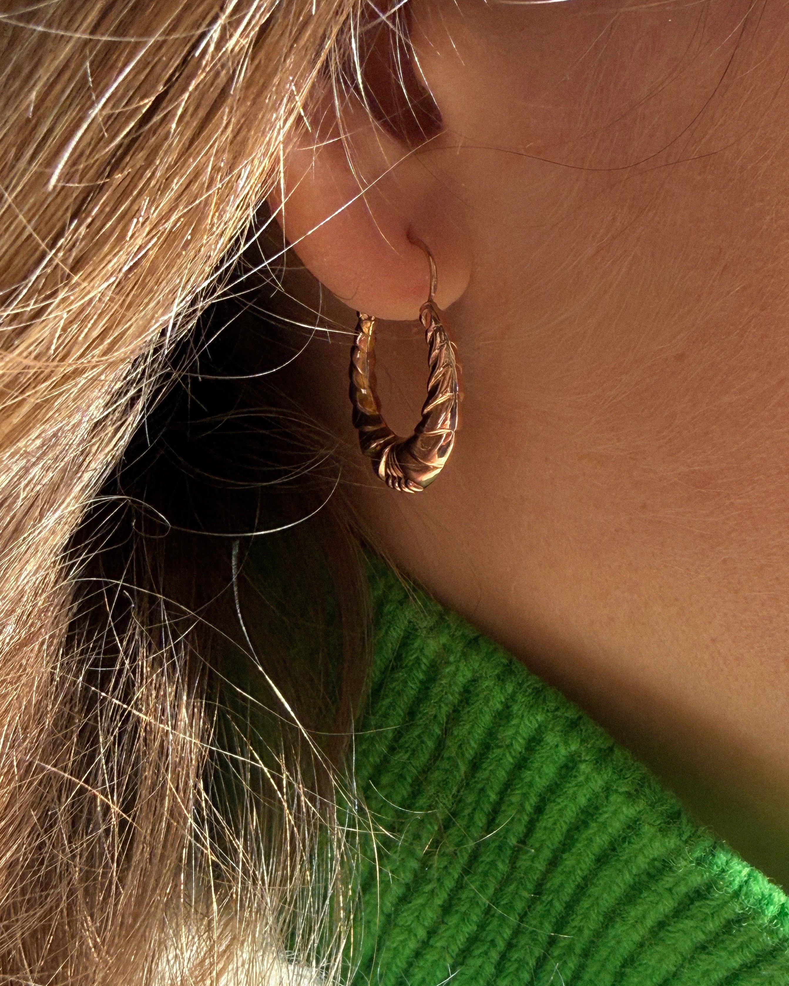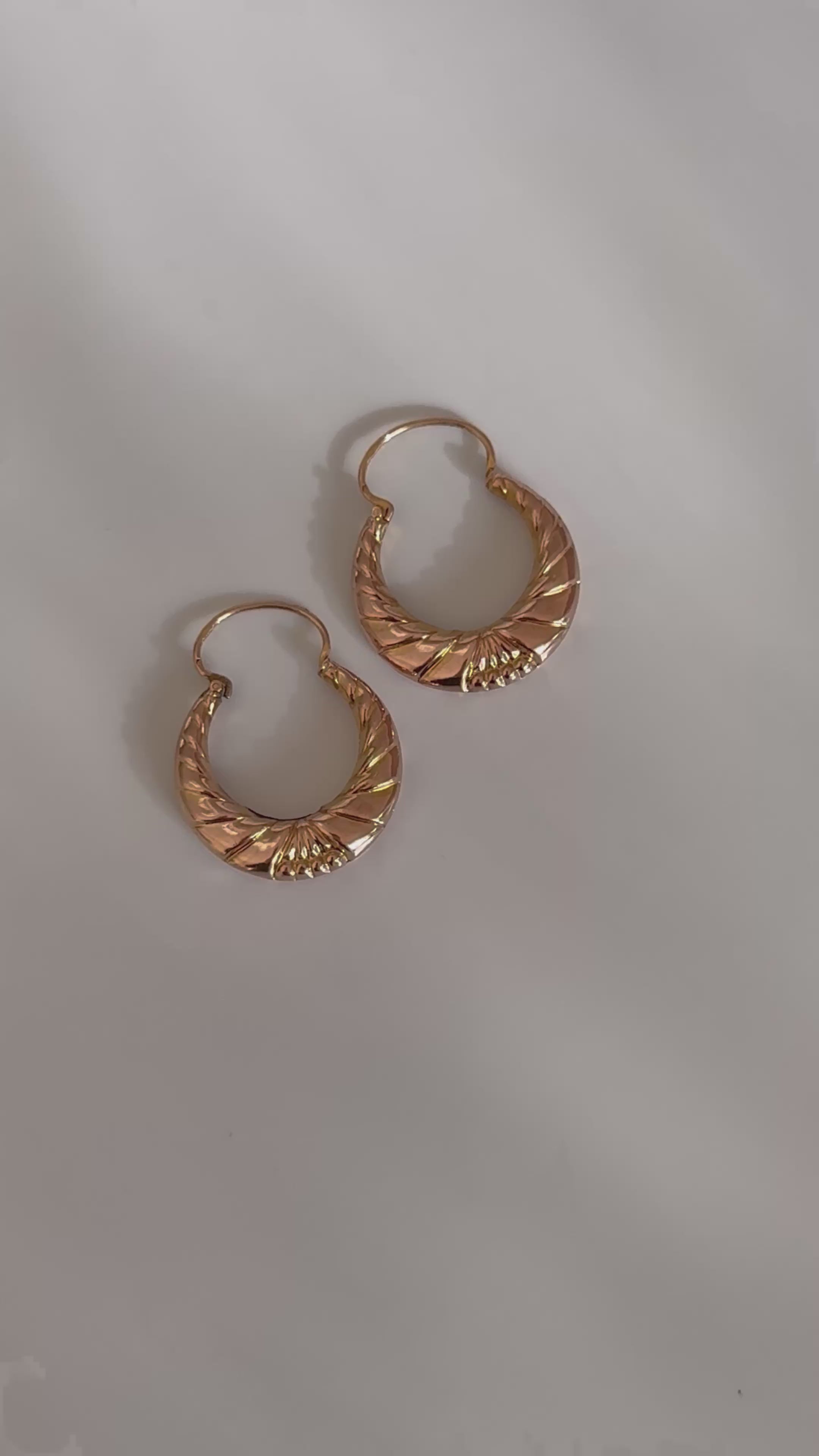 Les créoles vintage or 18 carats Célie évoquent un temps où l’élégance se transmettait par le geste et la matière. Leur forme en demi-lune, délicatement bombée, épouse le lobe avec douceur. Le décor godronné, finement ciselé, capte la lumière avec une vibration subtile — une signature du style art déco, hérité des ateliers des années 60.