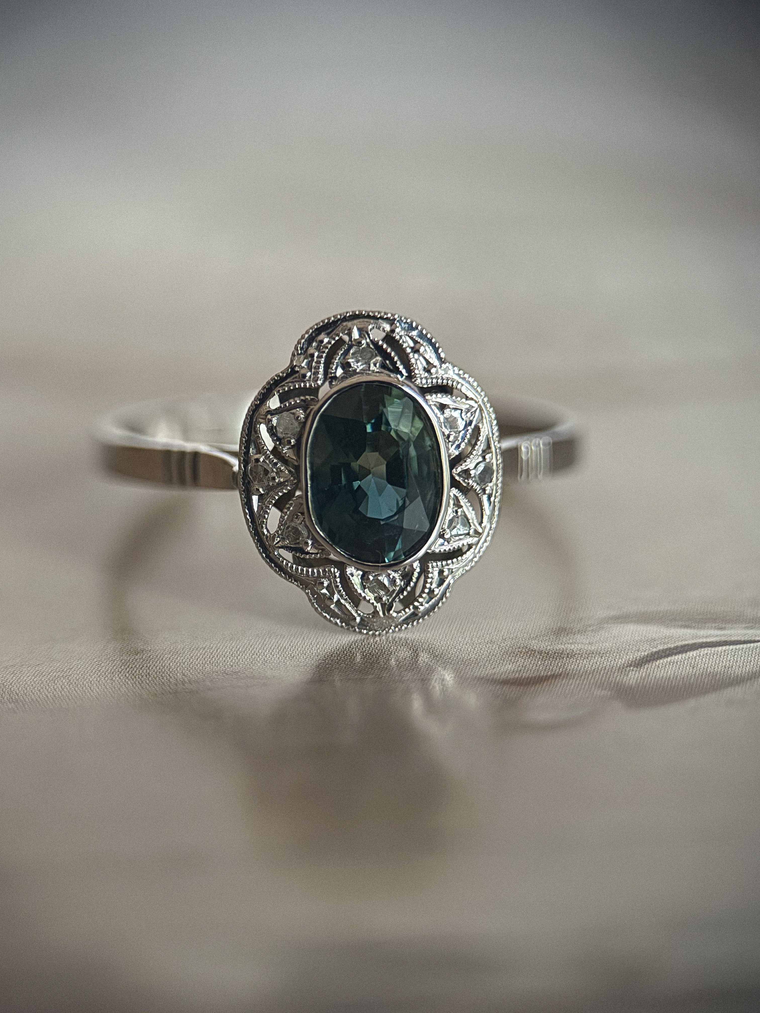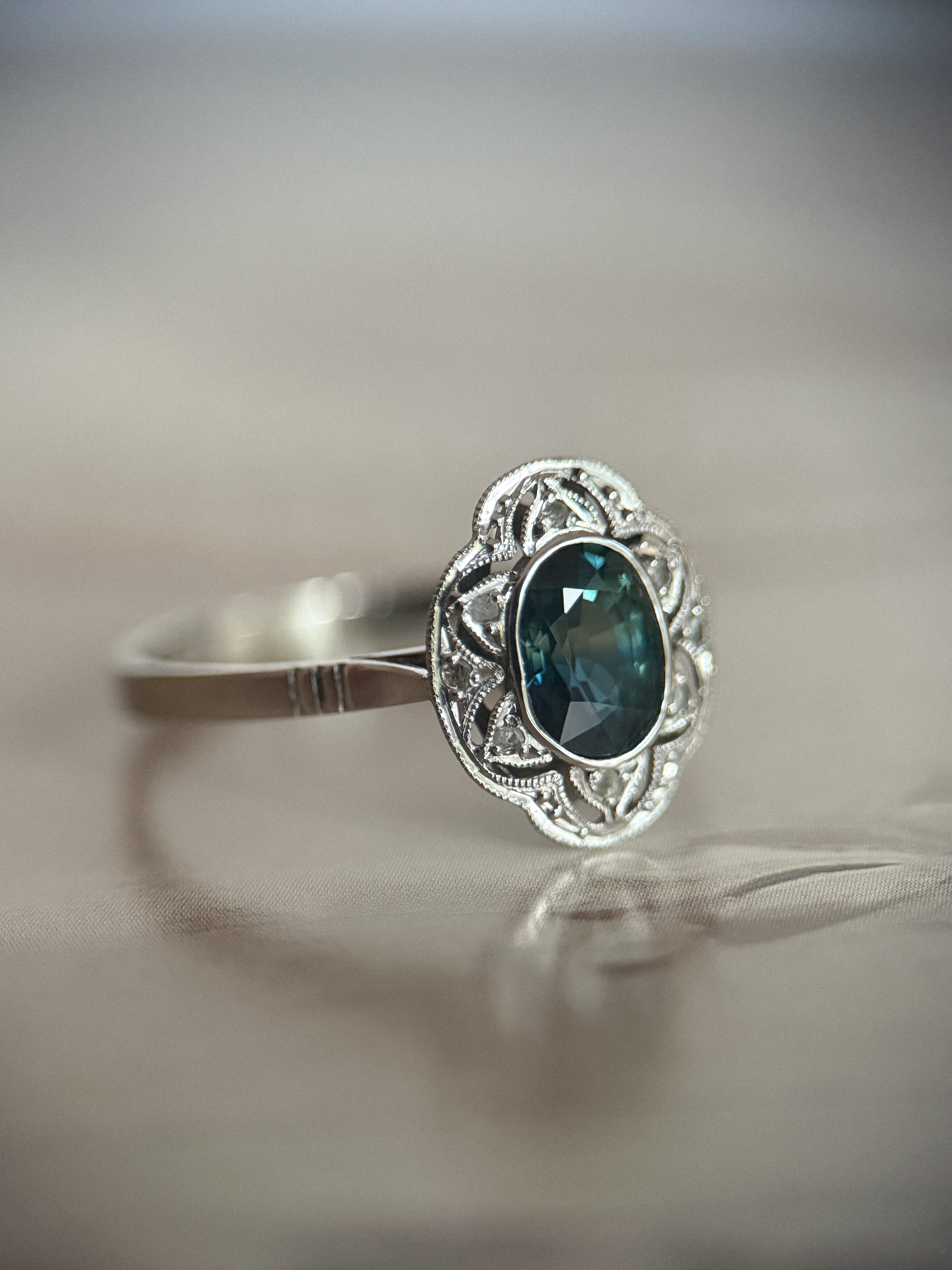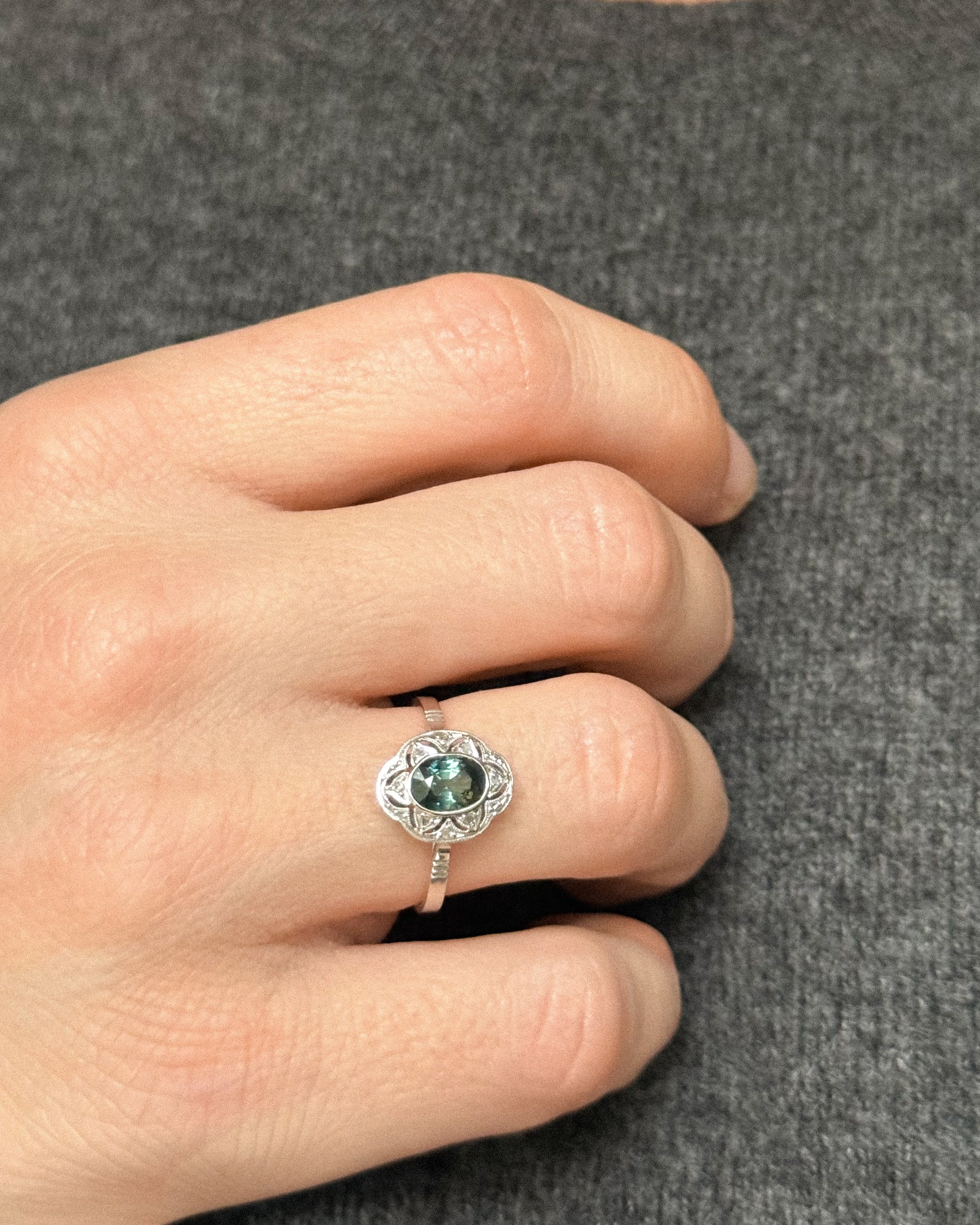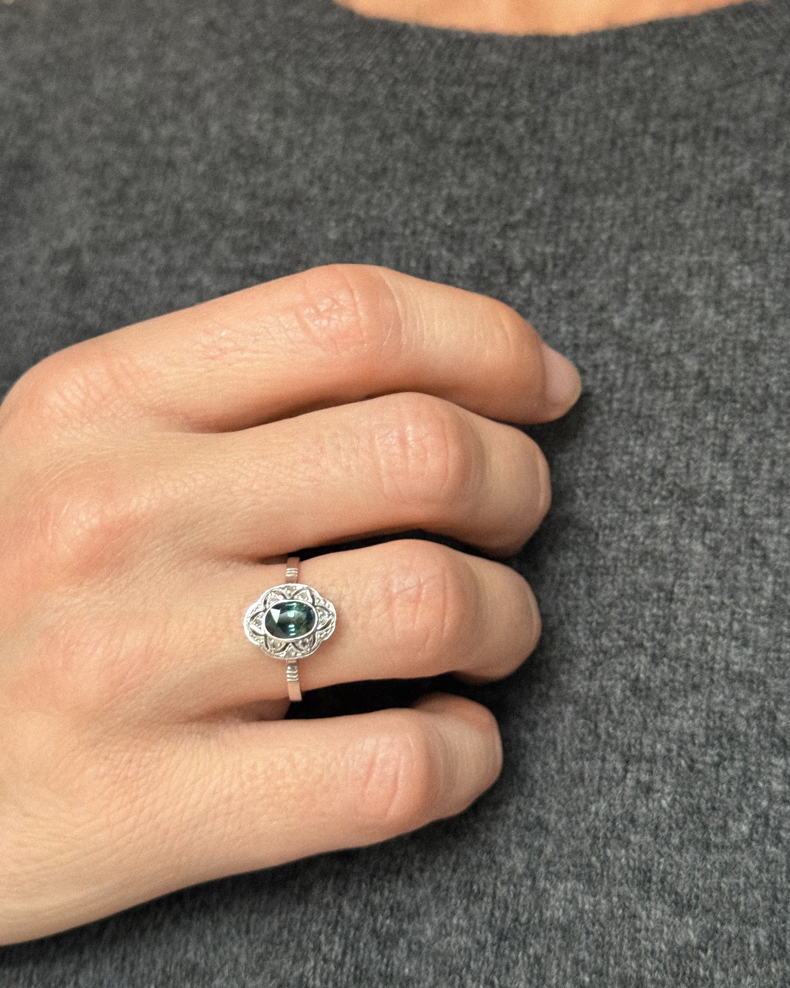 Mais c’est sa renaissance qui fait battre le cœur. Là où brillait autrefois une pierre rouge synthétique, nous avons délicatement serti un sublime saphir teal ovale de 1,01 carat. Cette pierre rare, entre bleu profond et vert intense, joue avec la lumière comme les reflets d’un lagon au crépuscule. Un effet presque hypnotique, rendu possible par les nuances naturelles du saphir teal, gemme encore confidentielle mais follement désirable.