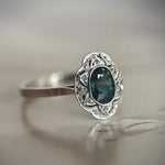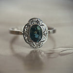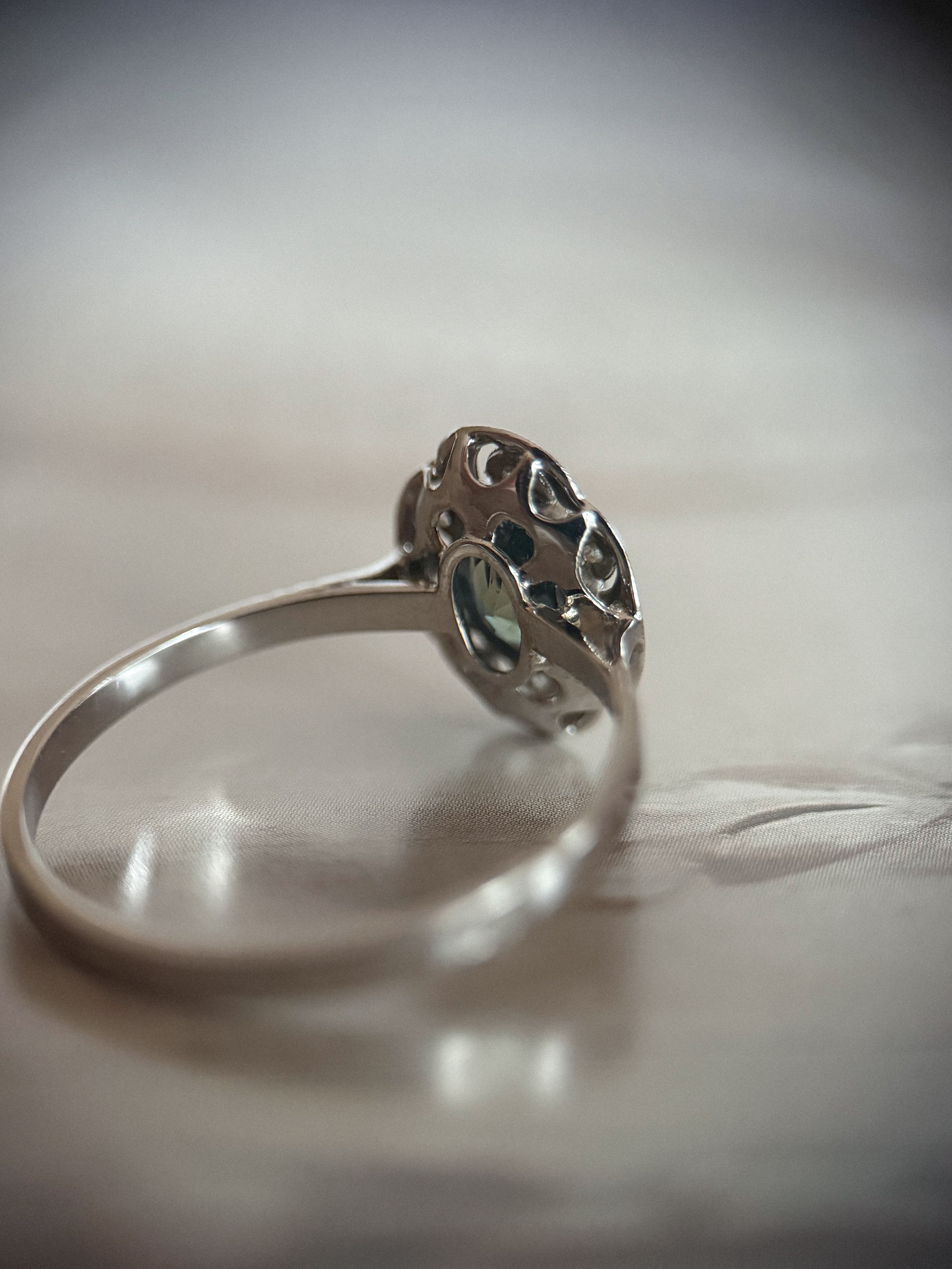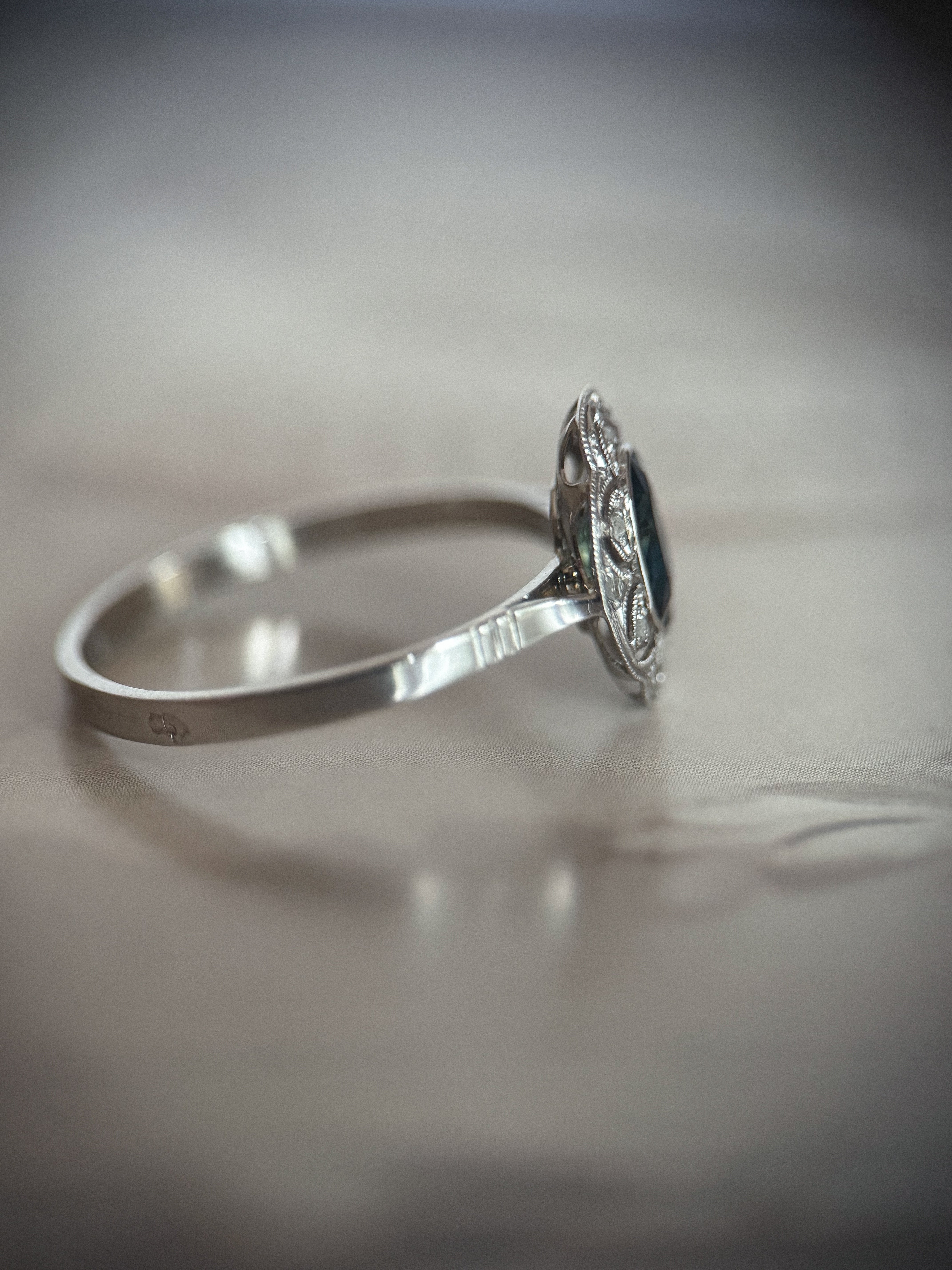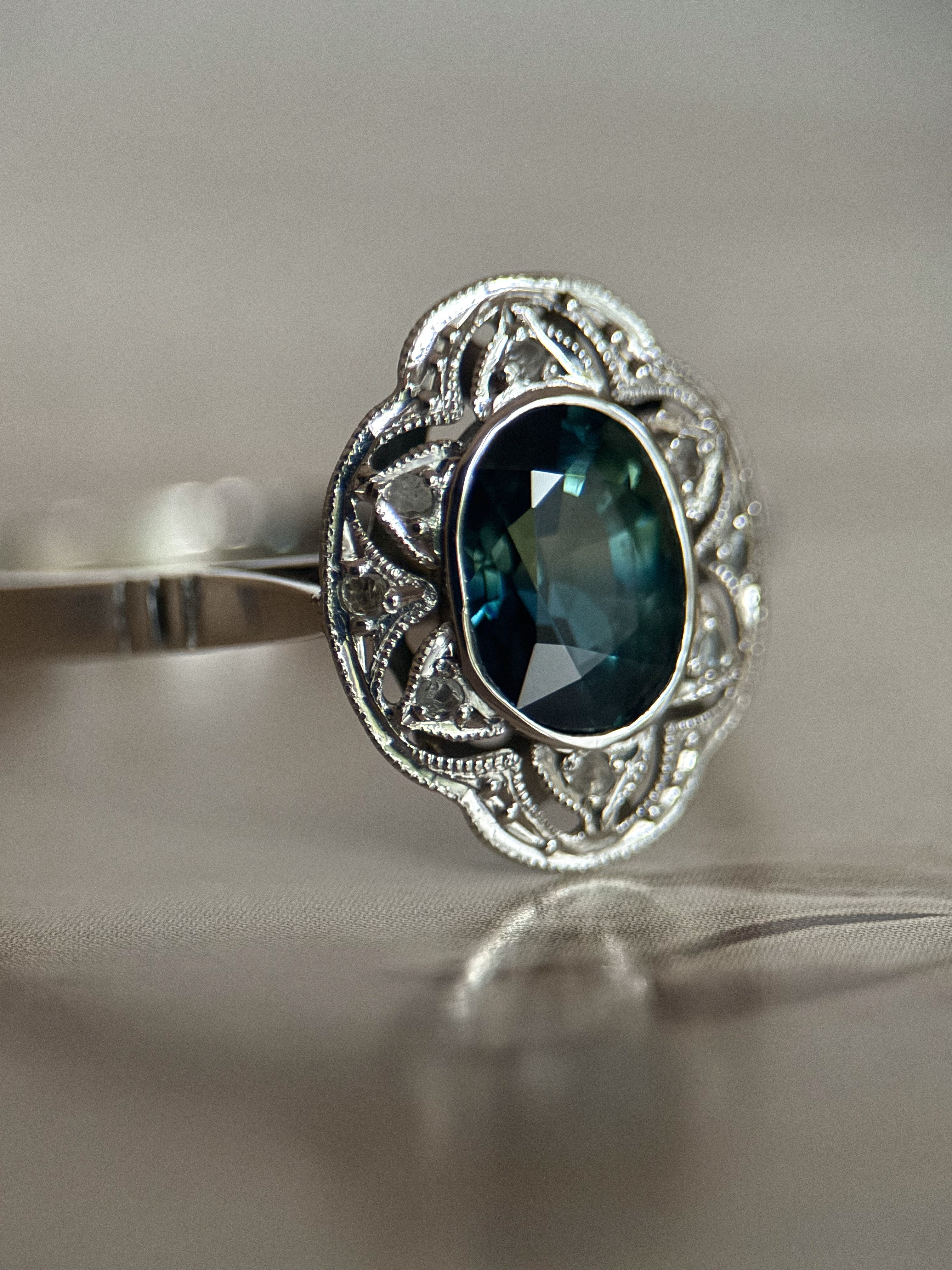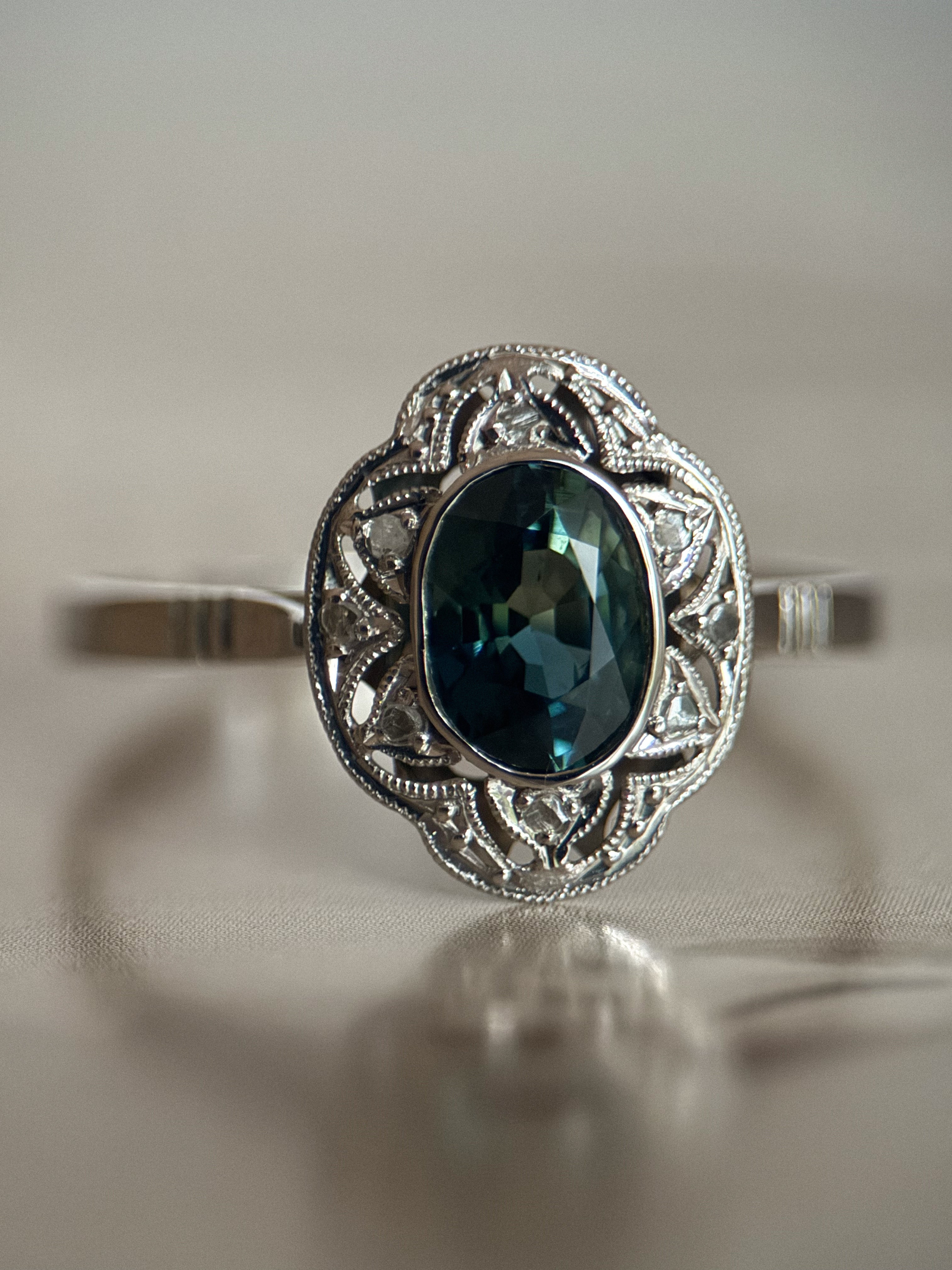 Mais c’est sa renaissance qui fait battre le cœur. Là où brillait autrefois une pierre rouge synthétique, nous avons délicatement serti un sublime saphir teal ovale de 1,01 carat. Cette pierre rare, entre bleu profond et vert intense, joue avec la lumière comme les reflets d’un lagon au crépuscule. Un effet presque hypnotique, rendu possible par les nuances naturelles du saphir teal, gemme encore confidentielle mais follement désirable.