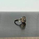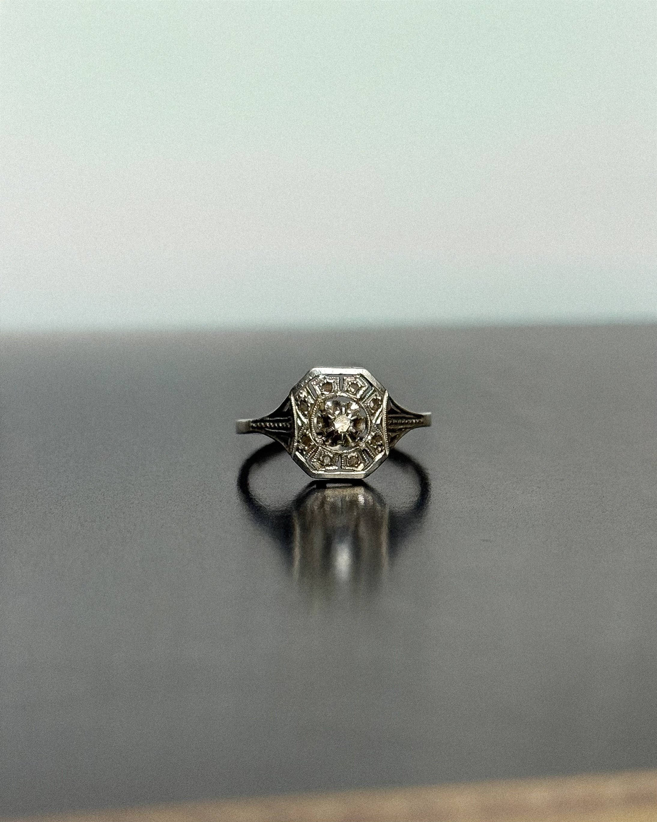 Tout dans cette bague art déco diamant évoque le dialogue entre structure et lumière. Créée dans un atelier français au cœur des années 30, la bague Alma s’inscrit dans la pure tradition du bijou époque art déco. Sa monture ajourée en or blanc 18 carats et platine élève la pierre centrale, un diamant taille 8/8 monté en griffes, pour en libérer l’éclat. L’entourage de diamants taille rose, choisis pour leur scintillement discret, compose un halo minéral d’une élégance rare.