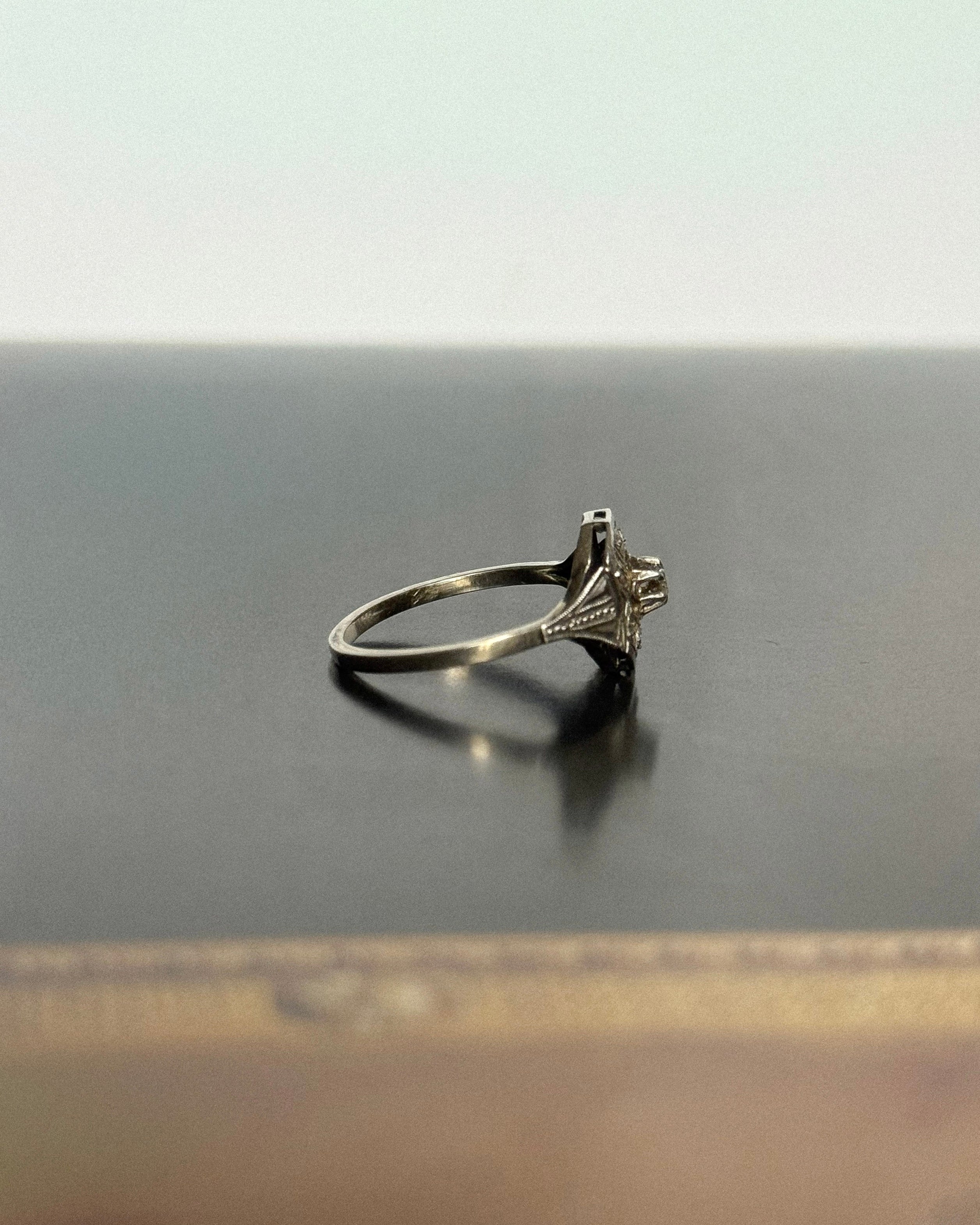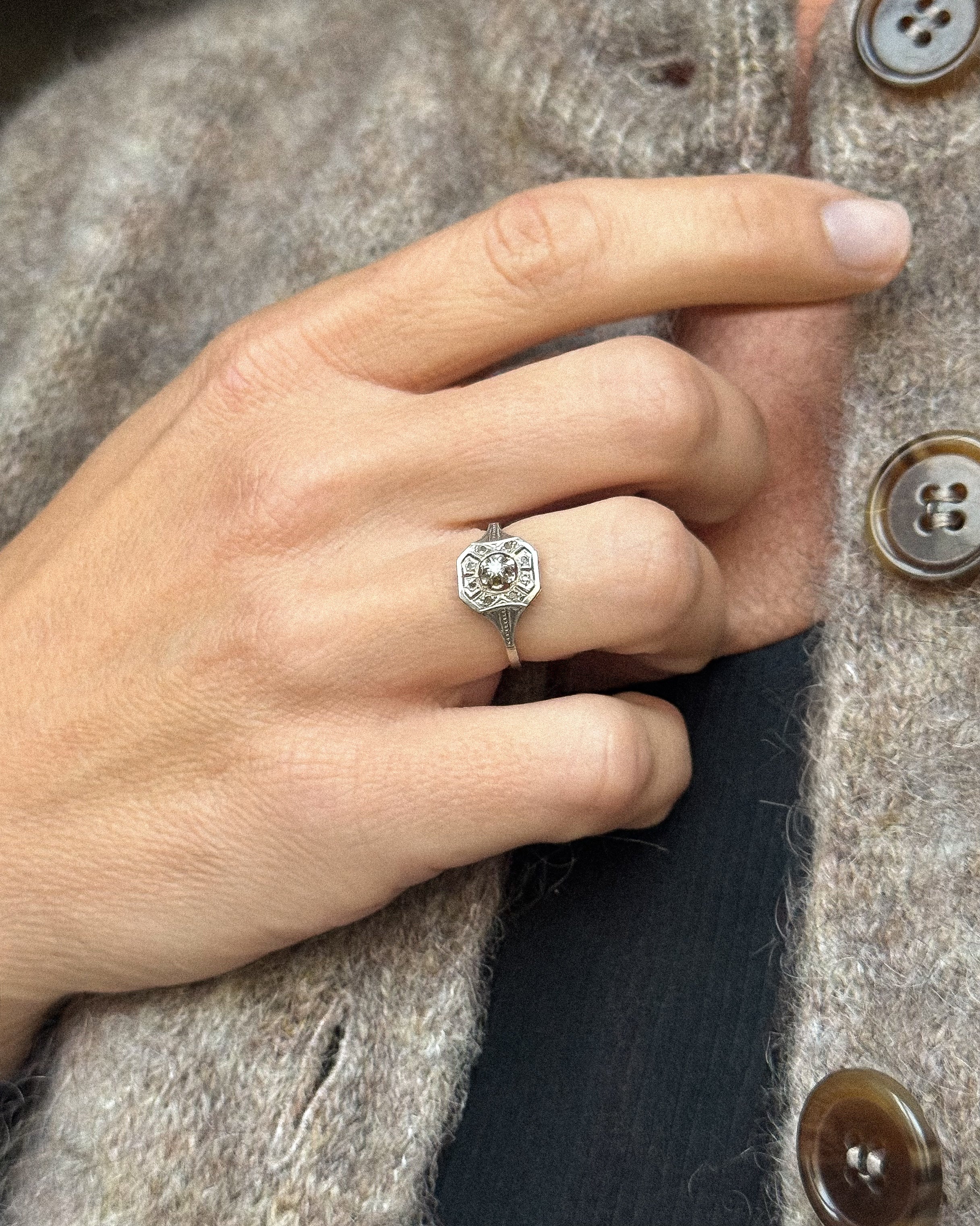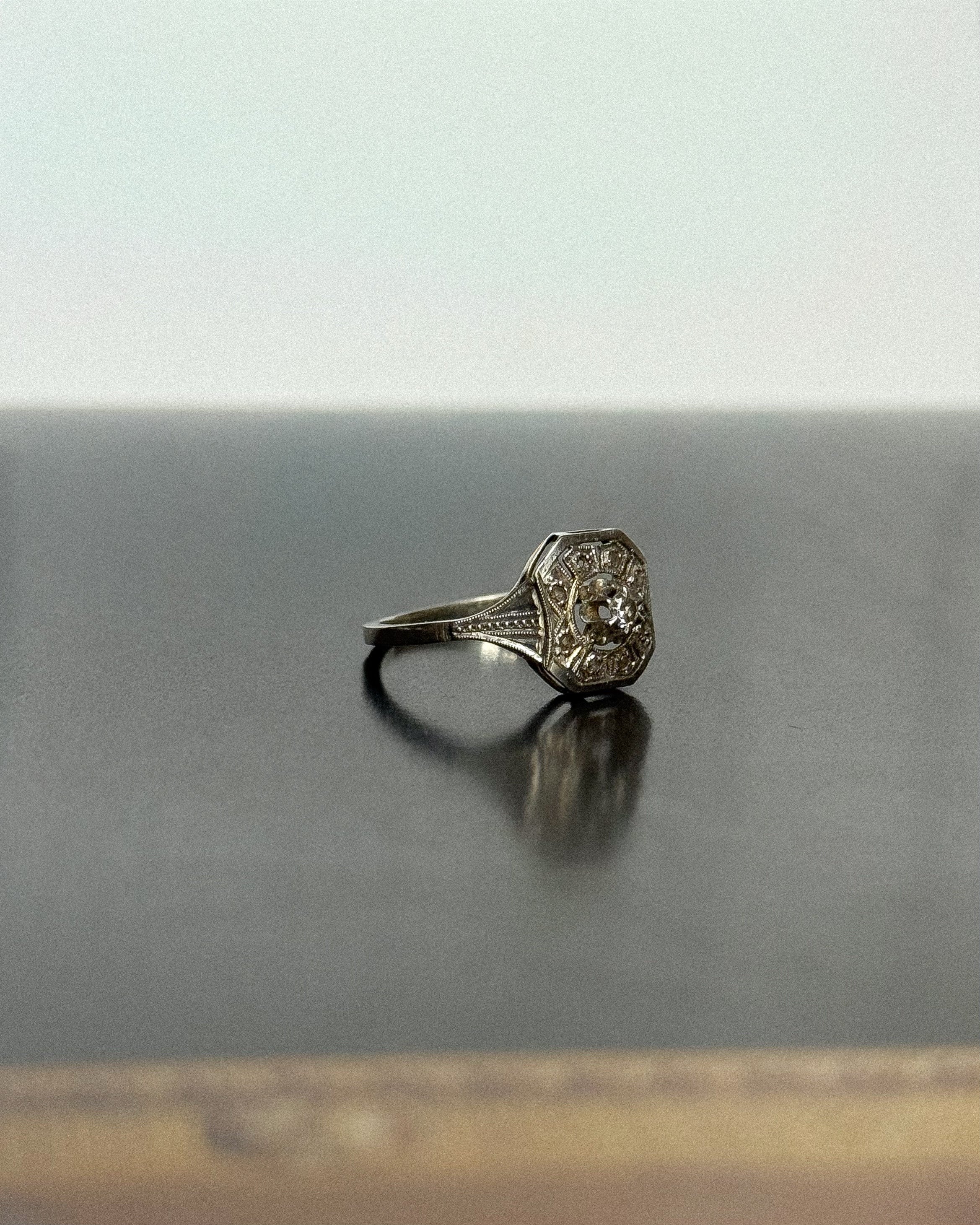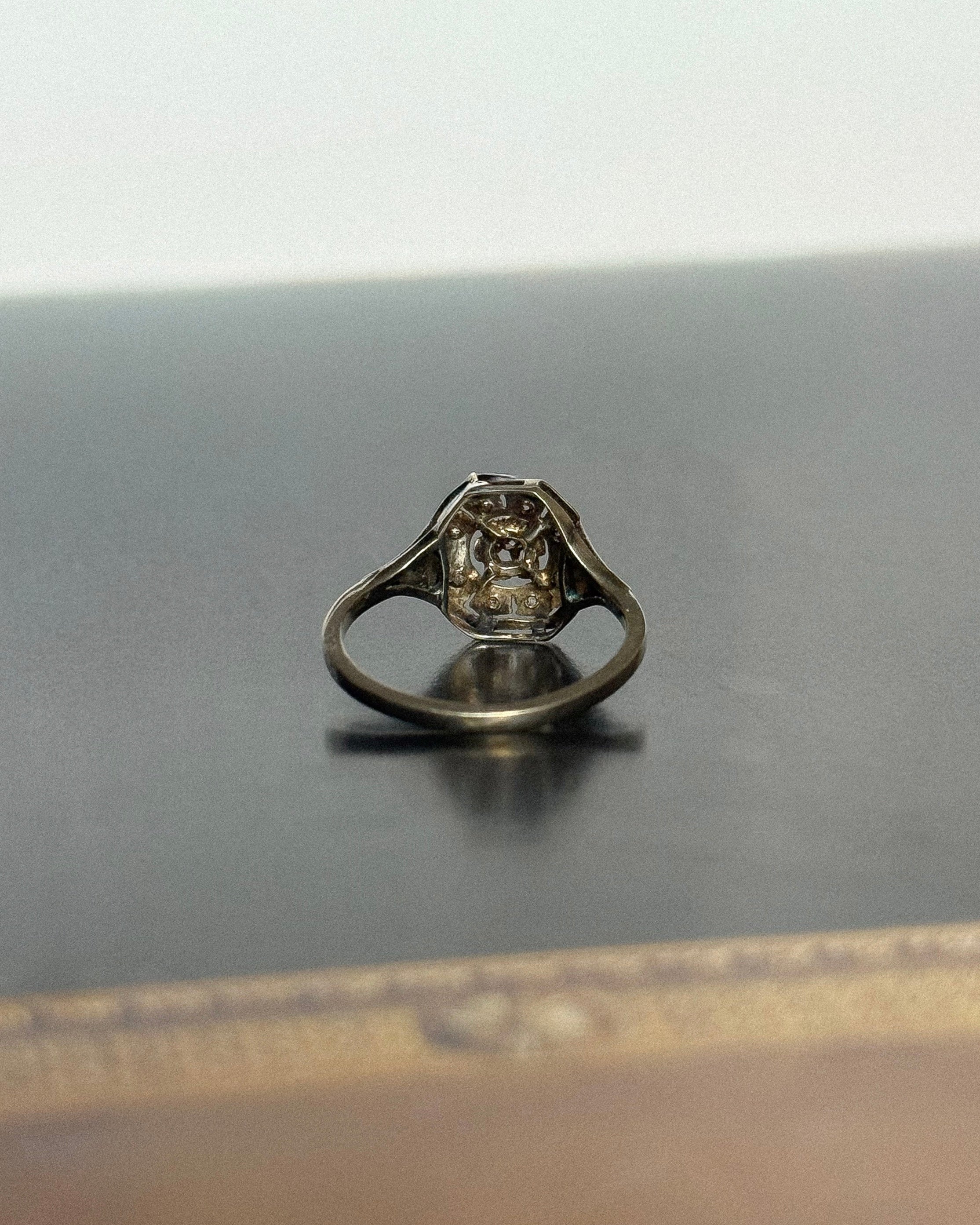 Chaque détail est pensé pour capter la lumière sans ostentation. Le platine affine les lignes, le serti grains ancien joue avec les ombres, et l’ensemble semble respirer. Cette bague française vintage ne cherche pas à impressionner : elle séduit par sa grâce silencieuse, par sa modernité restée intacte.