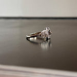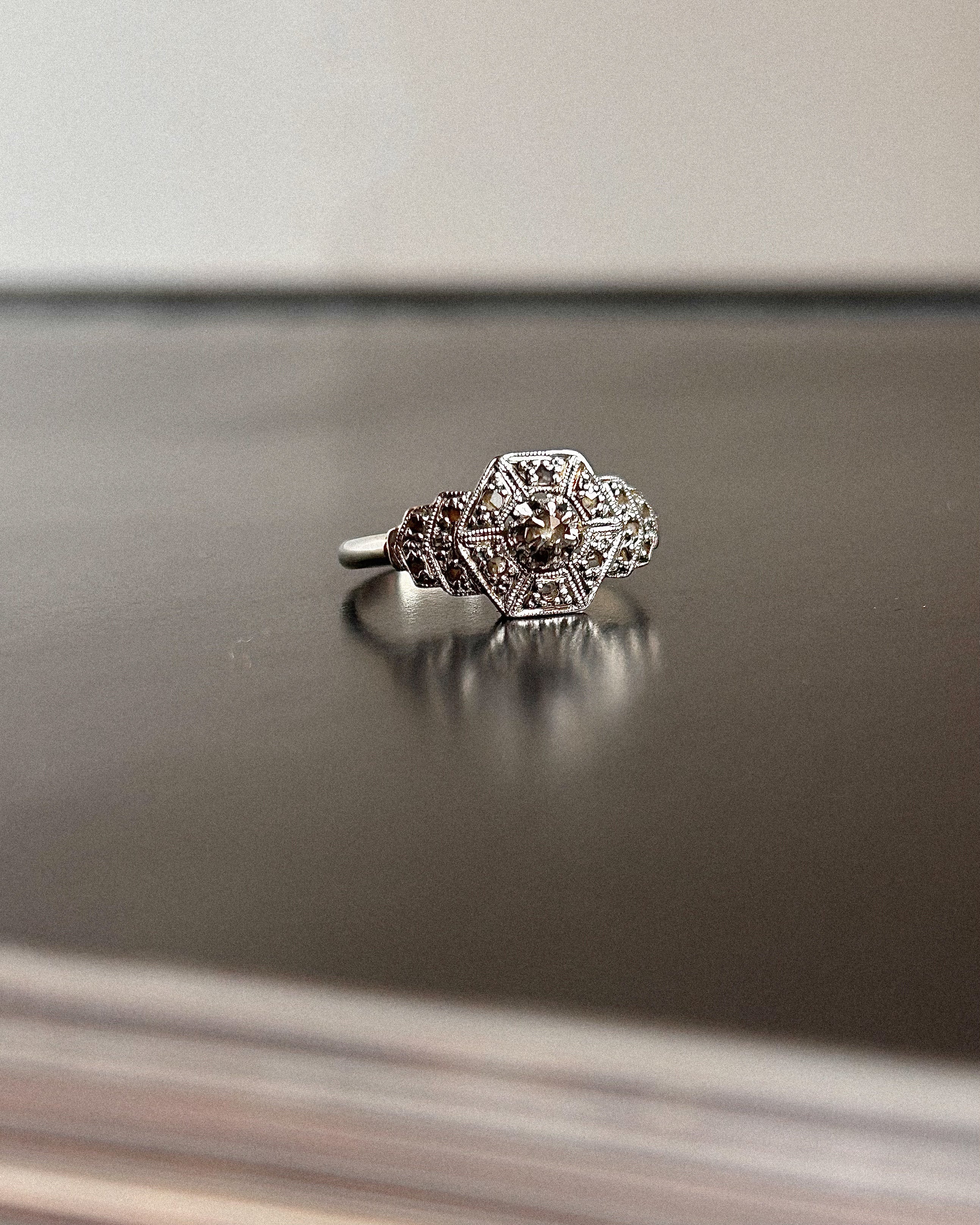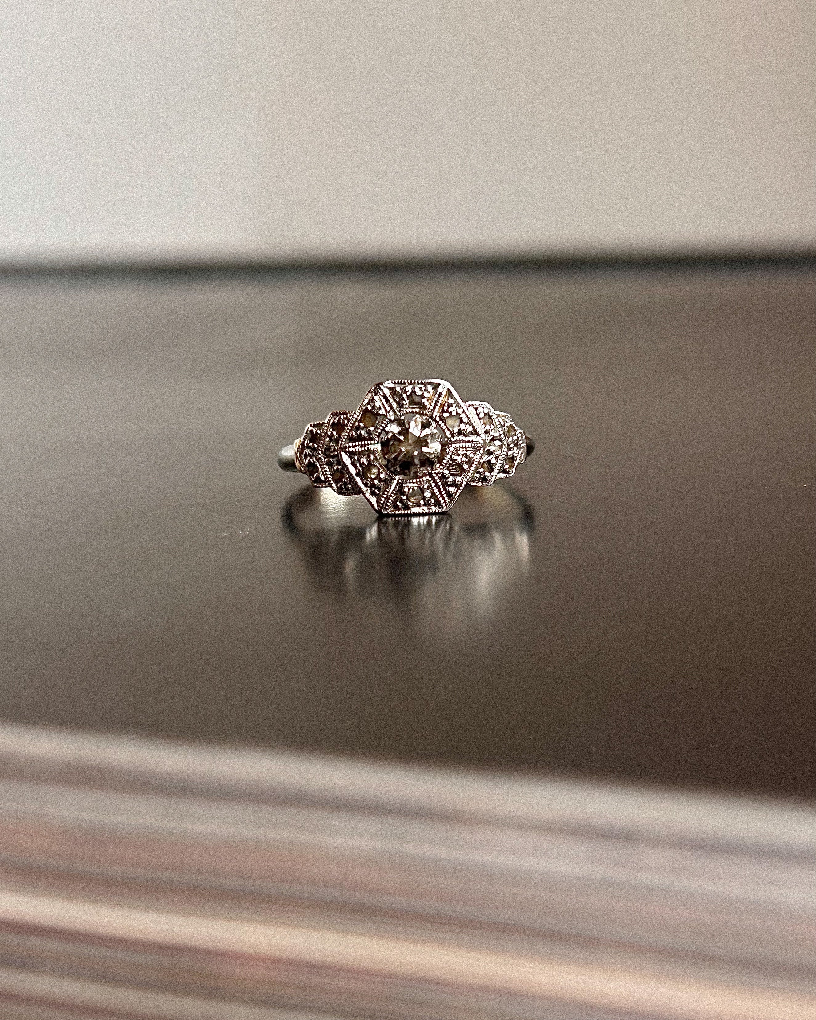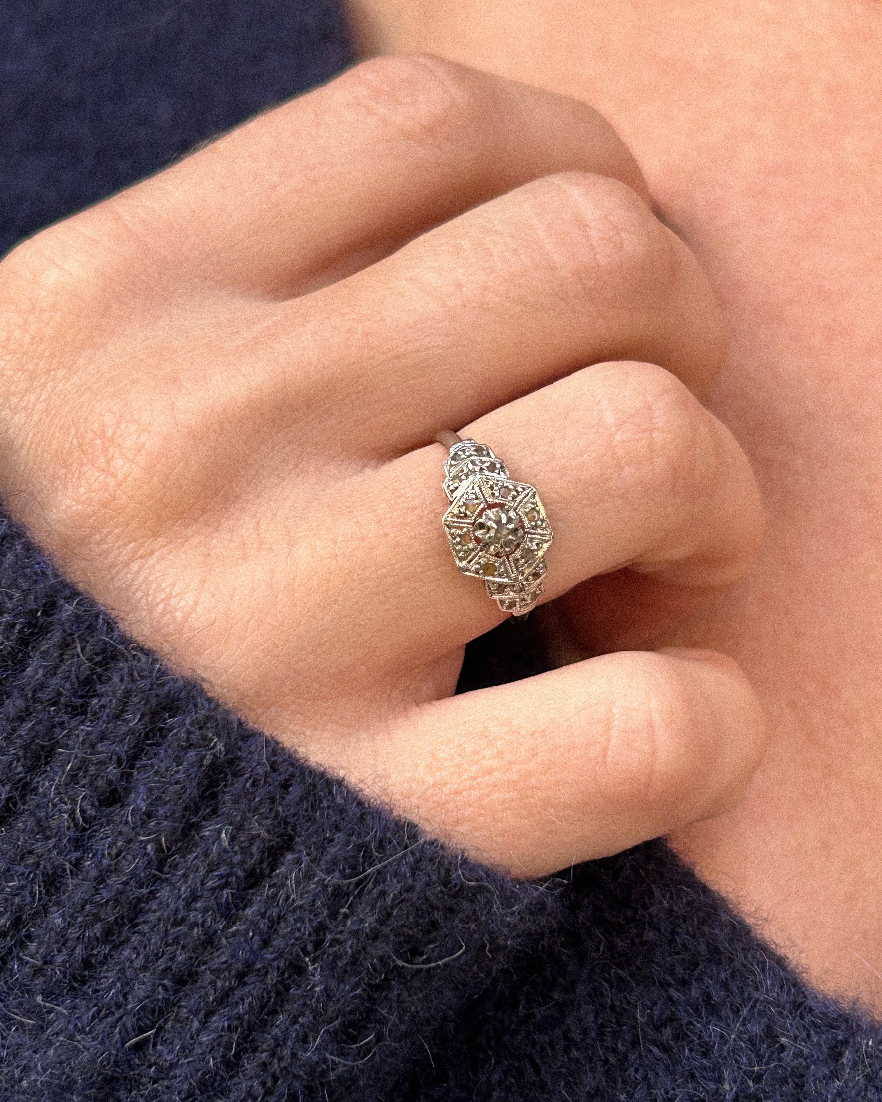 Amiel est une bague des années 1930 en or blanc 18 carats. Son plateau de forme octogonale est serti de diamants rosecut, souligné de sertis millegrains qui apportent beaucoup de délicatesse à ce bijou. Charmante, elle se pare également de deux niveaux de gradins aux abords de l'anneau, un design typique de l'époque Art Déco !