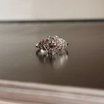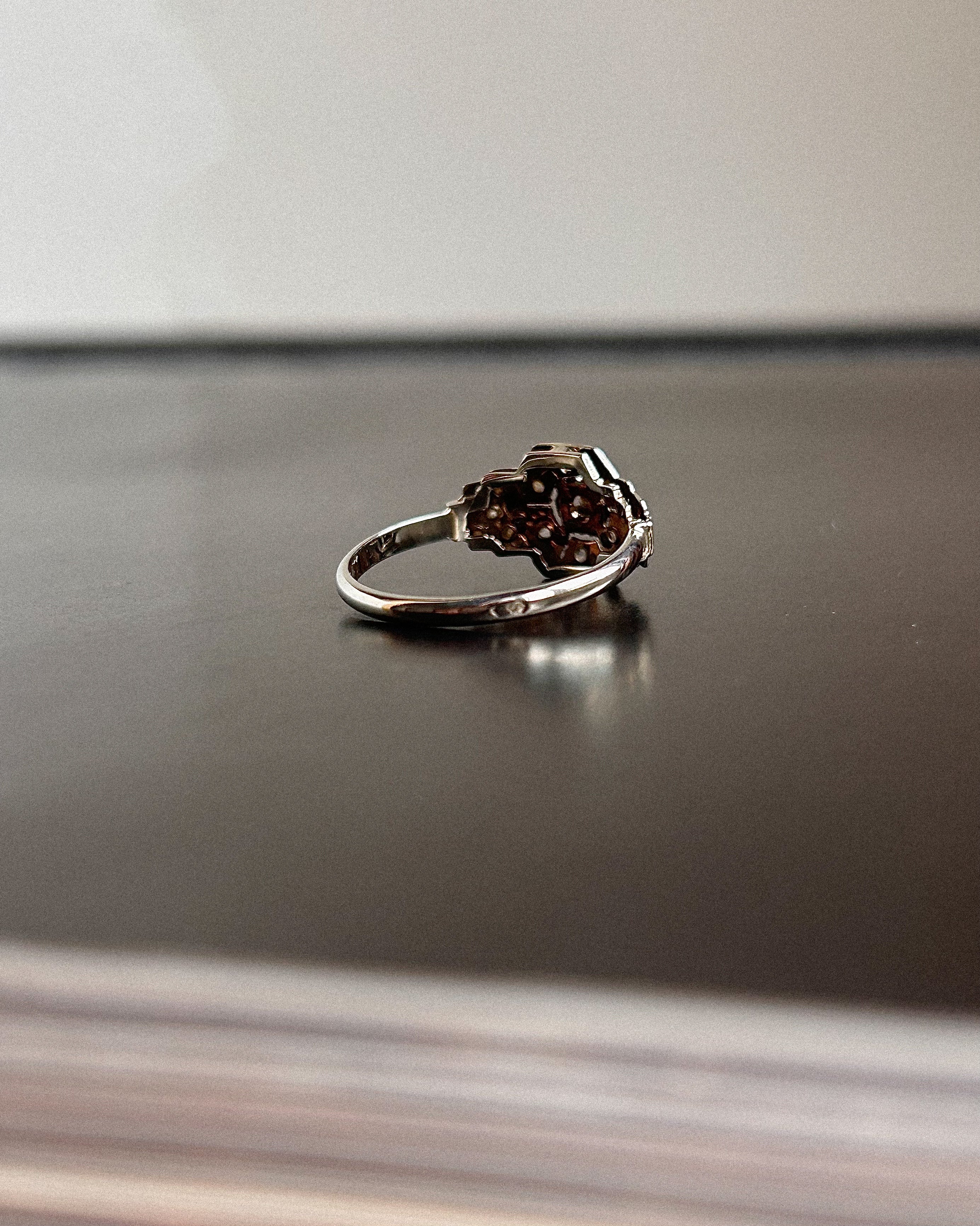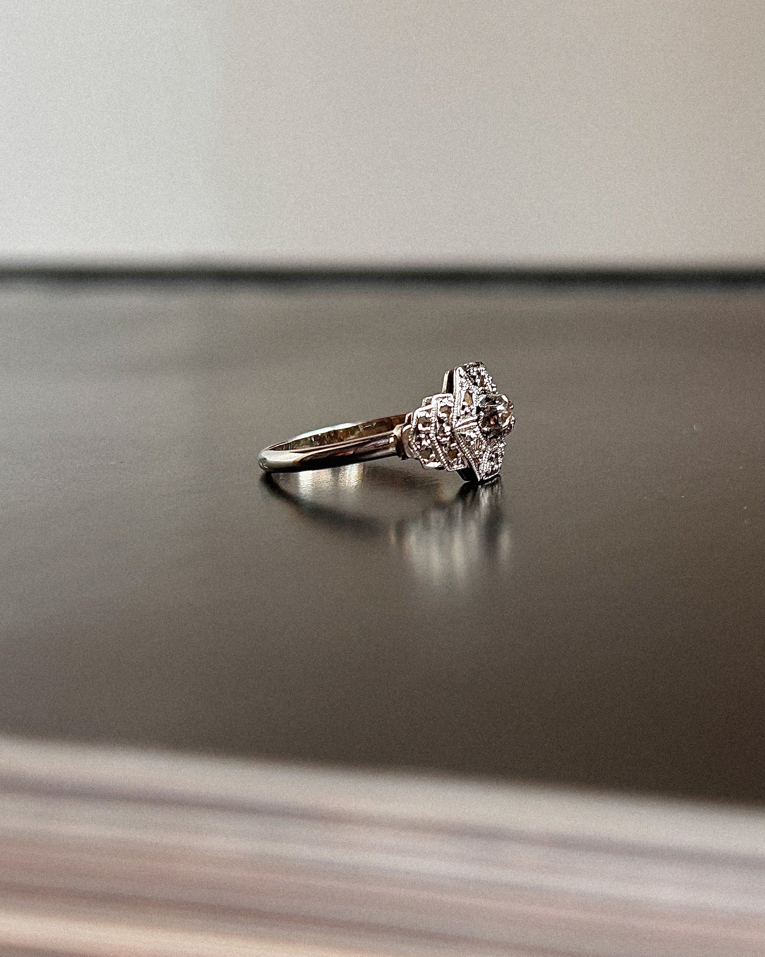 Cette bague est emblématique de l'époque Art Déco avec son plateau octogonal et ses deux niveaux de gradins. Serties de petits diamants, elle crée un effet wahou, sans trop en faire. On craque pour la délicatesse du millegrains, présent partout sur ce bijou vintage !