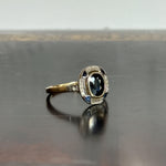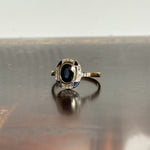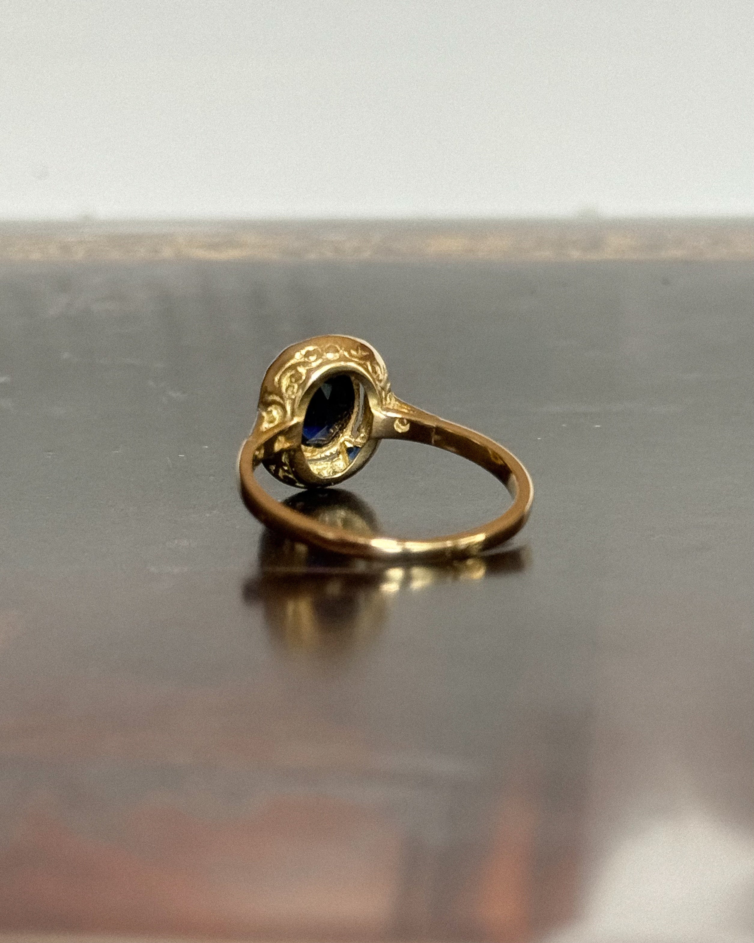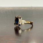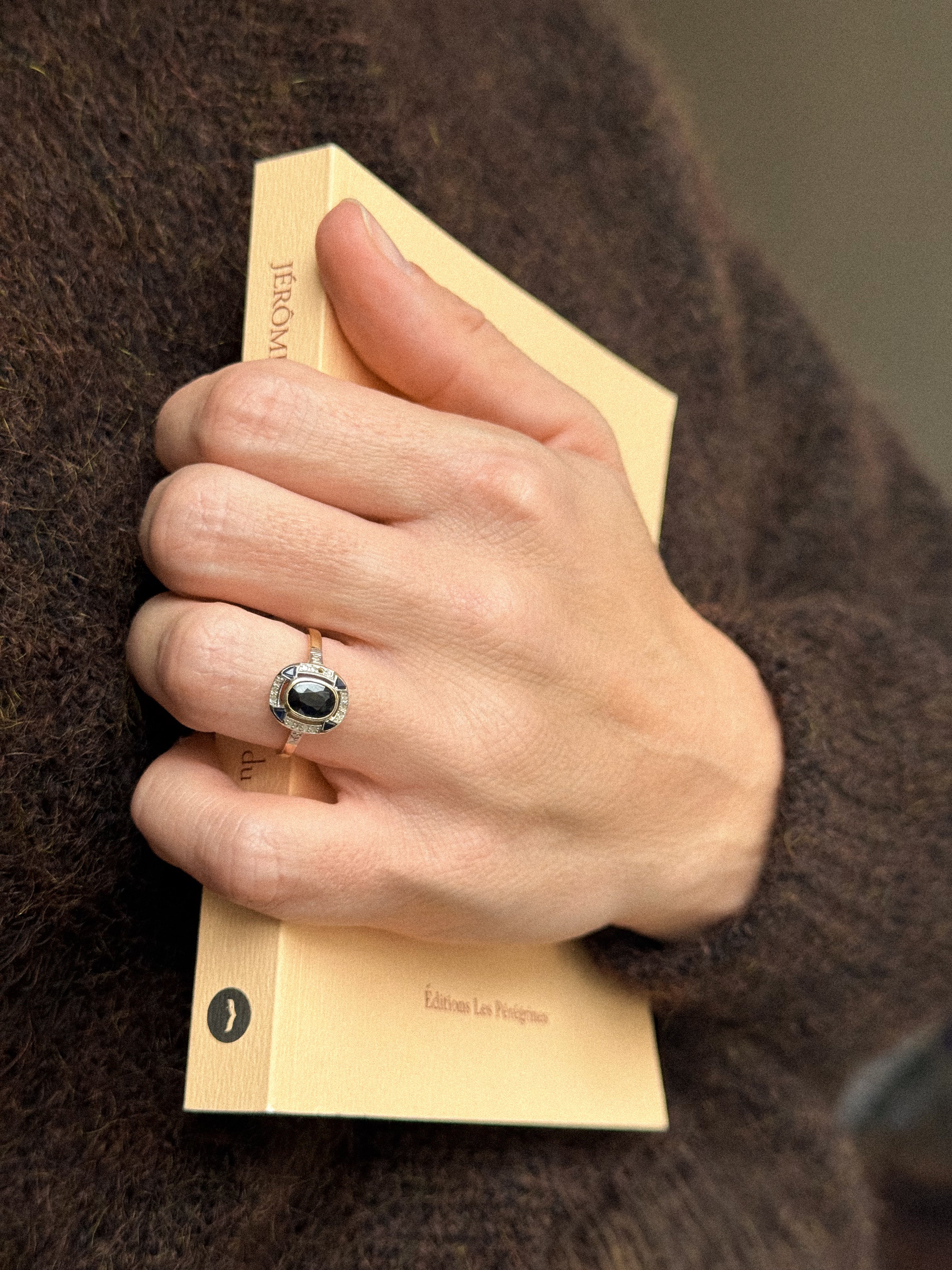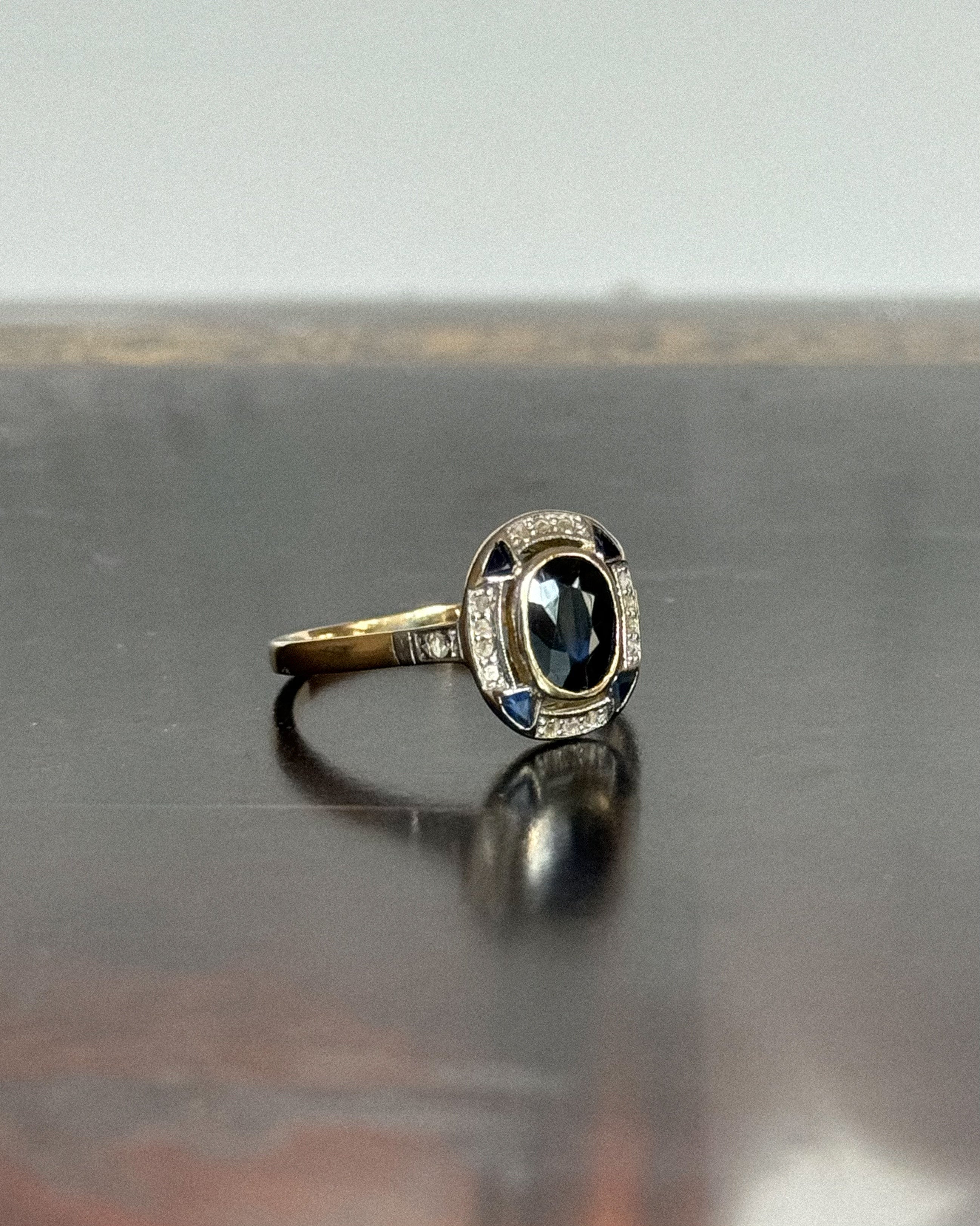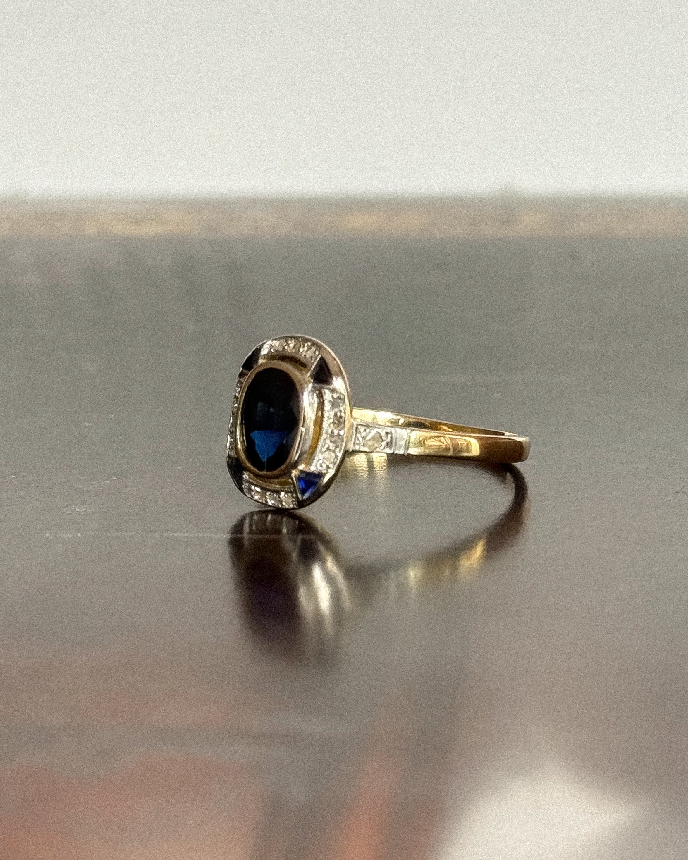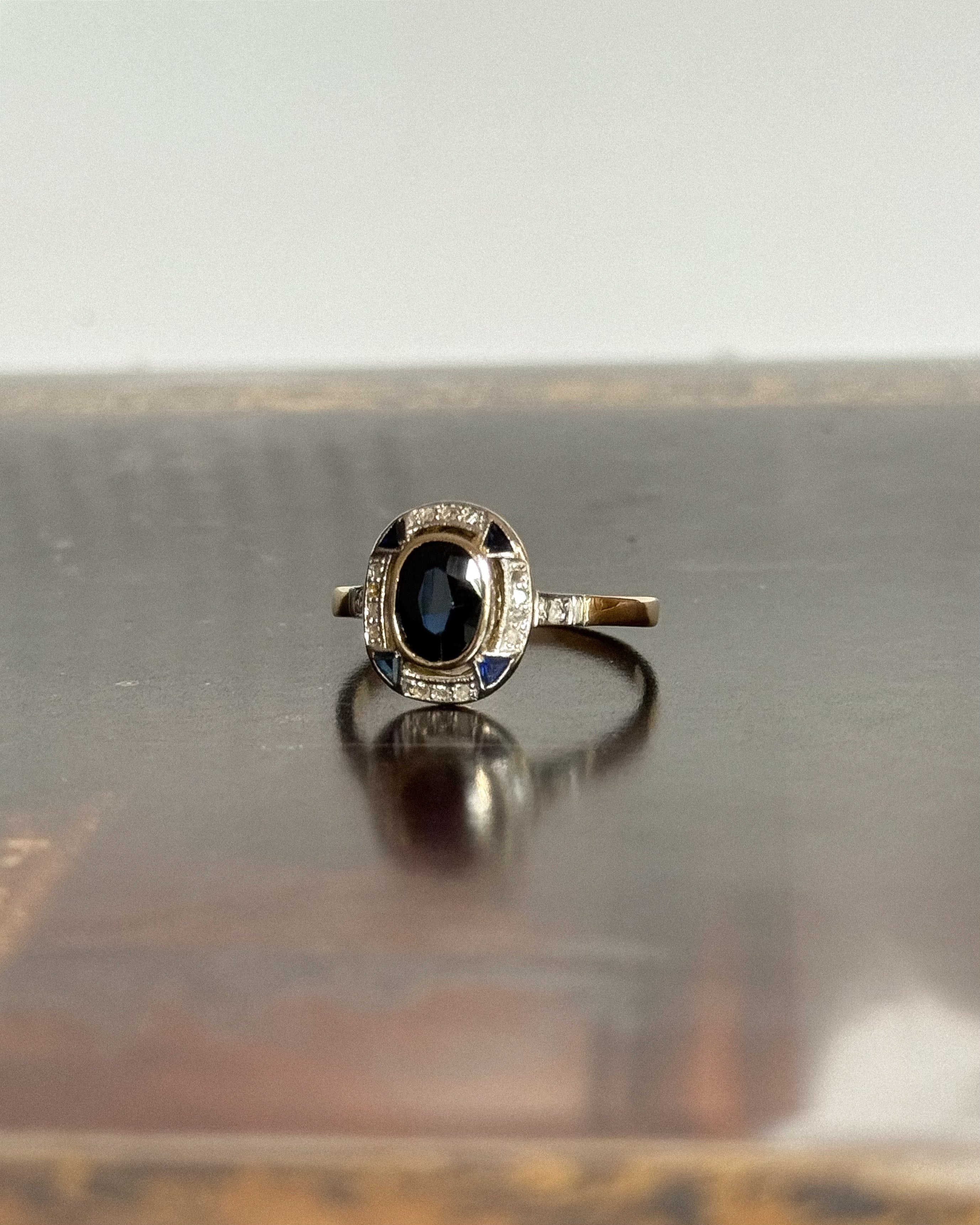 Avec son allure sculpturale et son design ciselé, la bague art déco saphir Batilda semble tout droit sortie d’un croquis joaillier des années 1920. Un saphir ovale facetté, serti en clos, trône au centre de son plateau ovale, souligné par un ensemble rythmé de diamants taille rose et de petits saphirs angulaires.
