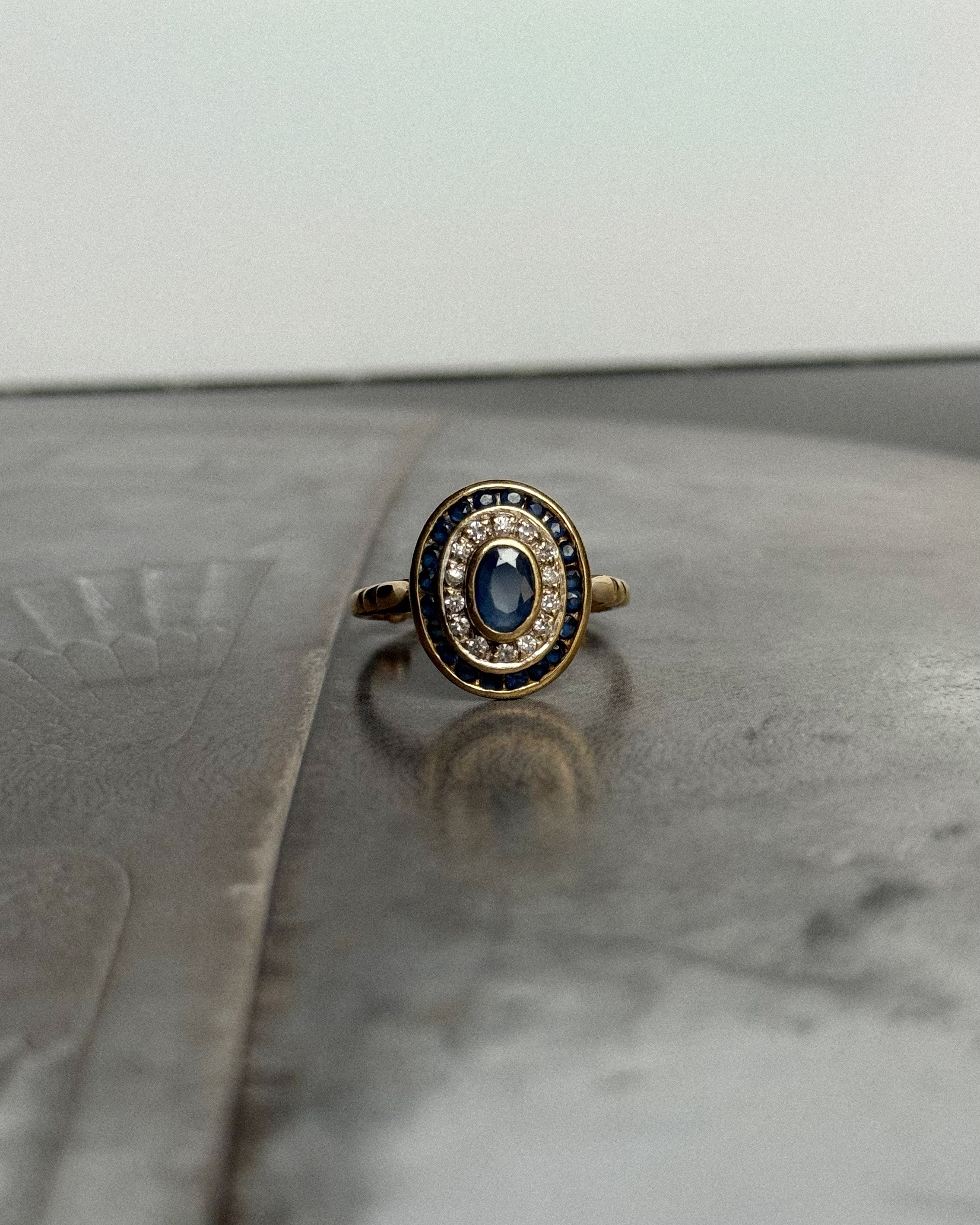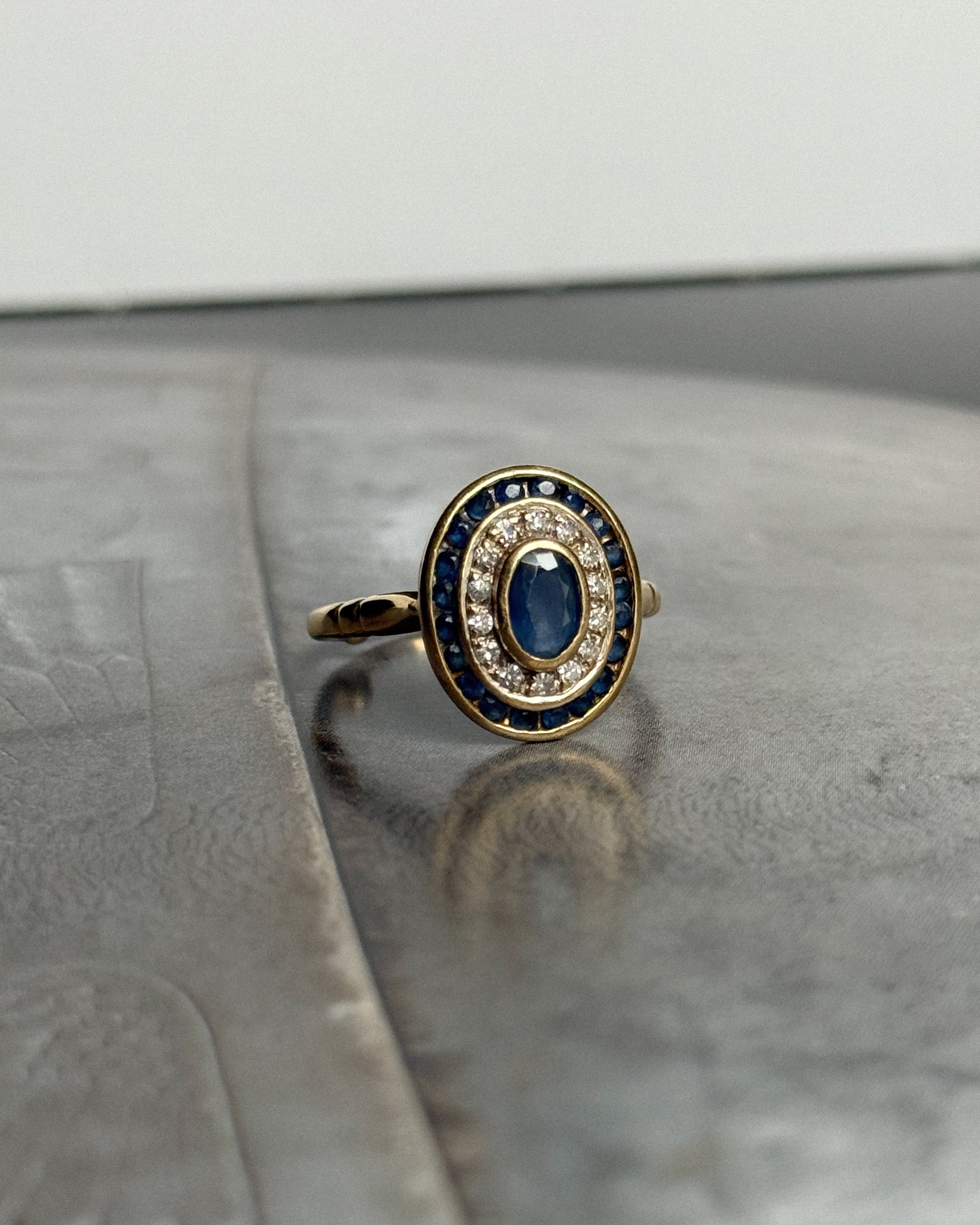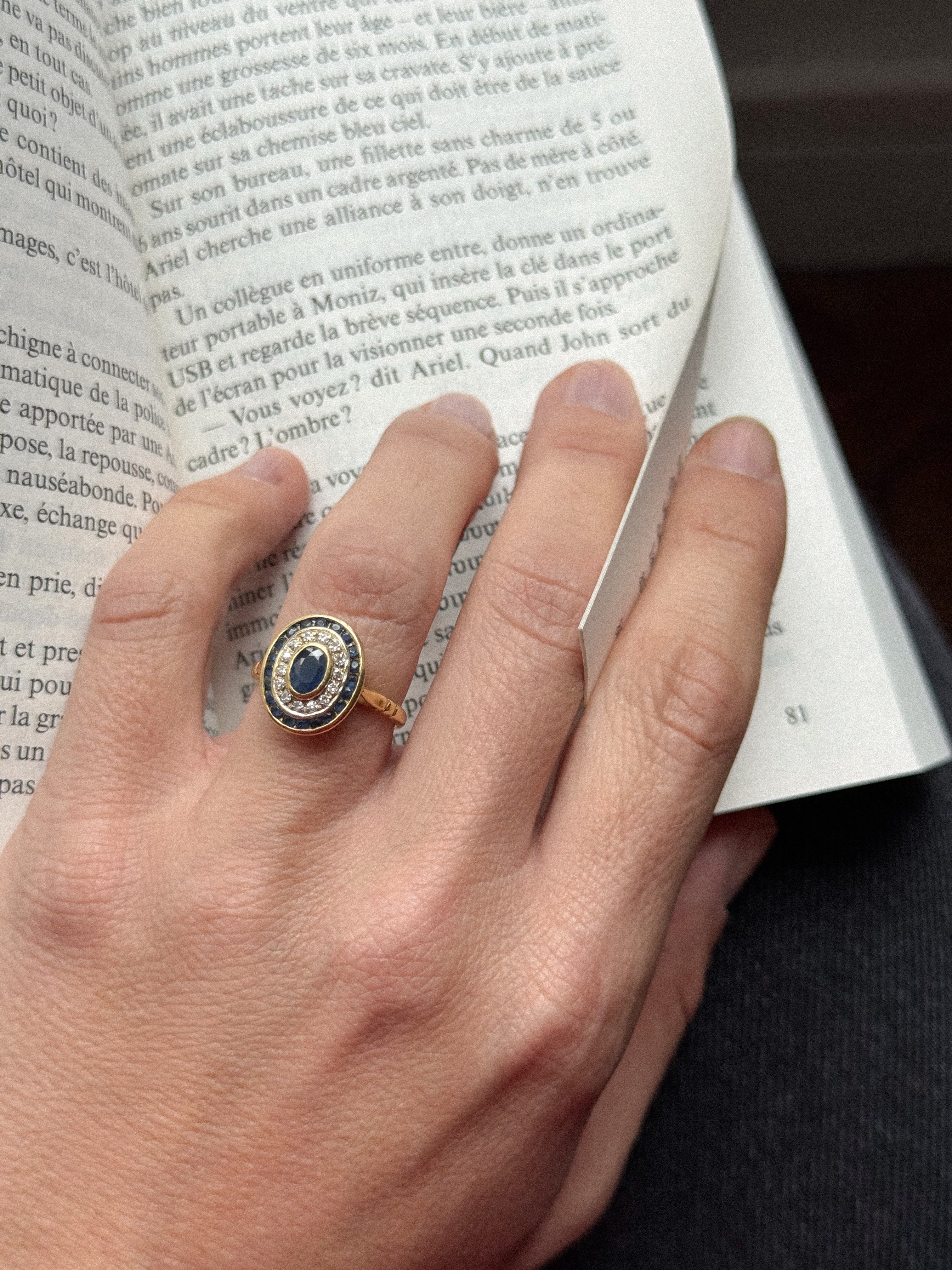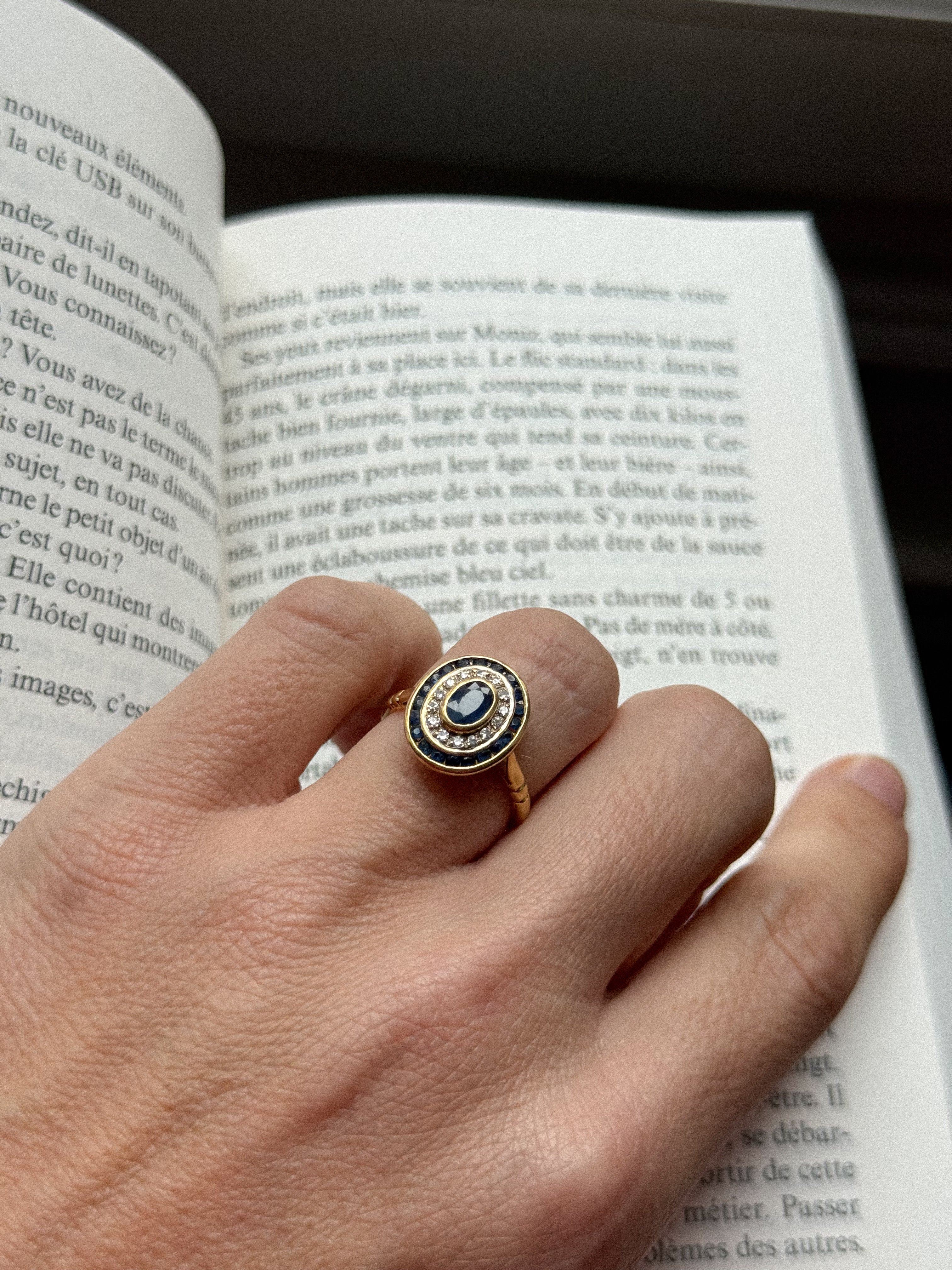 Réalisée en or jaune 18 carats, la bague Bertille est une bague saphir et diamants vintage qui revisite avec grâce le design emblématique des bagues cible anciennes, dans un esprit Art Déco aux lignes pures et assumées. Son plateau ovale, composé sur trois niveaux délicatement structurés, s’organise autour d’un saphir ovale facetté, serti clos, dont l’éclat profond capte la lumière avec douceur.