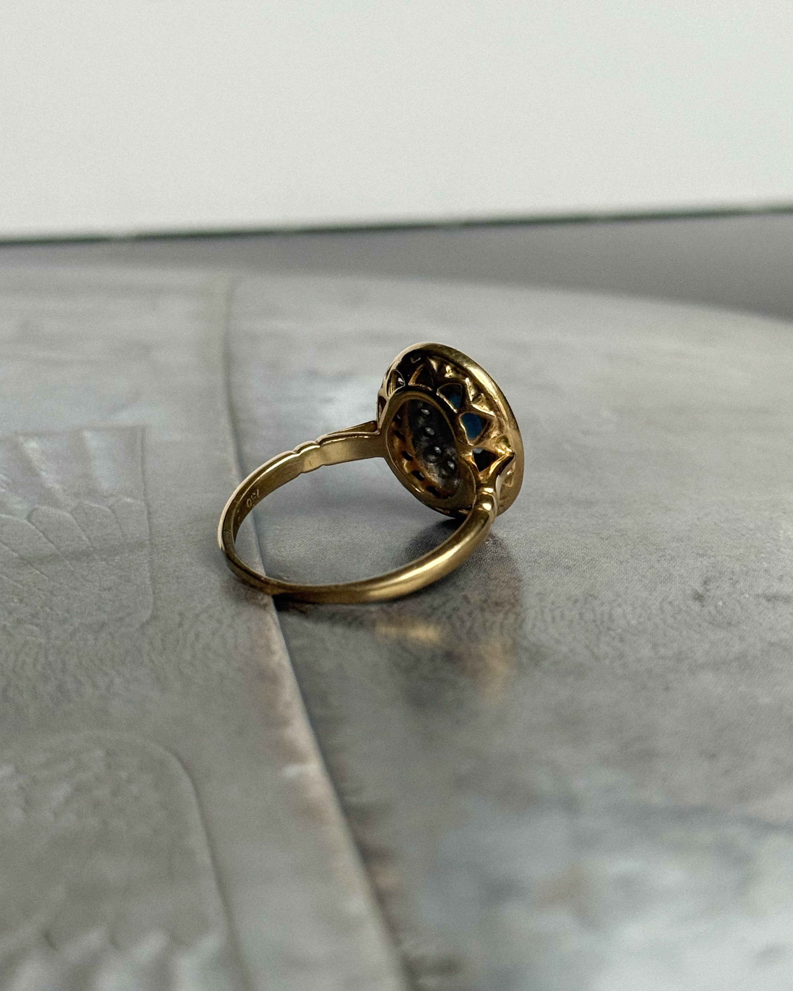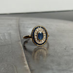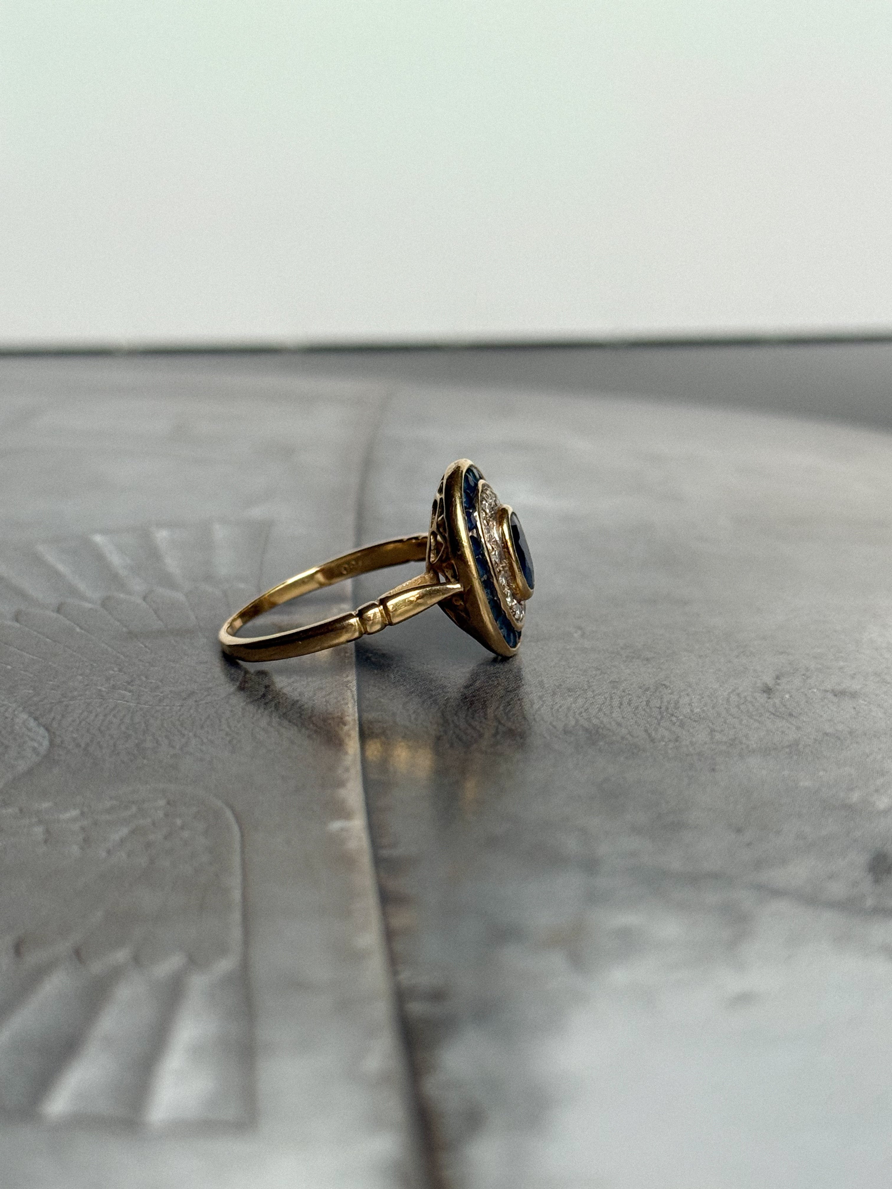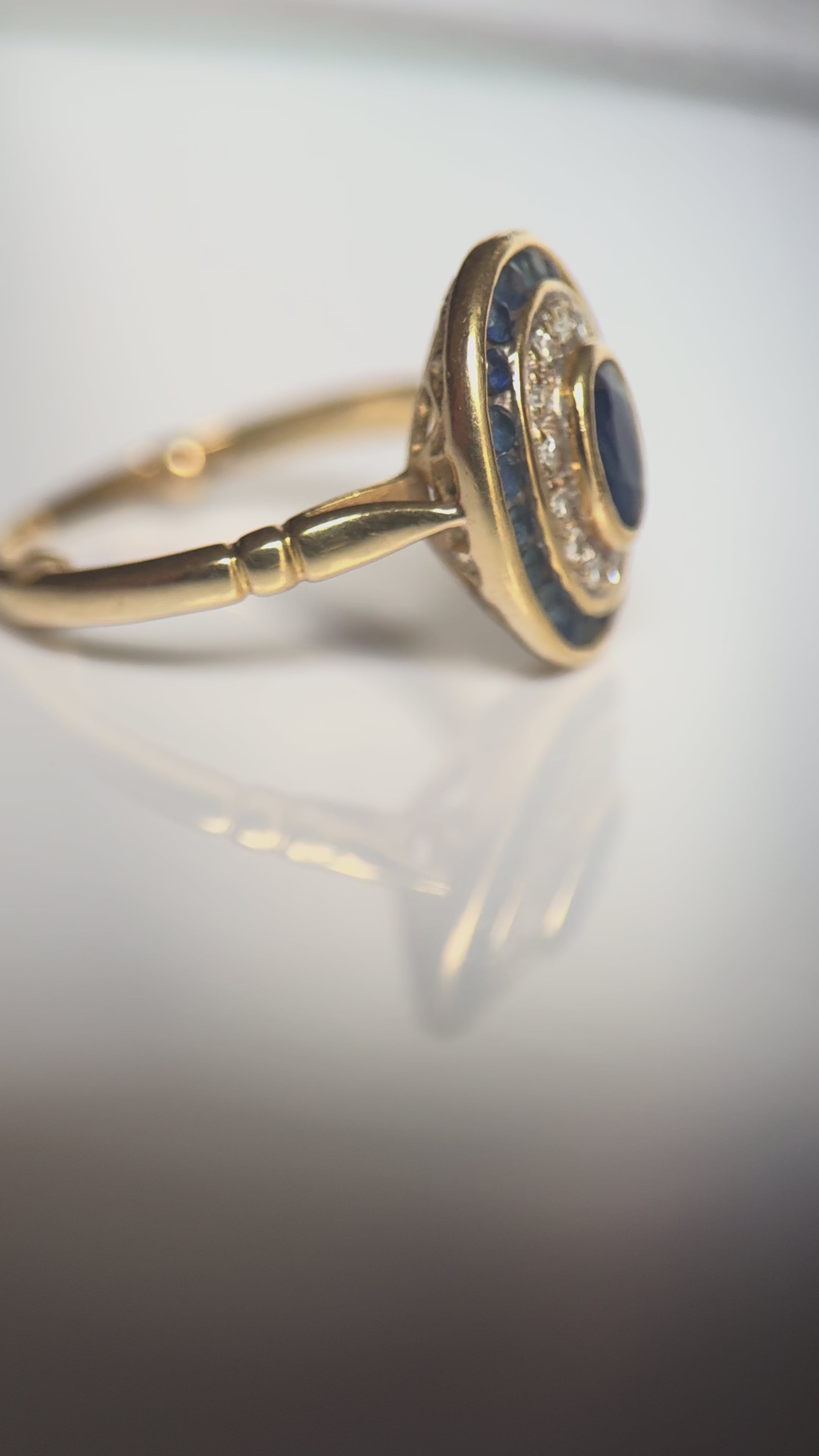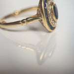 Réalisée en or jaune 18 carats, la bague Bertille est une bague saphir et diamants vintage qui revisite avec grâce le design emblématique des bagues cible anciennes, dans un esprit Art Déco aux lignes pures et assumées. Son plateau ovale, composé sur trois niveaux délicatement structurés, s’organise autour d’un saphir ovale facetté, serti clos, dont l’éclat profond capte la lumière avec douceur.