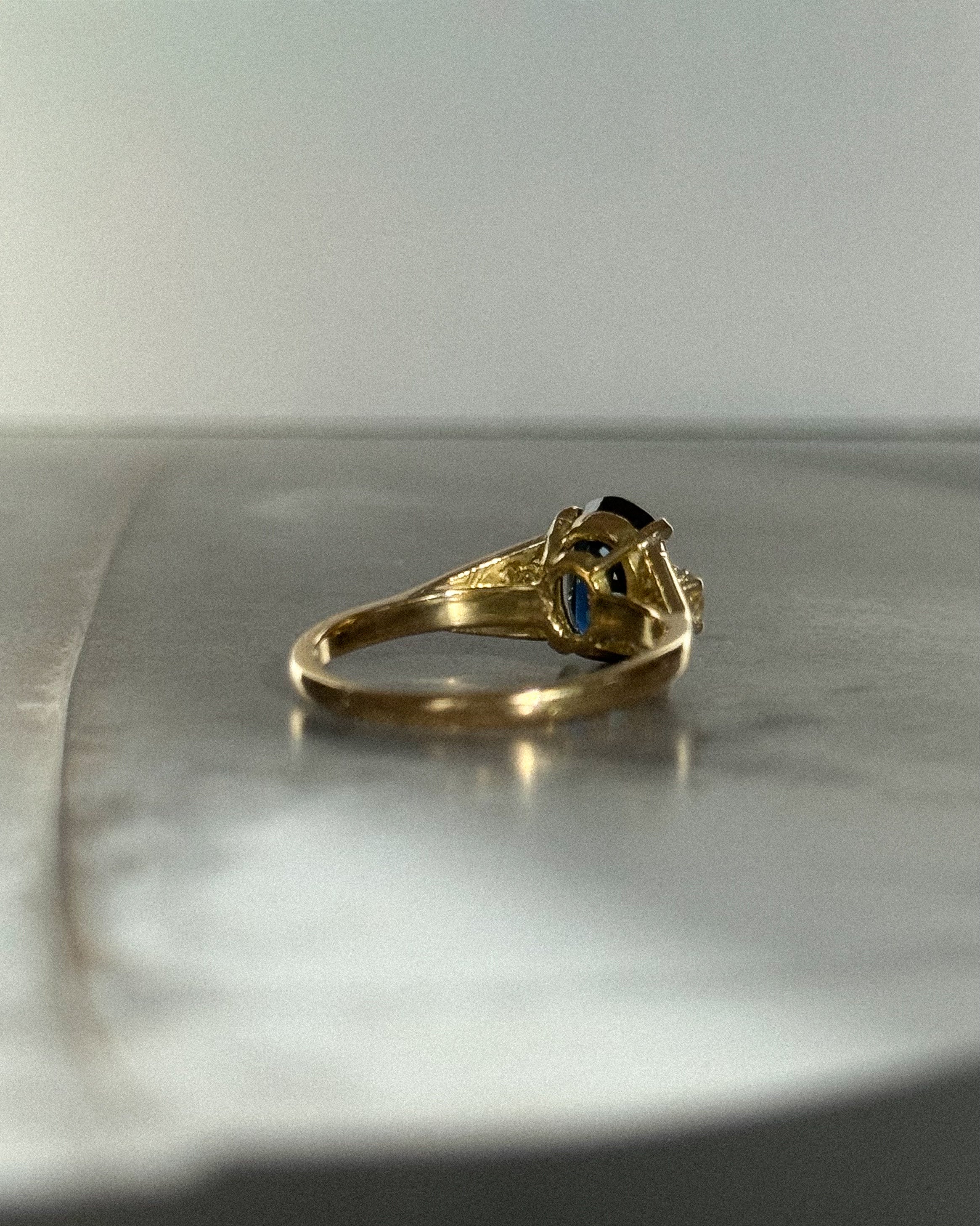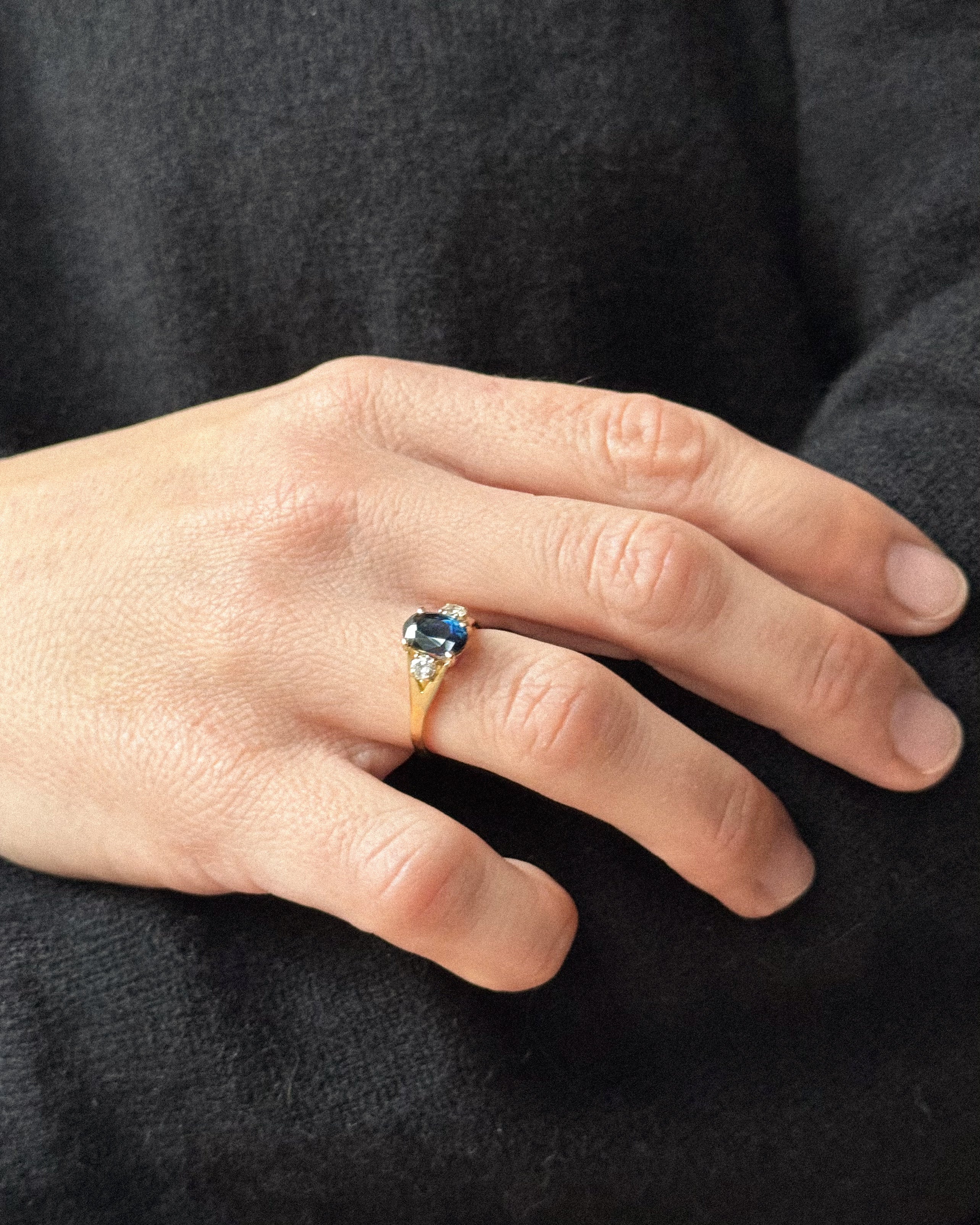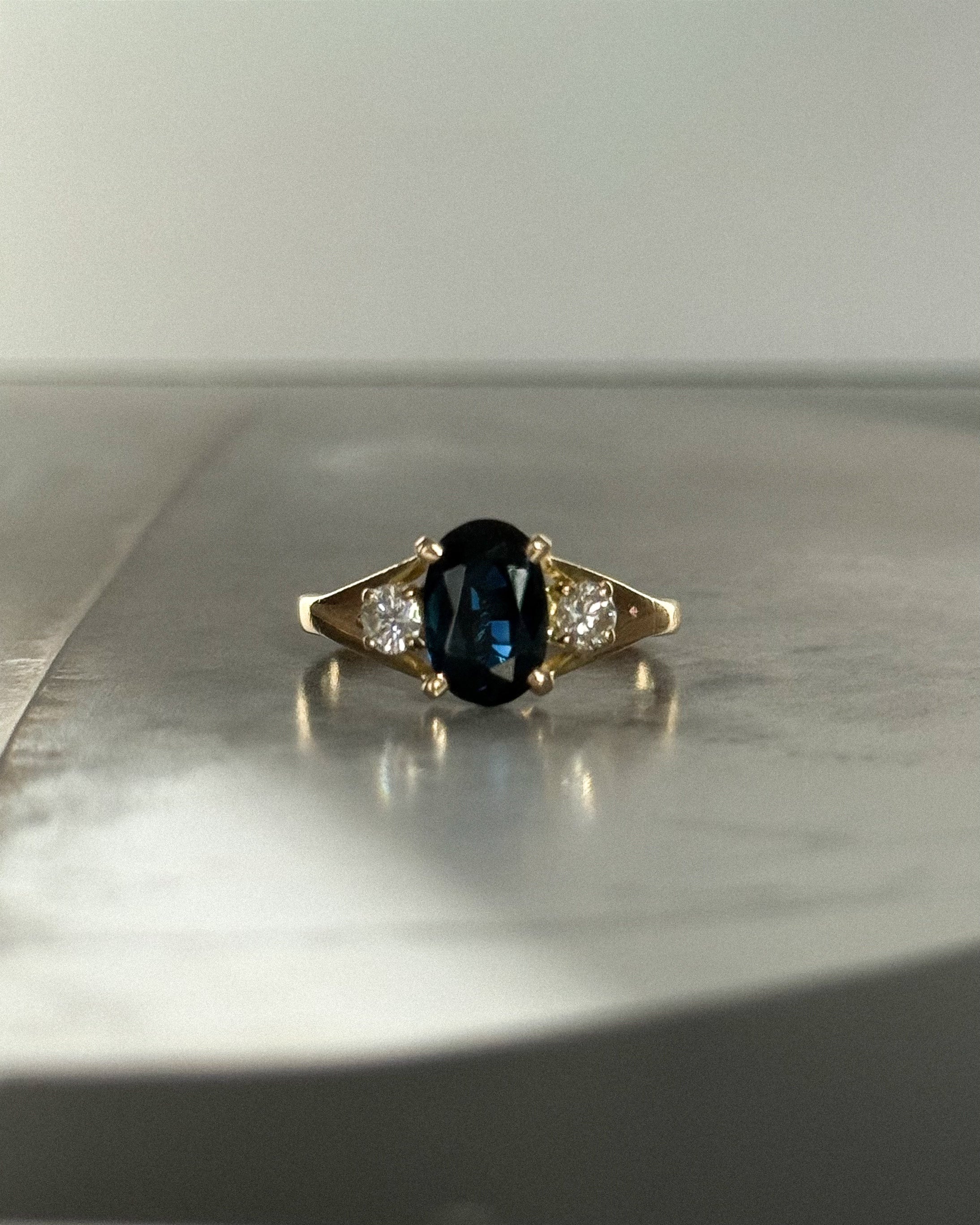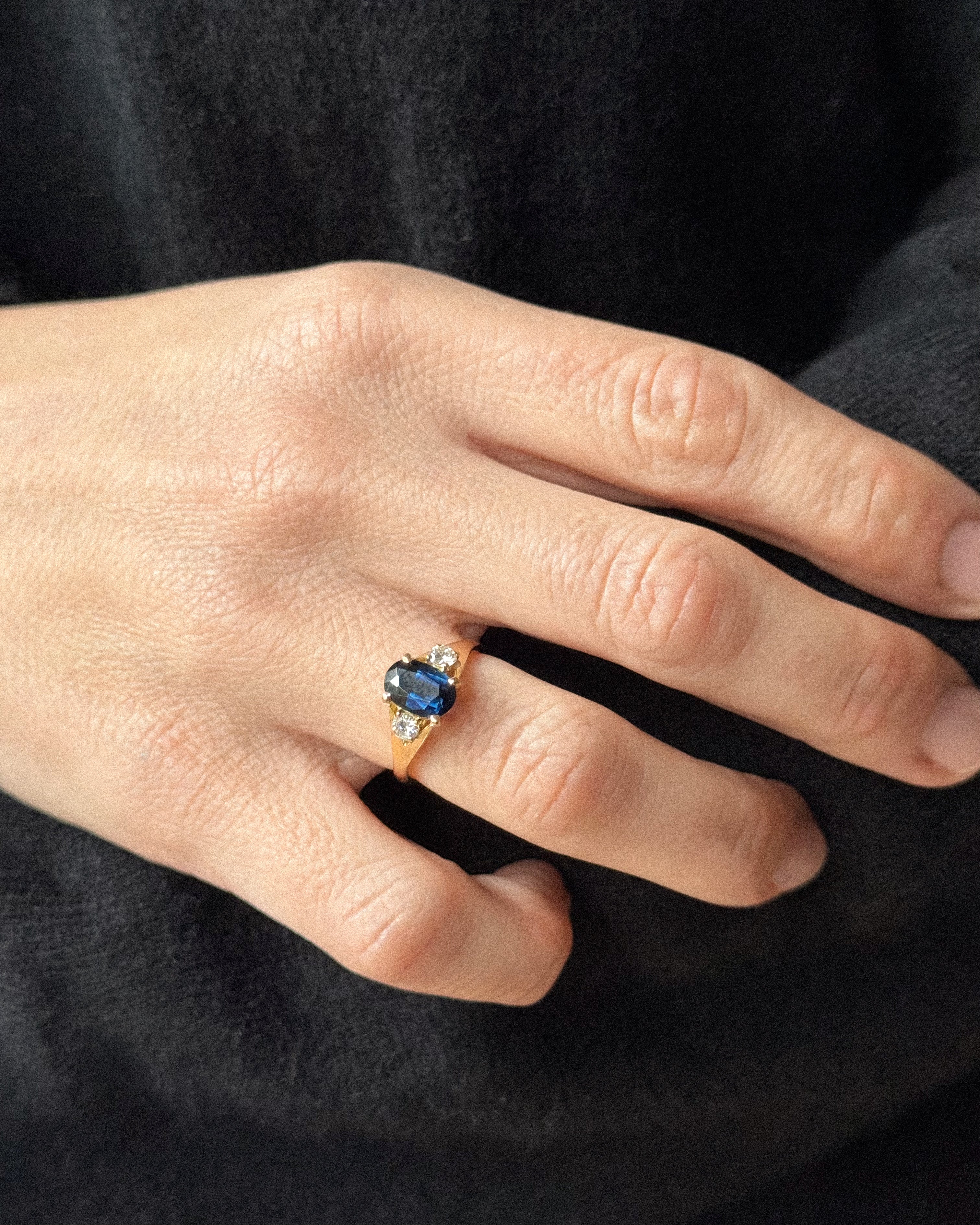 En son centre, un saphir ovale facetté d’environ 2 carats semble littéralement capter la lumière. Retenu par quatre griffes délicates, il affirme une teinte profonde et hypnotique, oscillant entre bleu nuit et éclats cobalt, selon l’éclairage. Une pierre de caractère, à la fois douce et puissante, comme un secret bien gardé.