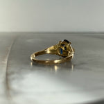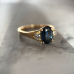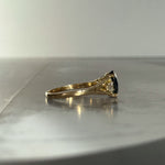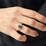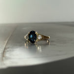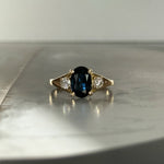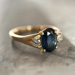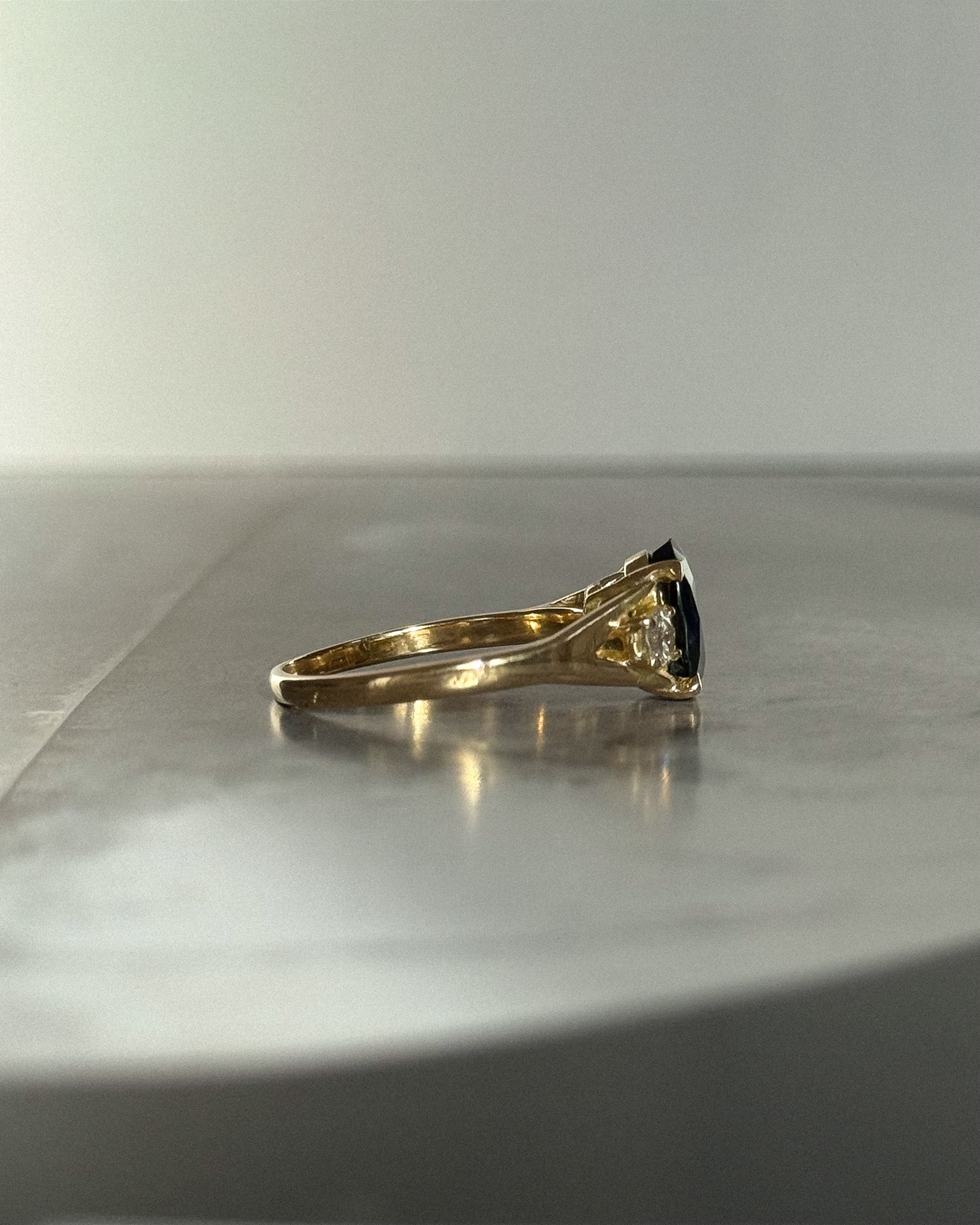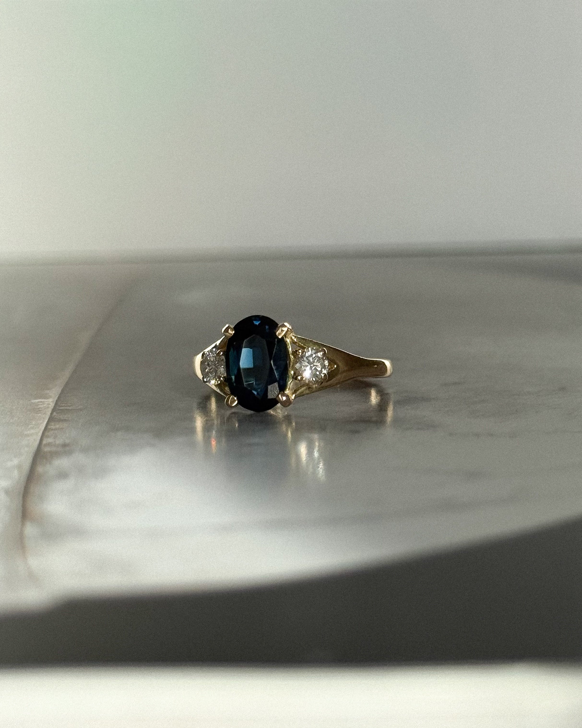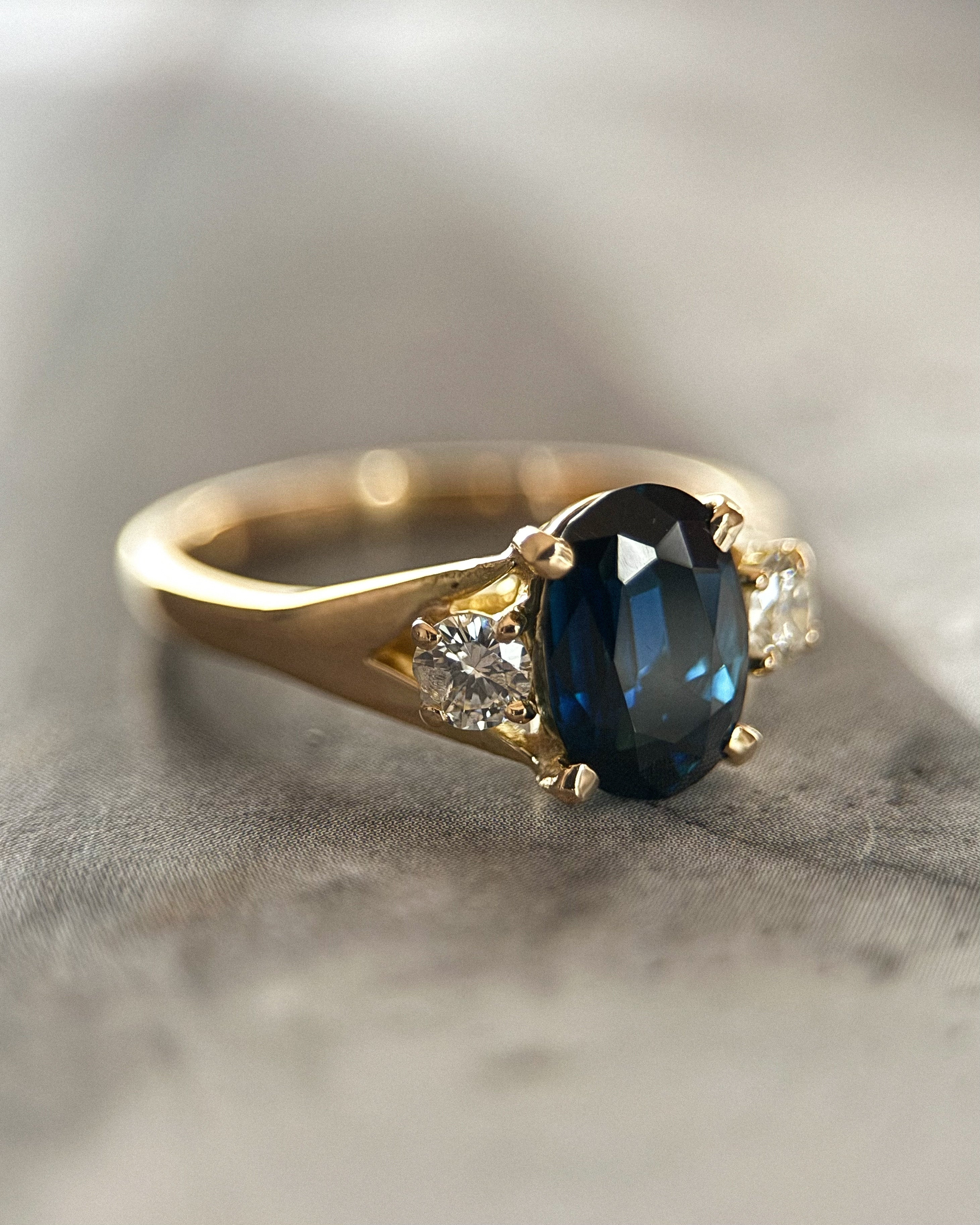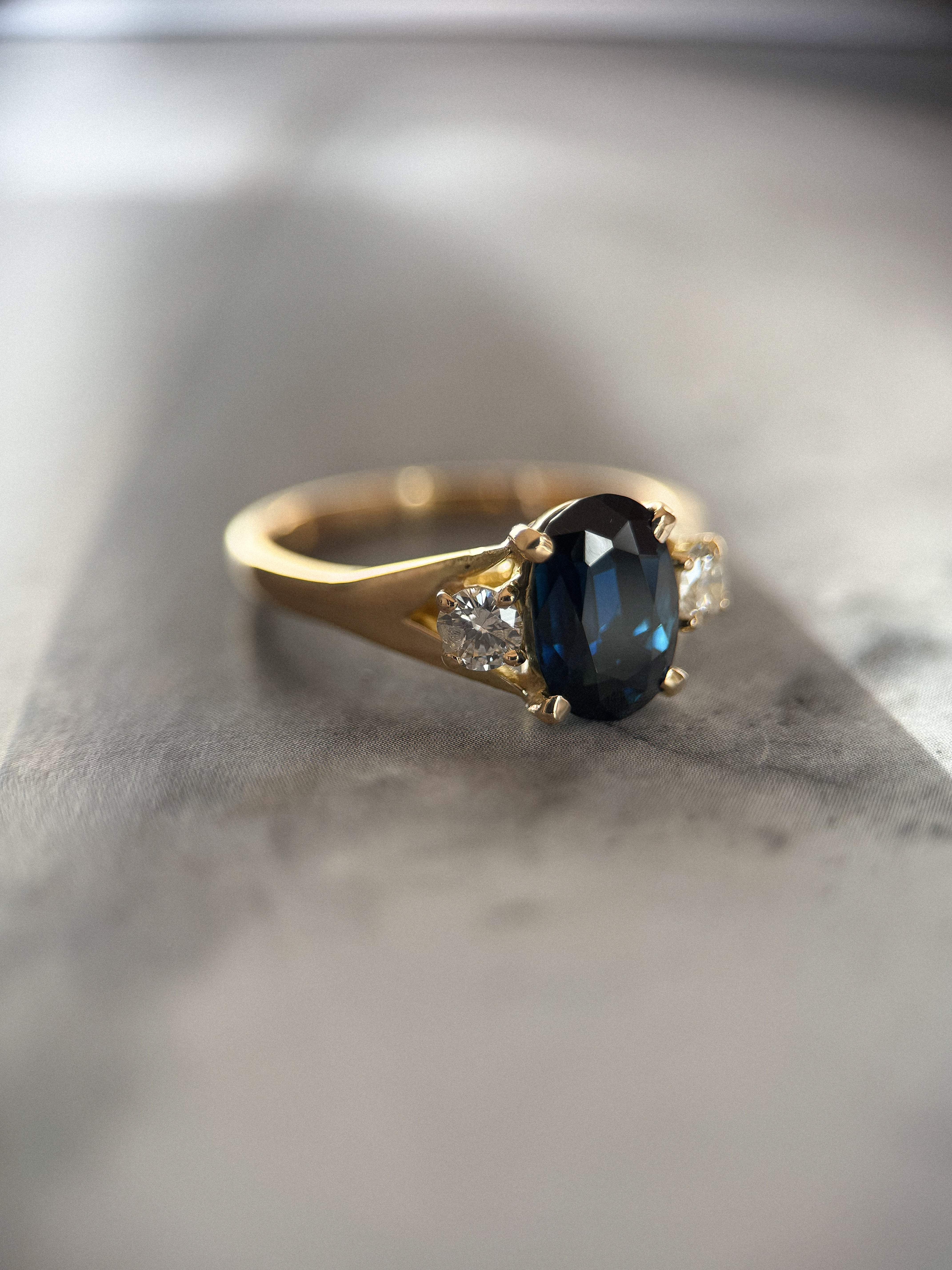 En son centre, un saphir ovale facetté d’environ 2 carats semble littéralement capter la lumière. Retenu par quatre griffes délicates, il affirme une teinte profonde et hypnotique, oscillant entre bleu nuit et éclats cobalt, selon l’éclairage. Une pierre de caractère, à la fois douce et puissante, comme un secret bien gardé.