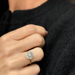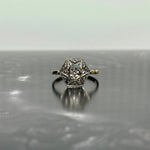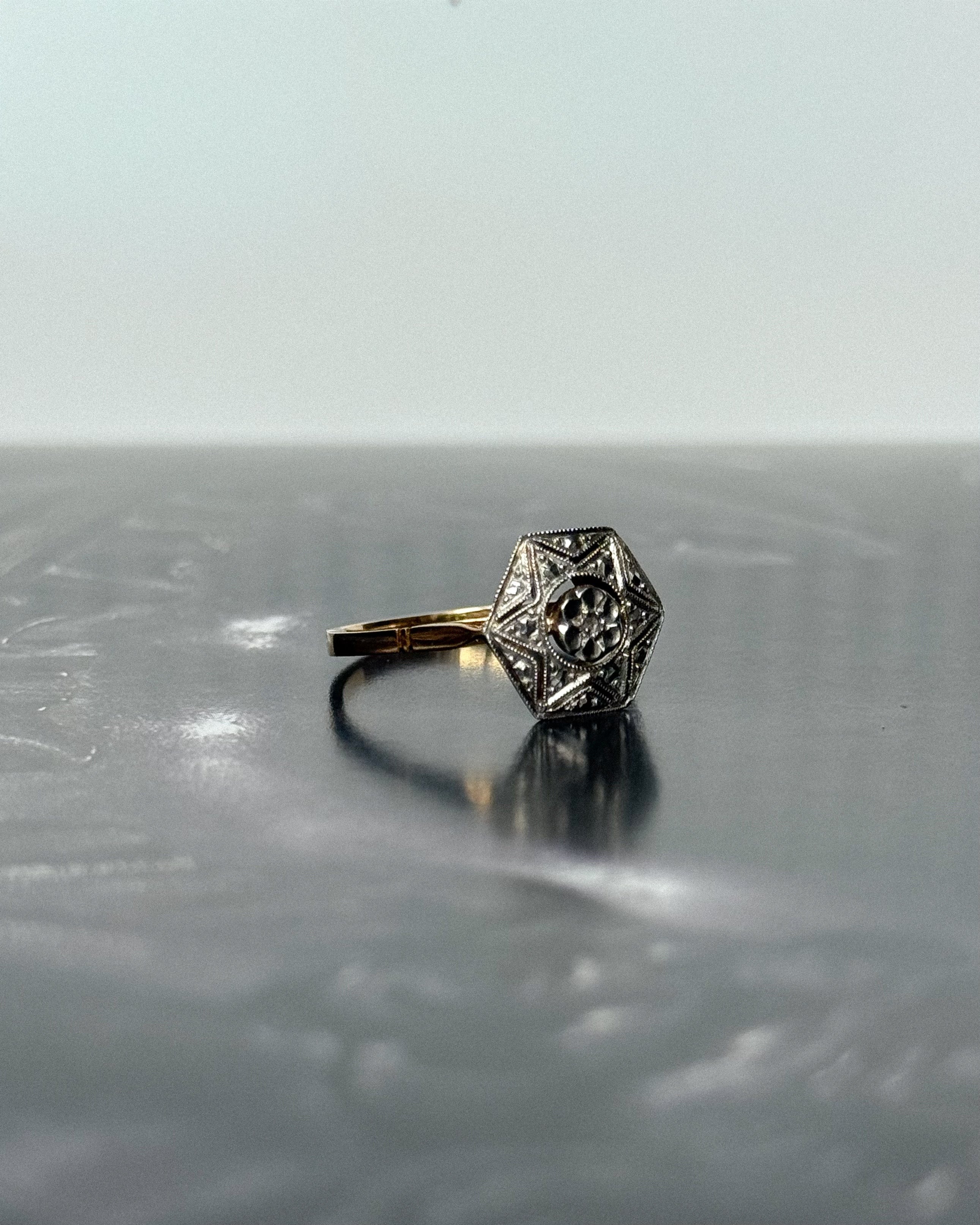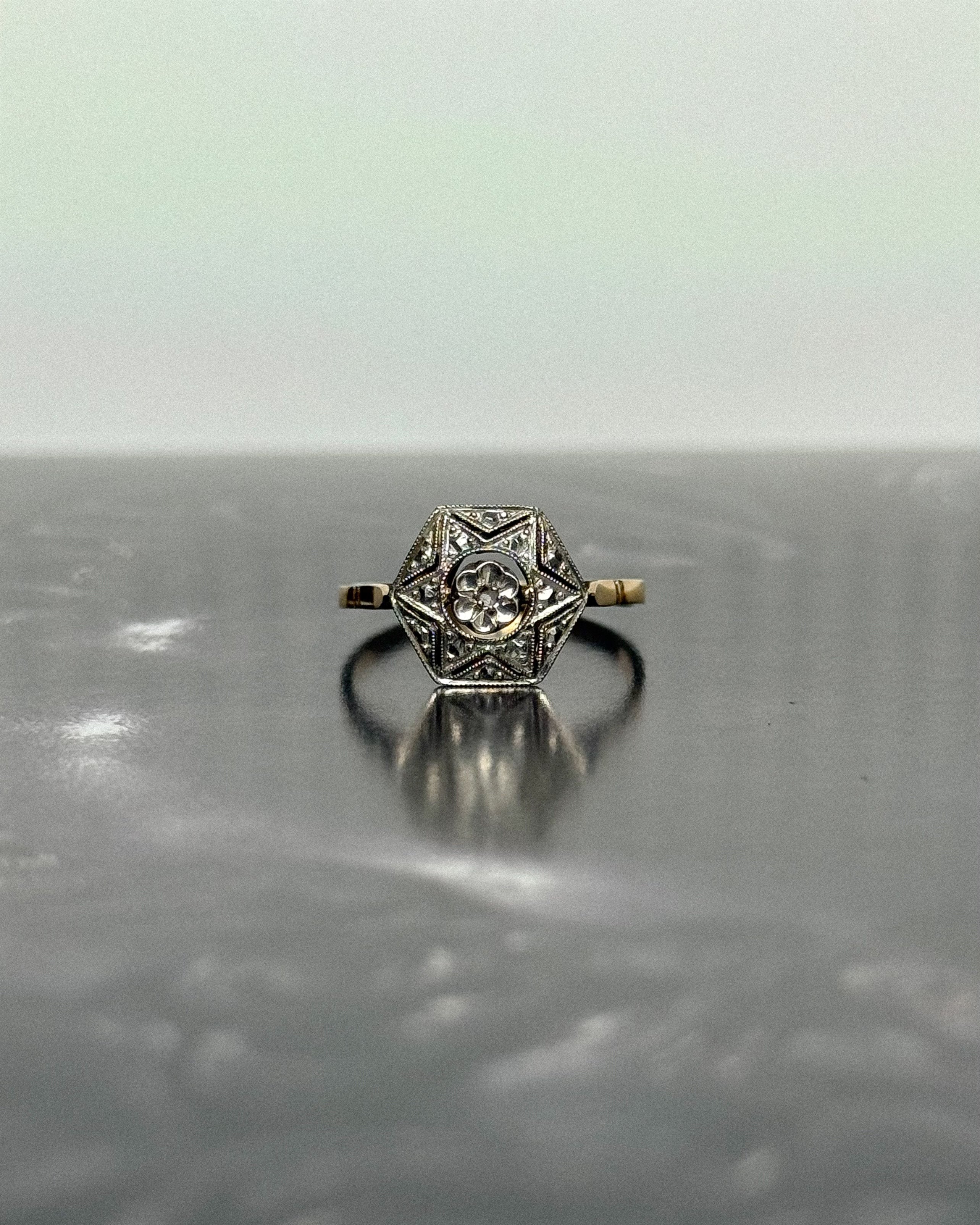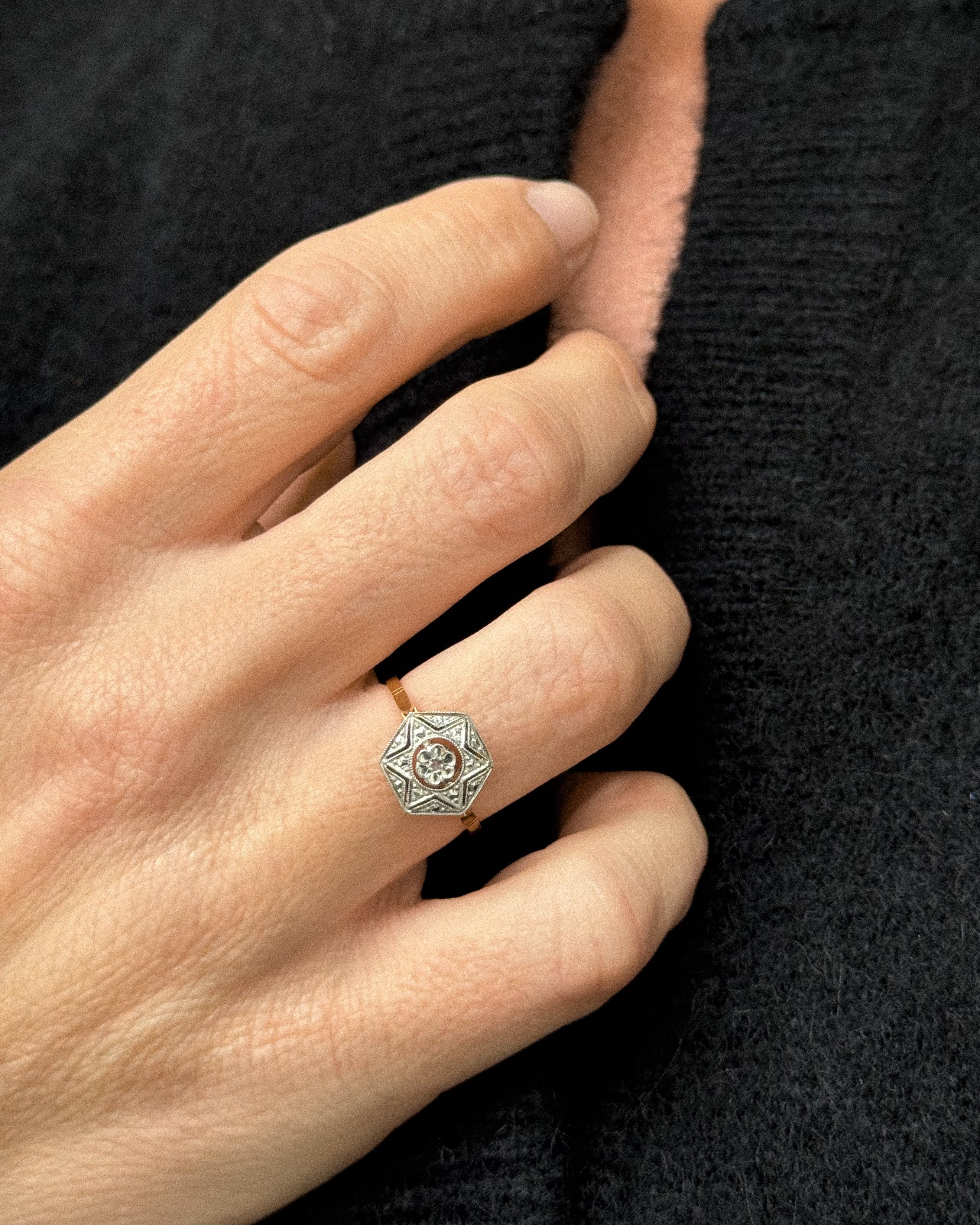 Créée dans les années 1910, cette bague étoile ancienne incarne une esthétique de transition, entre la délicatesse florale de la Belle Époque et l’épure géométrique de l’Art Déco naissant. Réalisée en platine sur or jaune 18 carats, la bague Estelle se distingue par son plateau hexagonal ajouré, forme rare et sophistiquée pour l’époque.