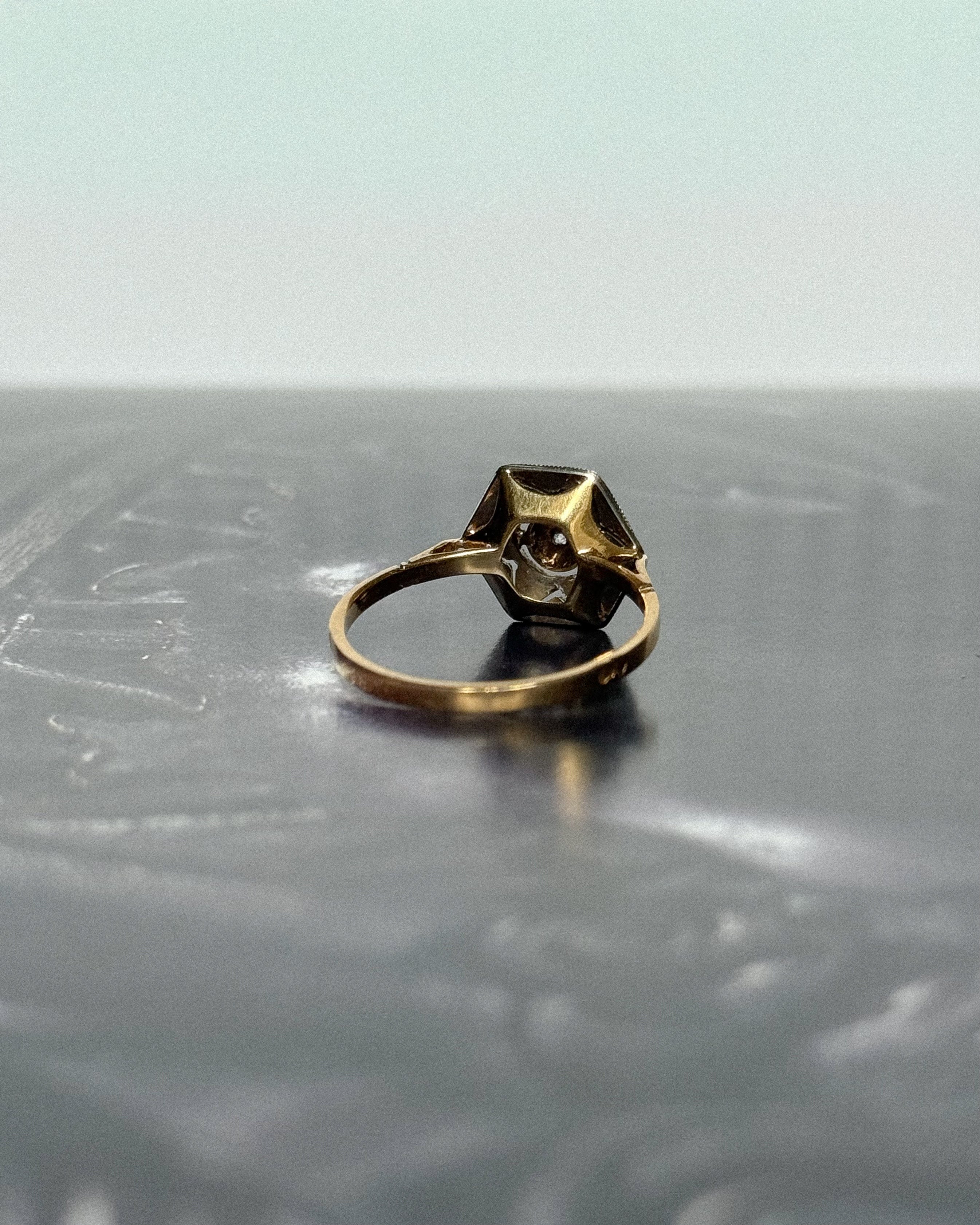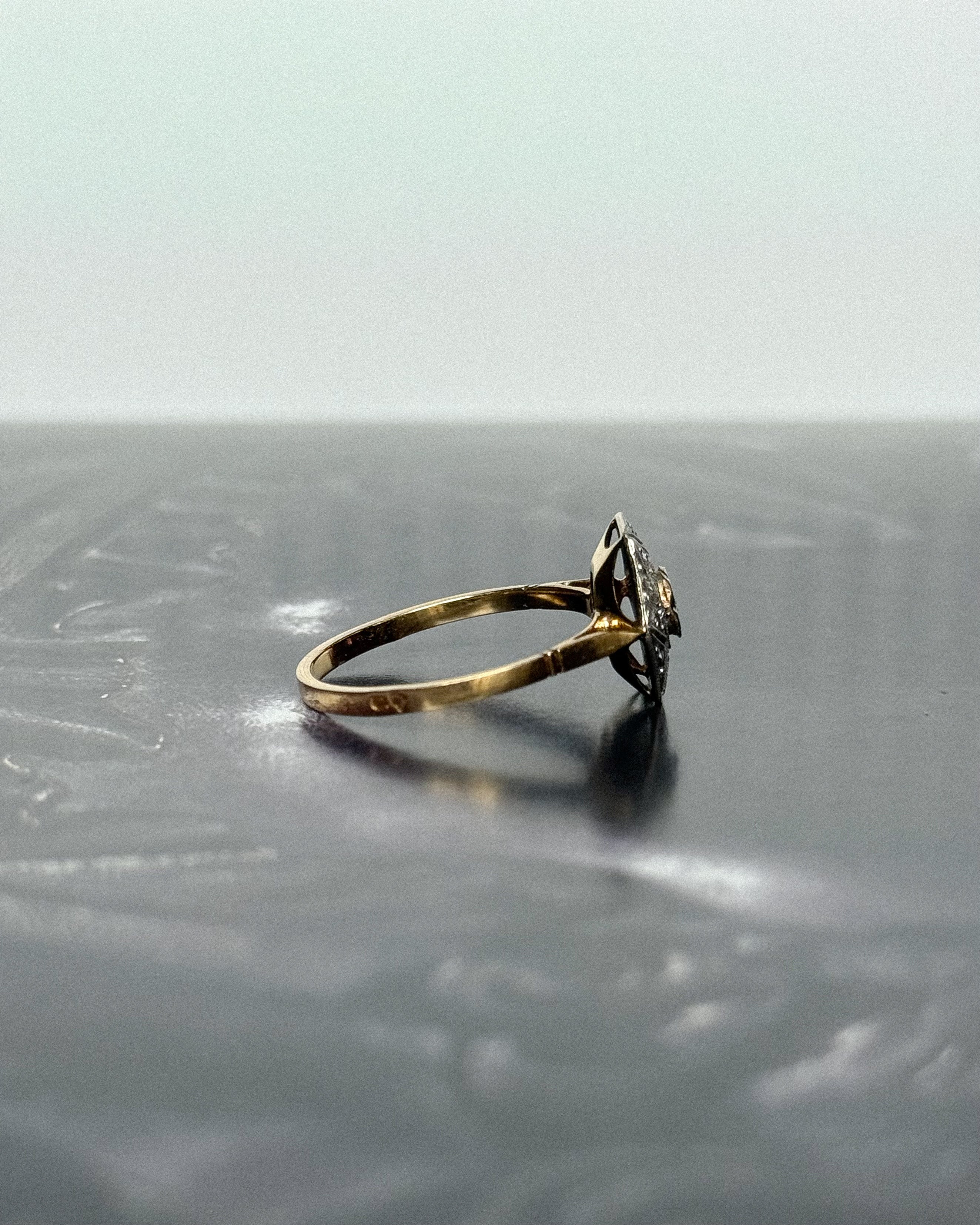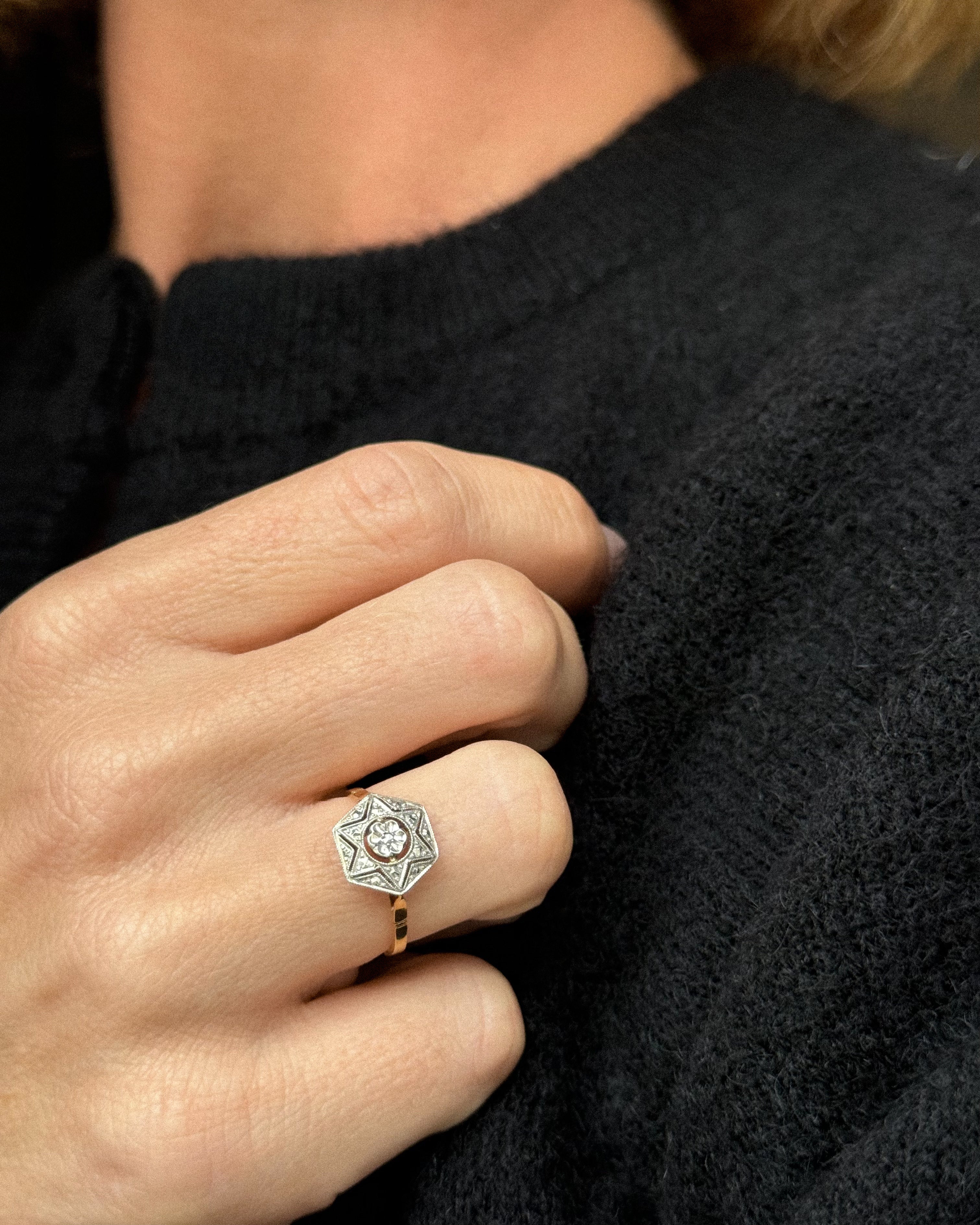 Le motif central, une étoile à six branches gravée en ciselure fine, reflète la fascination de cette période pour les symboles célestes et les constructions géométriques. En son cœur, un diamant taille rose discret, monté en serti fleurette, ajoute une touche de douceur ancienne, aux éclats feutrés et nuancés.