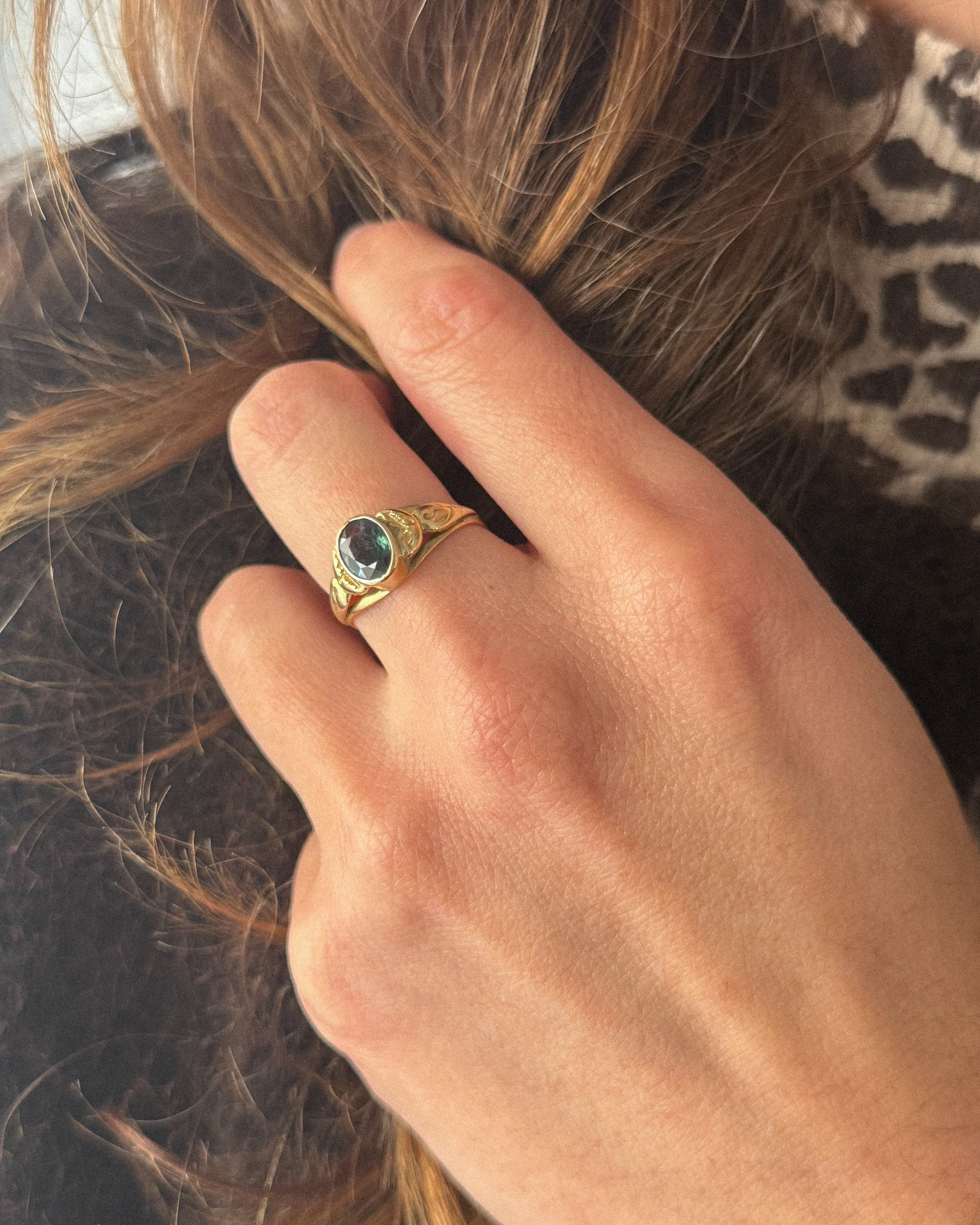 La bague Freya incarne la rencontre entre le charme du passé et l’éclat d’une pierre précieuse choisie avec soin. Réalisée en or jaune 18 carats dans les années 1930, cette pièce de l'artisanat français séduit par la finesse de son décor ciselé et repoussé, inspiré des courbes végétales. Chaque détail du corps de bague évoque un délicat motif floral, sculpté à la main avec une grande maîtrise.