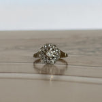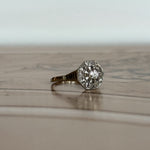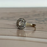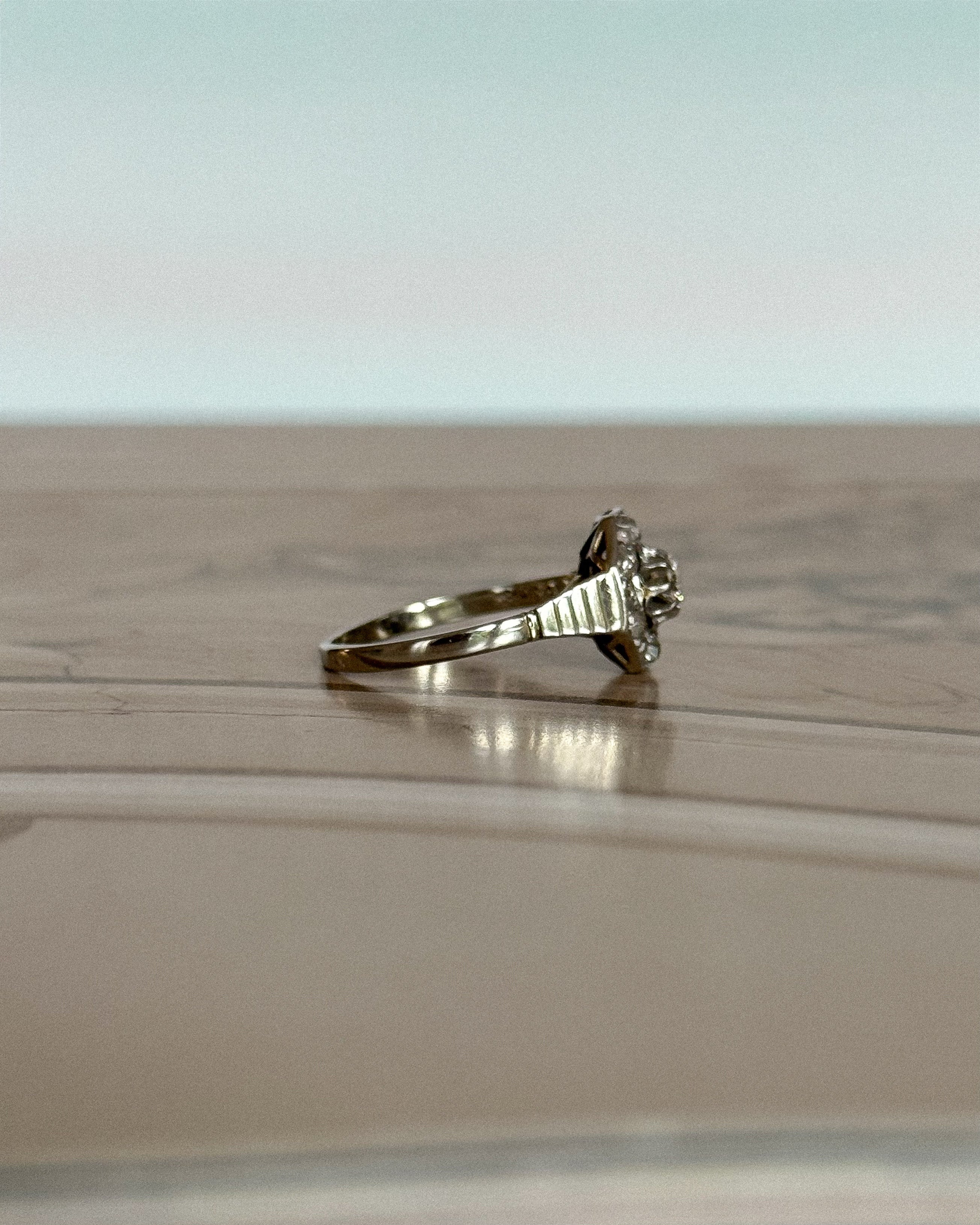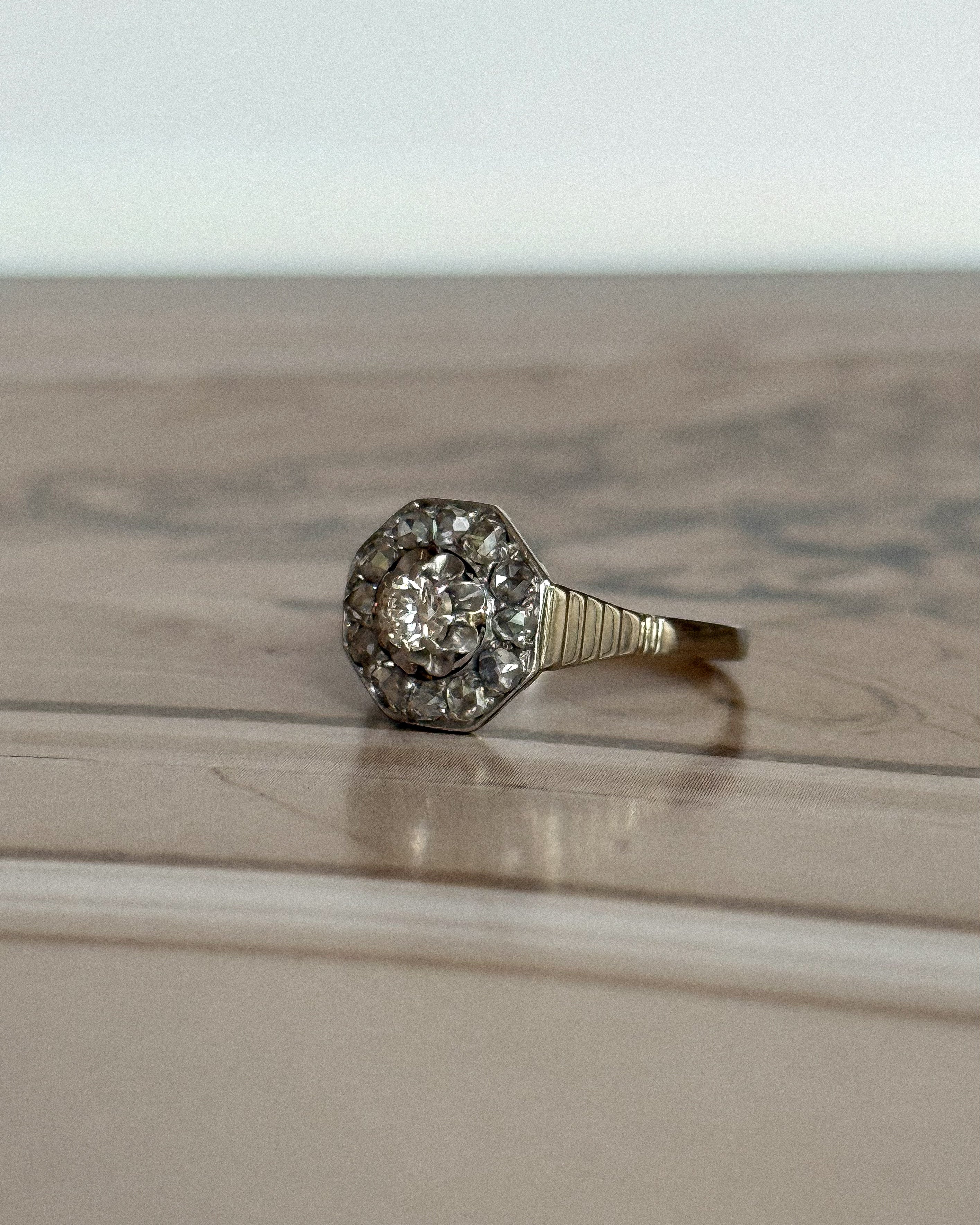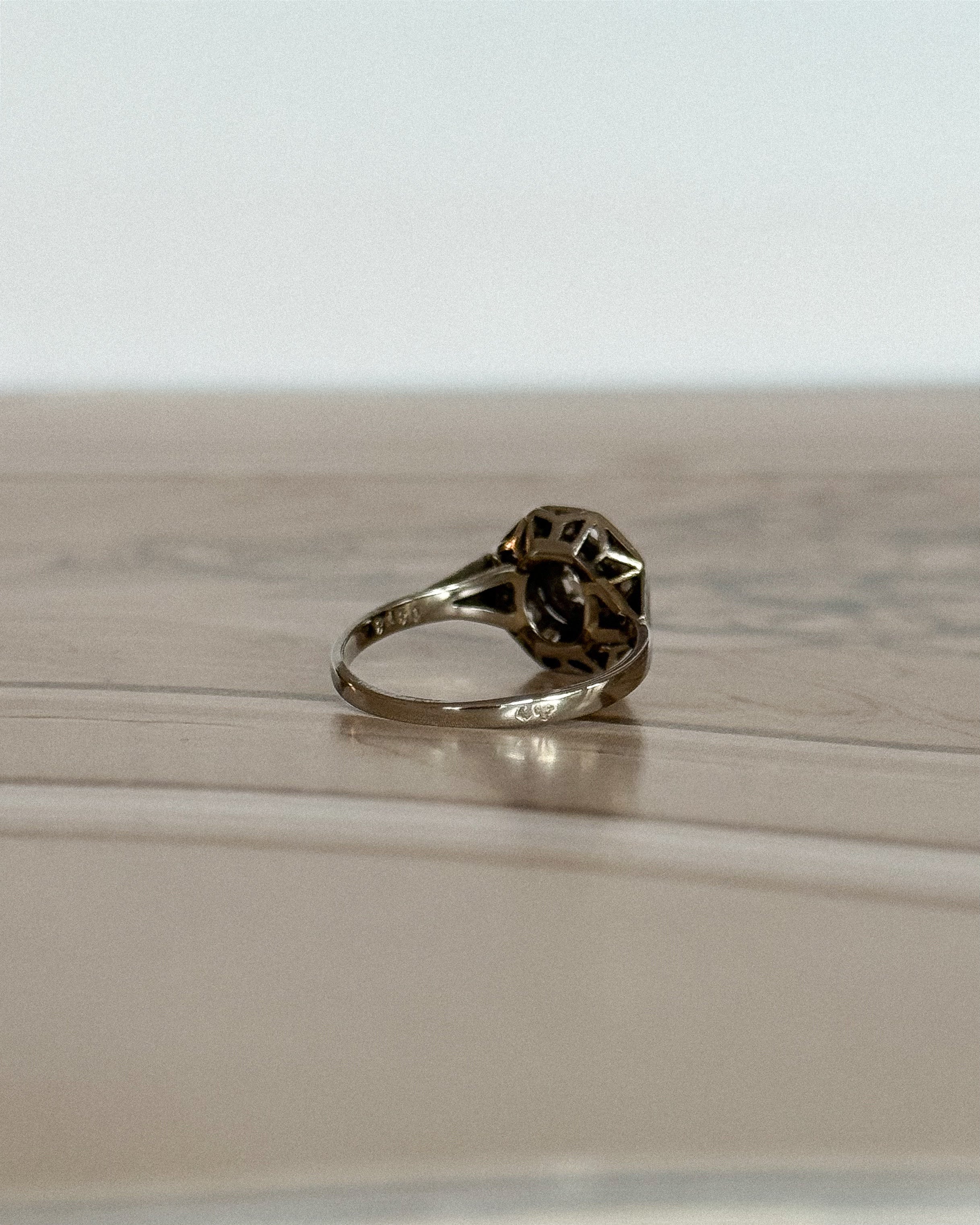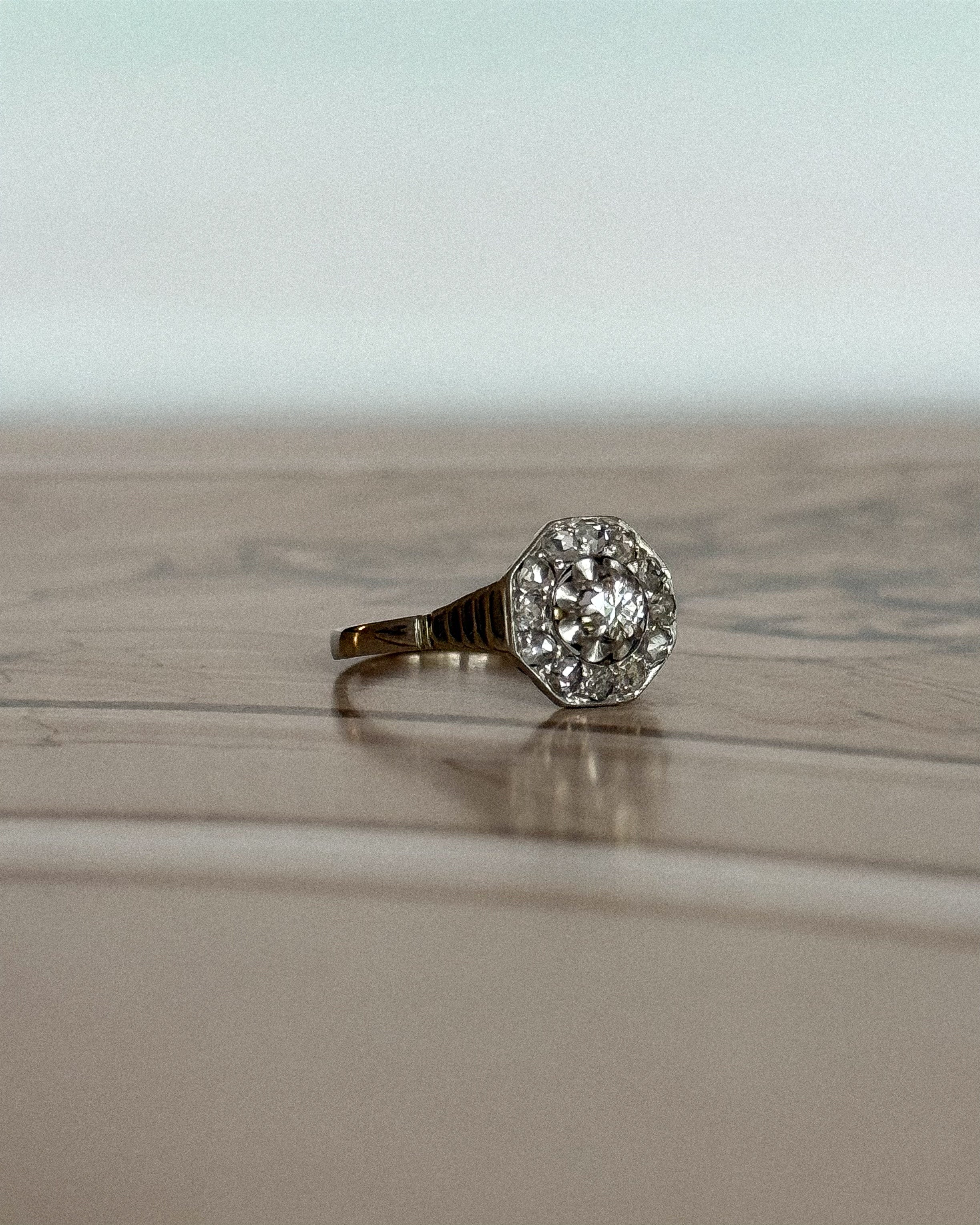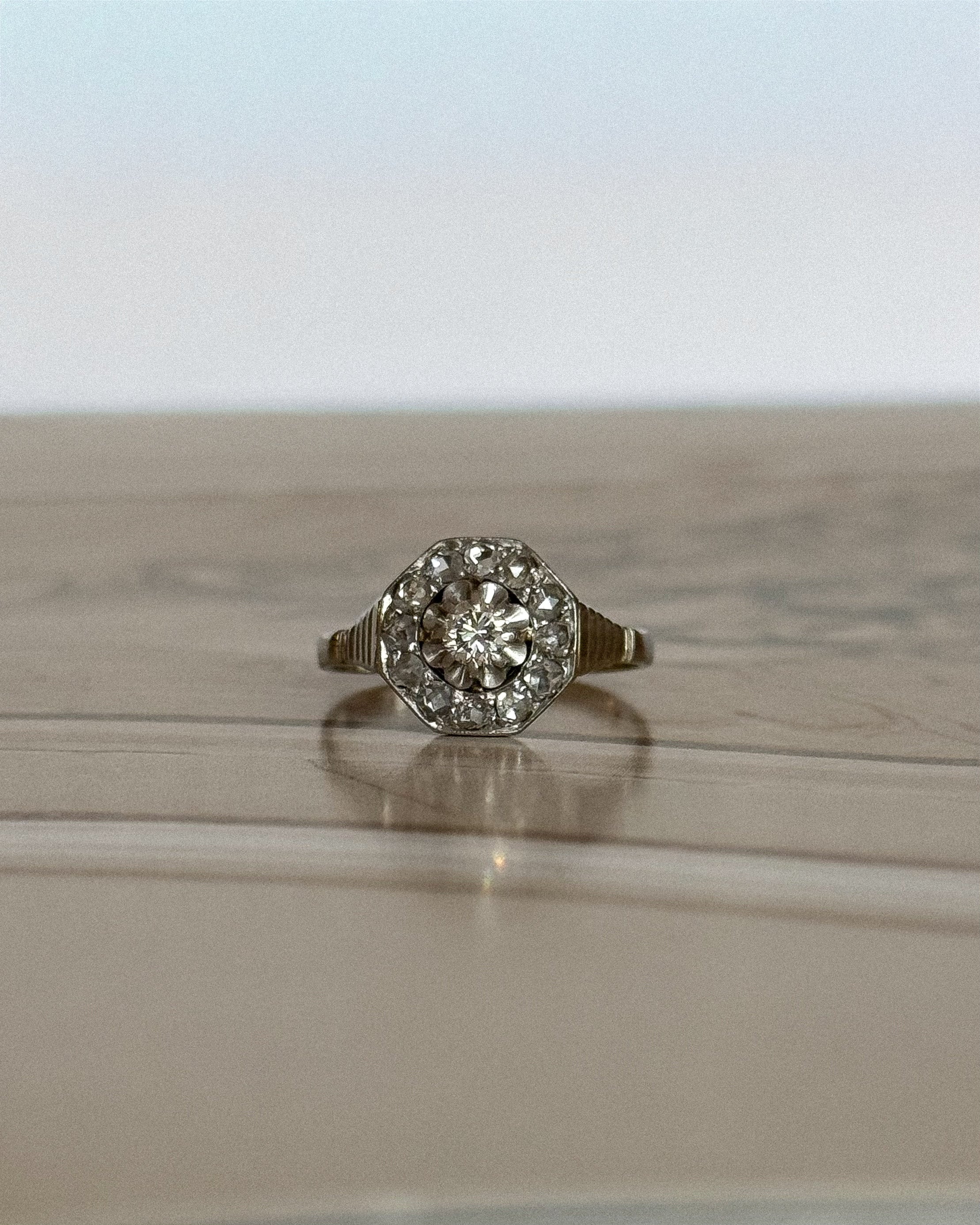 La bague Isabeau capture l’essence même du style Art Déco : rigueur des lignes, maîtrise des volumes, éclat parfaitement mesuré. Son plateau hexagonal, structuré en or blanc et platine, incarne cette esthétique graphique des années 30, où chaque facette compte. En son centre, un diamant taille brillant d’environ 0,10 carat accroche la lumière avec justesse, sans excès. Il est entouré de diamants taillés en rose, dont la brillance douce apporte un contraste subtil à la netteté du dessin.