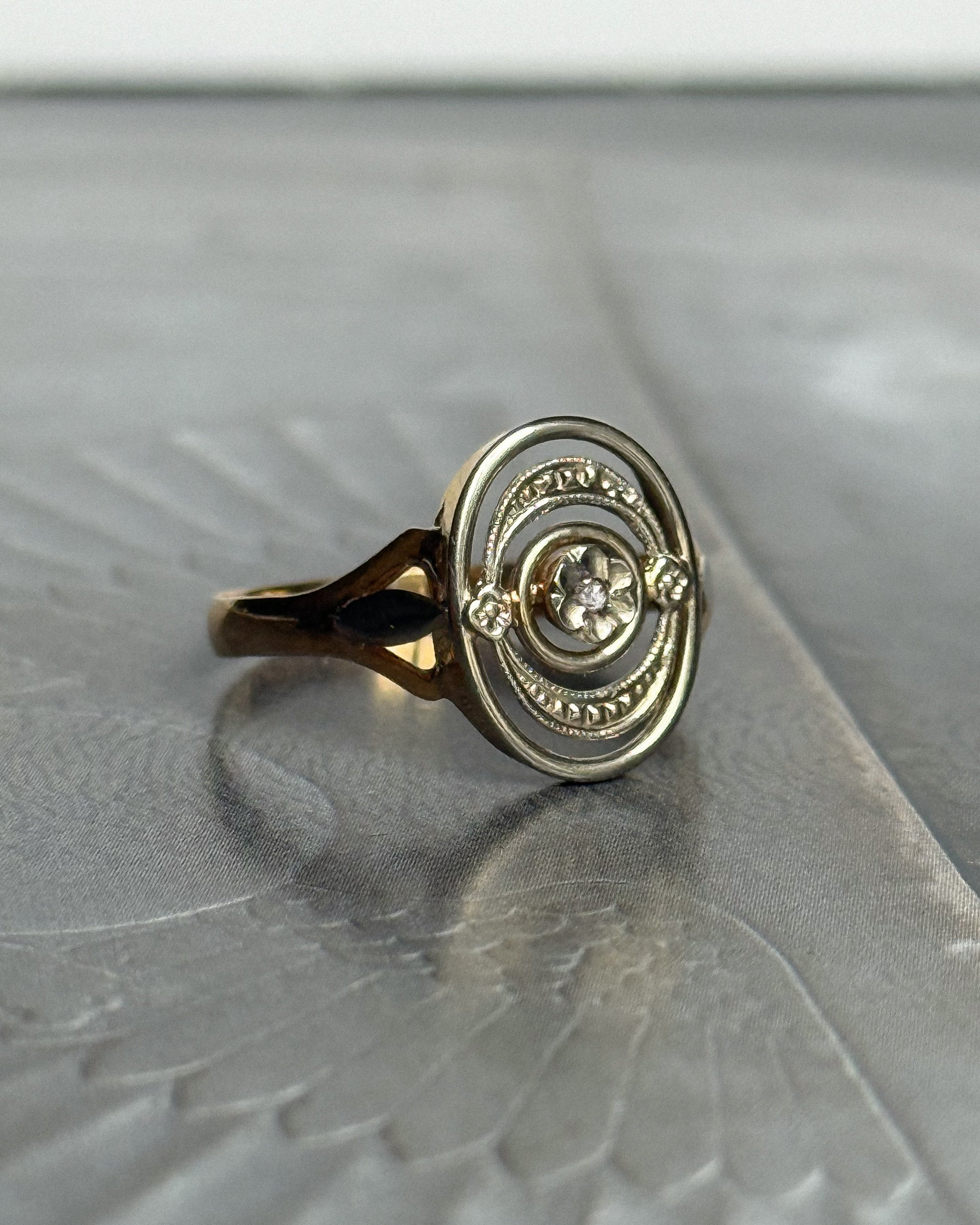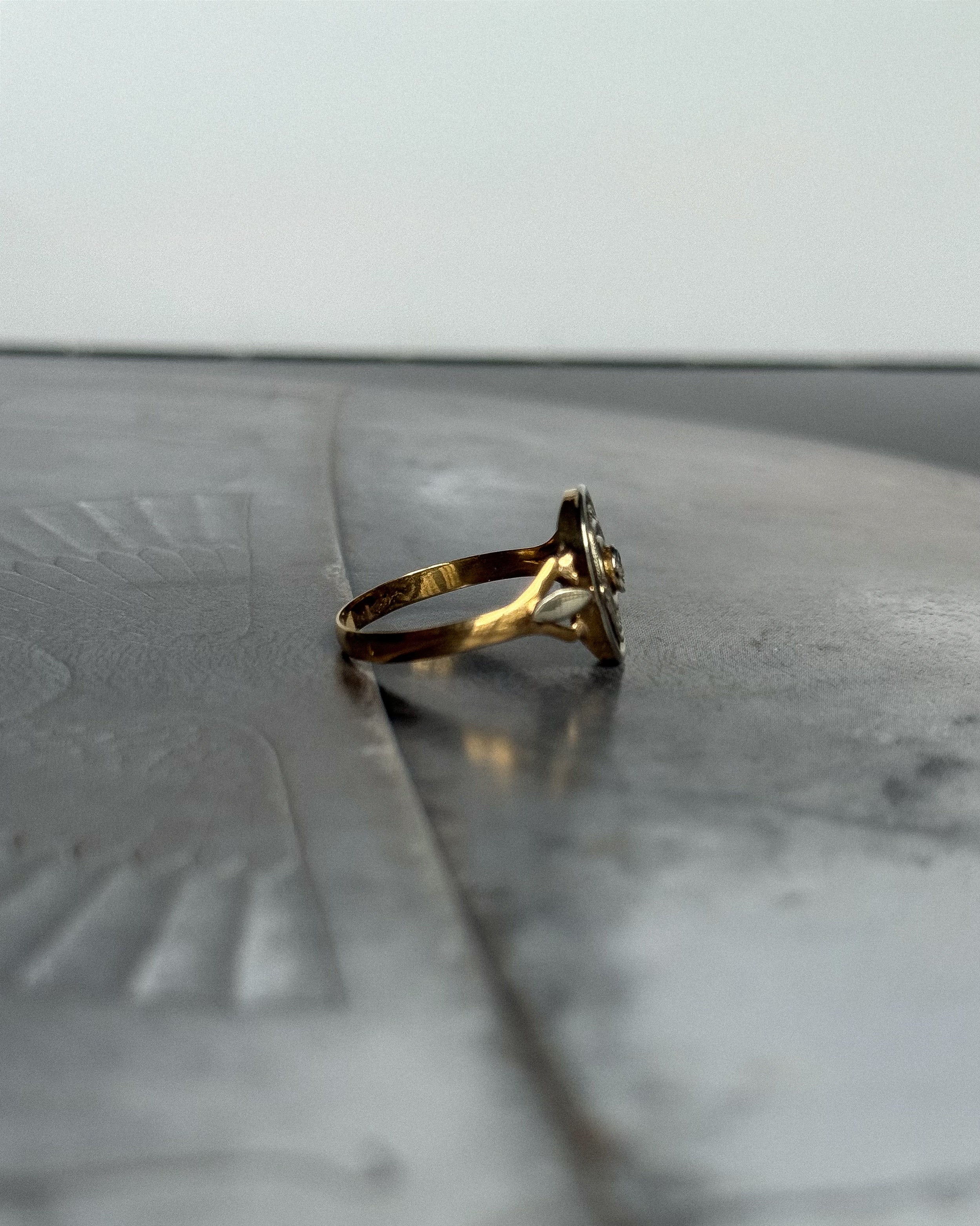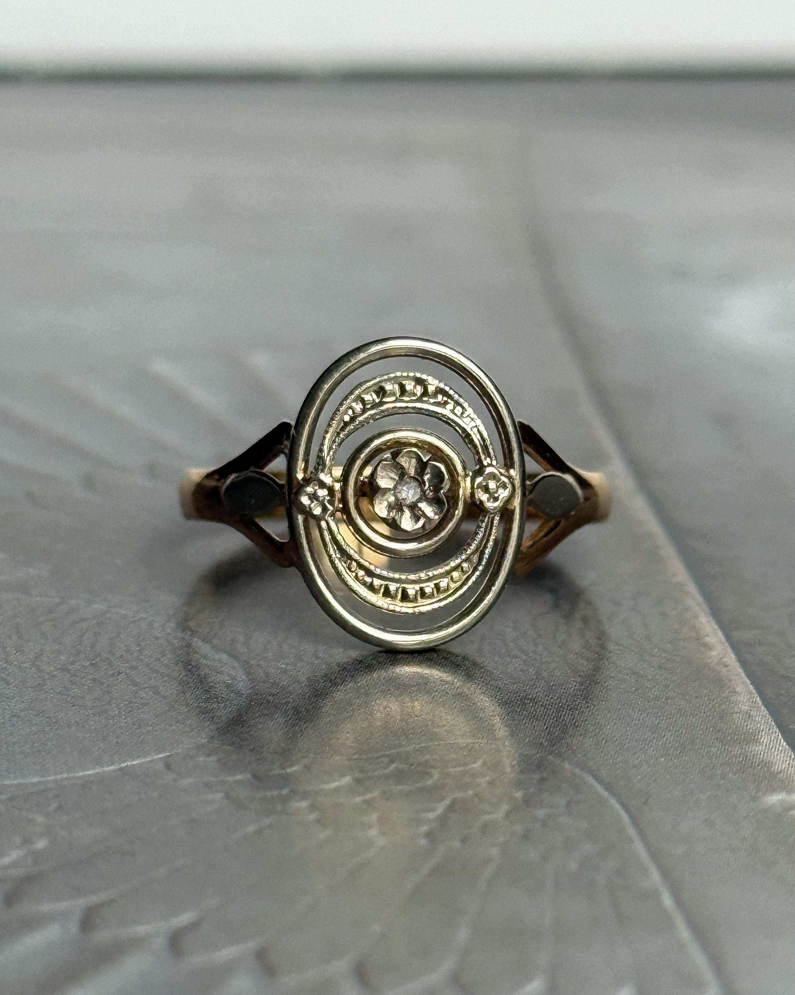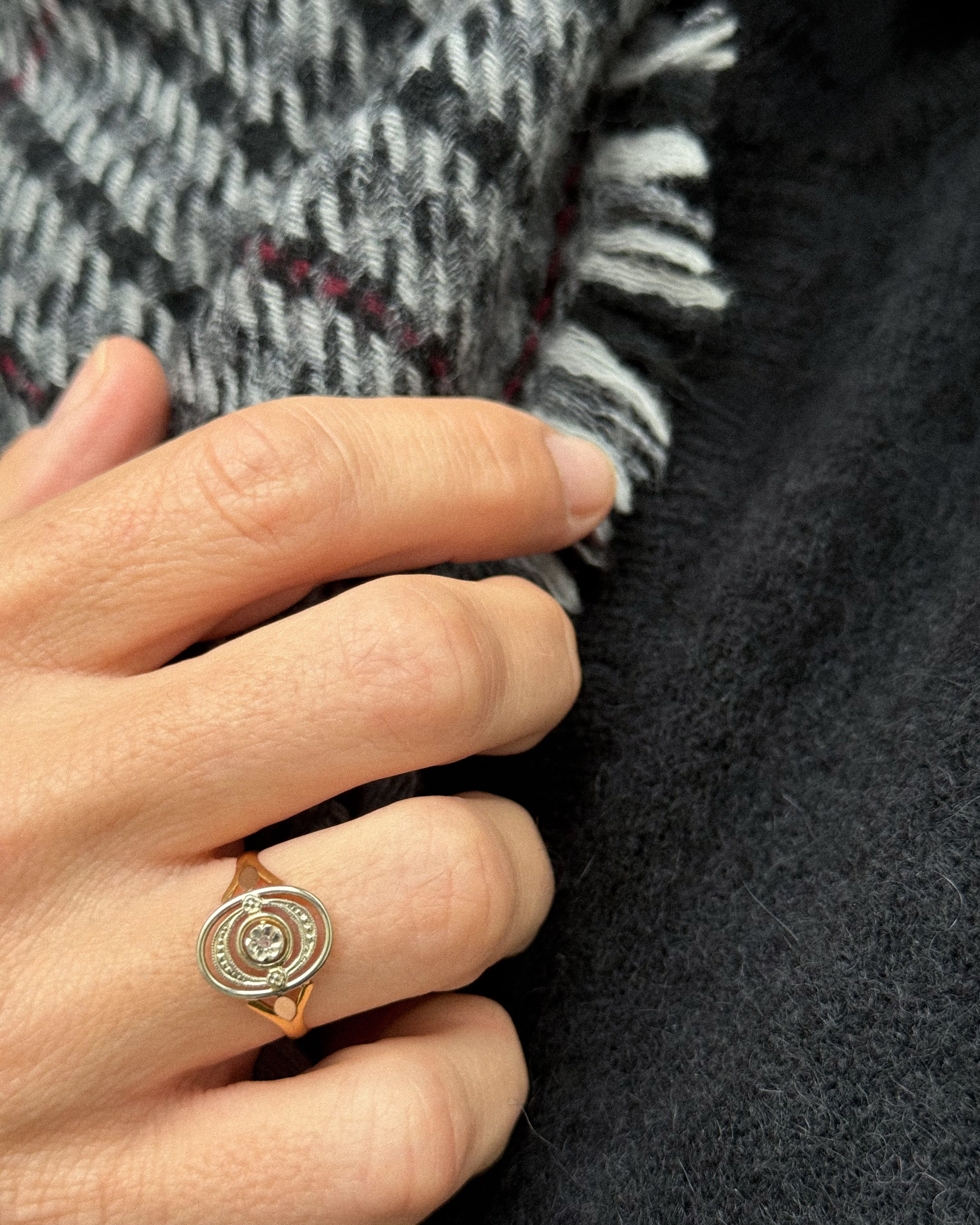 Réalisée en France vers 1910, cette bague édouardienne ancienne incarne l’élégance structurée de la Belle Époque. Conçue en or jaune et blanc 18 carats, la bague Léonora présente un plateau ovale ajouré, organisé en cercles concentriques et centré sur un diamant taille rose, serti en fleurette. Cette taille très ancienne, peu facettée, diffuse une lumière douce et naturelle, en parfaite harmonie avec la délicatesse du bijou.