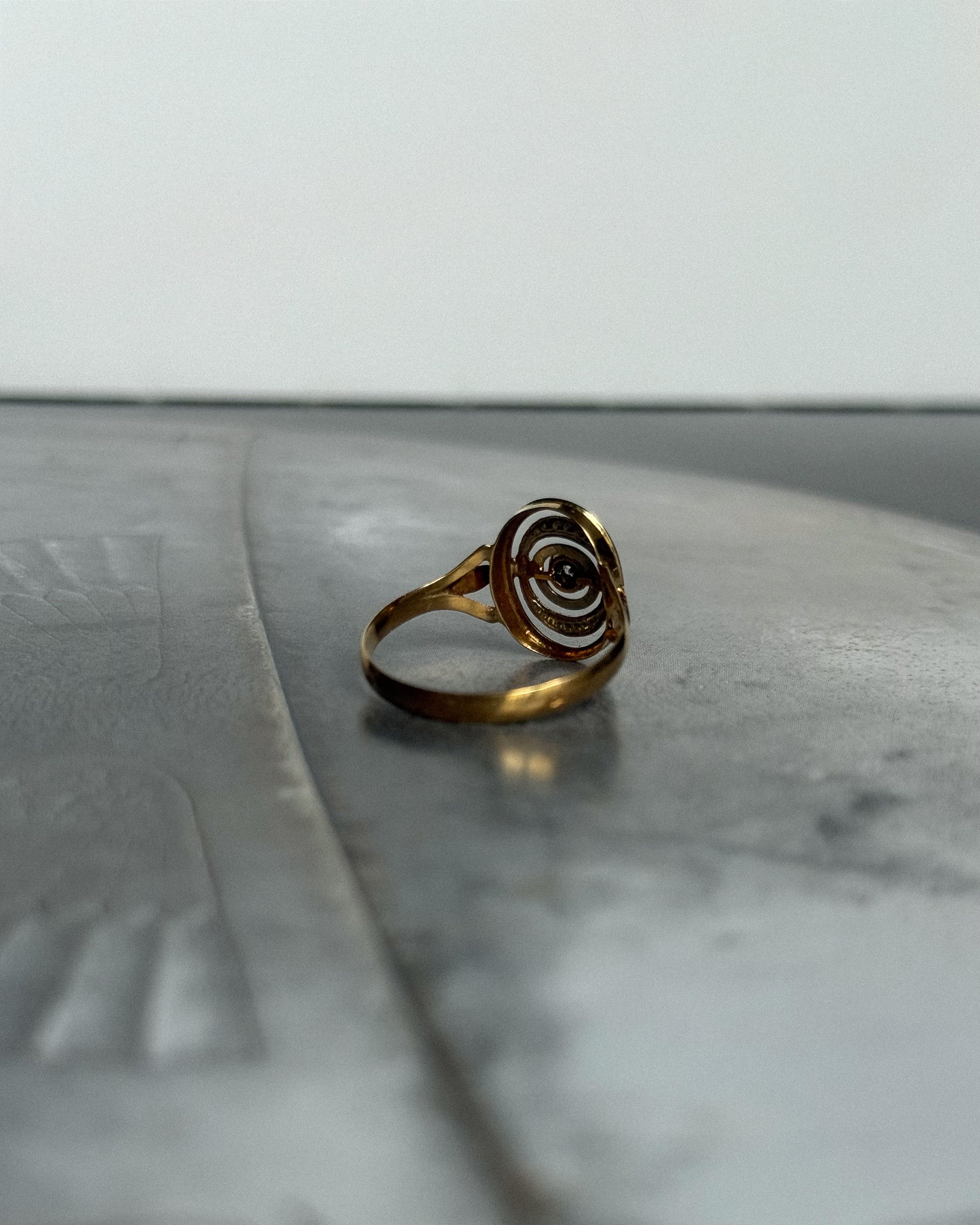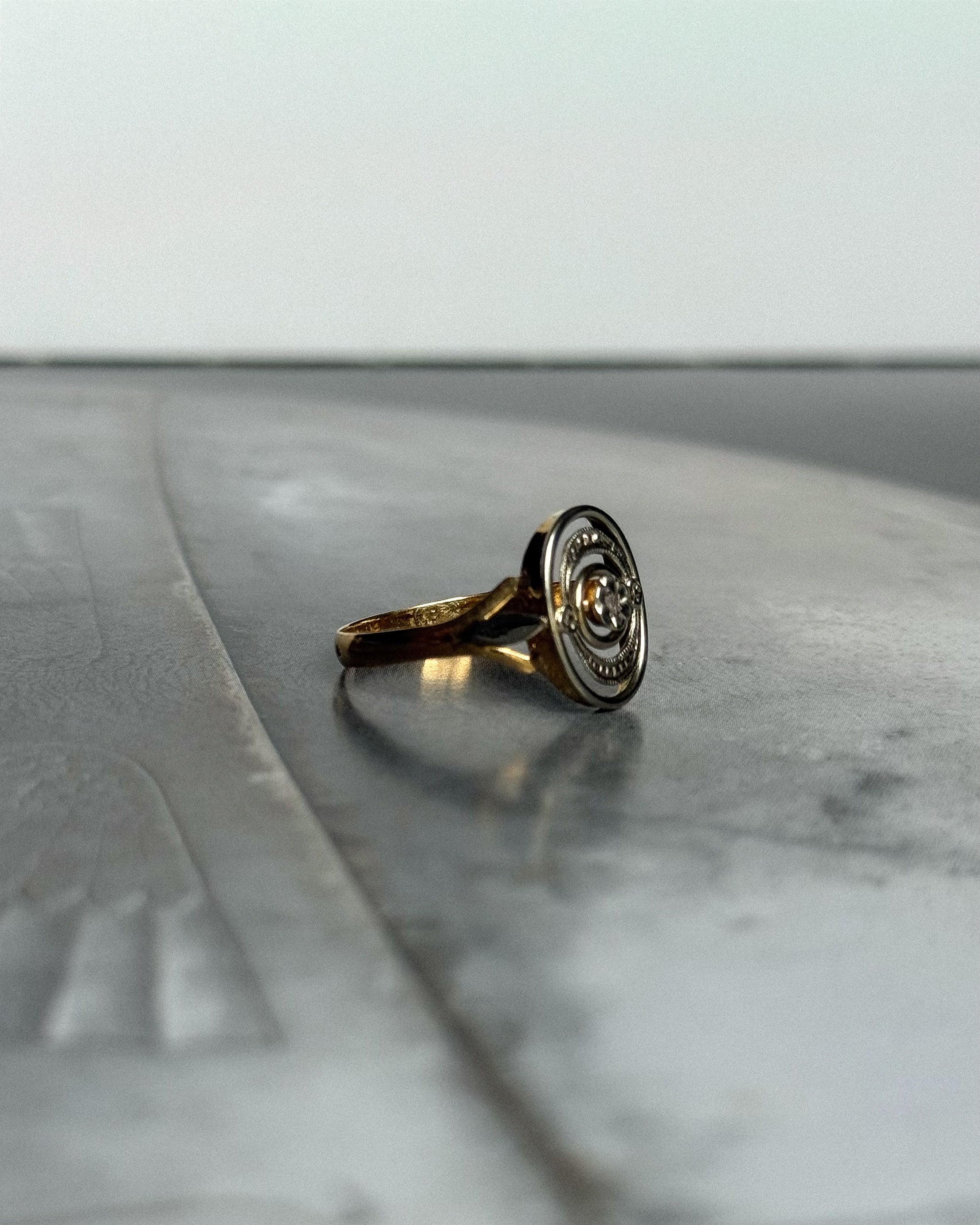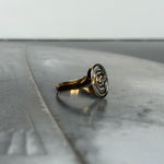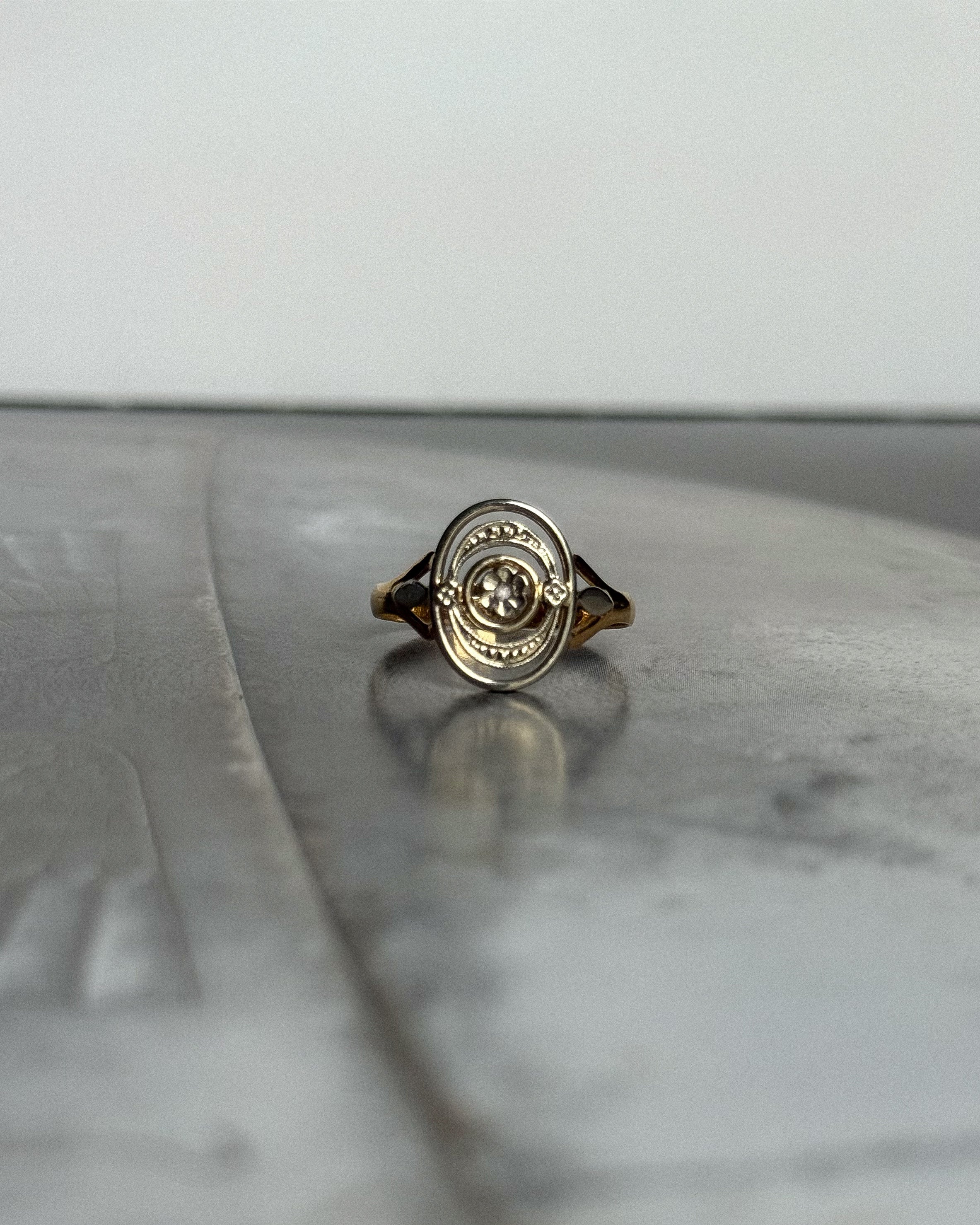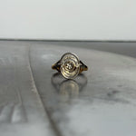 Réalisée en France vers 1910, cette bague édouardienne ancienne incarne l’élégance structurée de la Belle Époque. Conçue en or jaune et blanc 18 carats, la bague Léonora présente un plateau ovale ajouré, organisé en cercles concentriques et centré sur un diamant taille rose, serti en fleurette. Cette taille très ancienne, peu facettée, diffuse une lumière douce et naturelle, en parfaite harmonie avec la délicatesse du bijou.