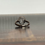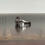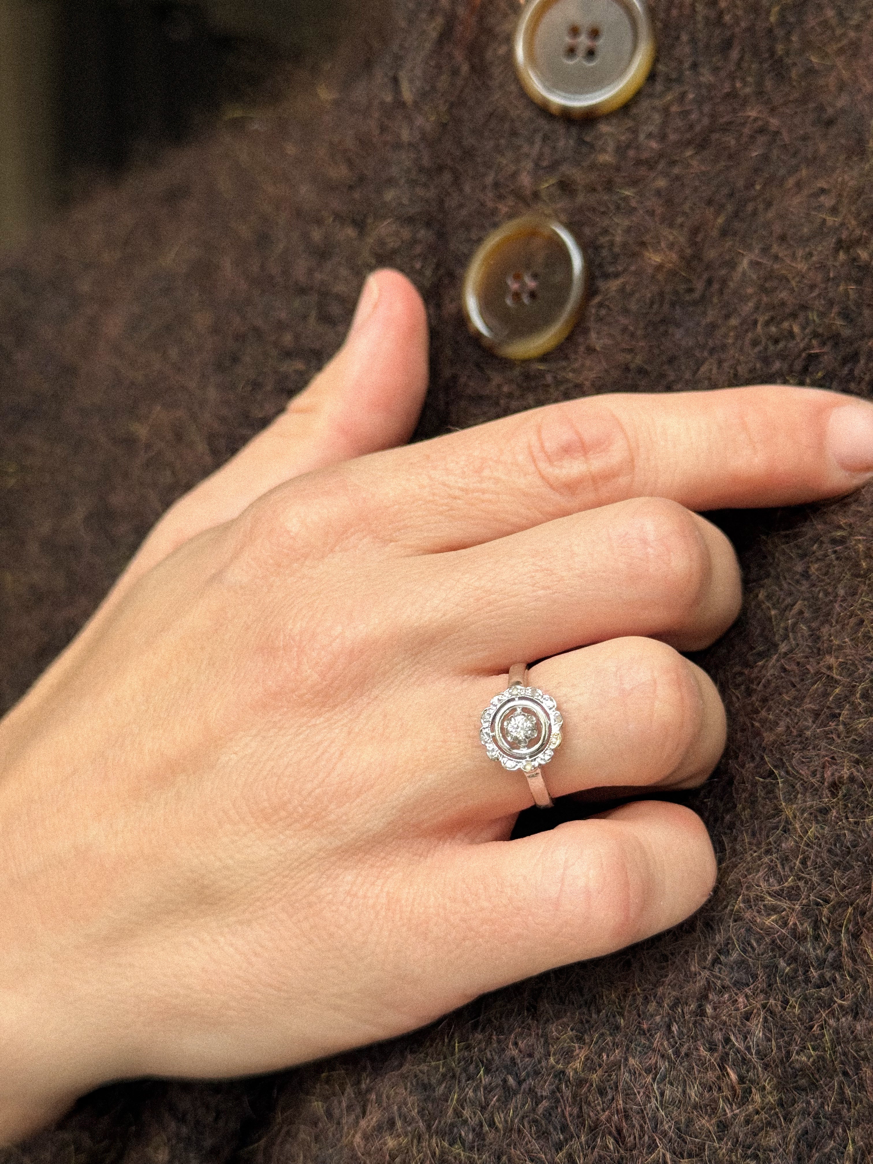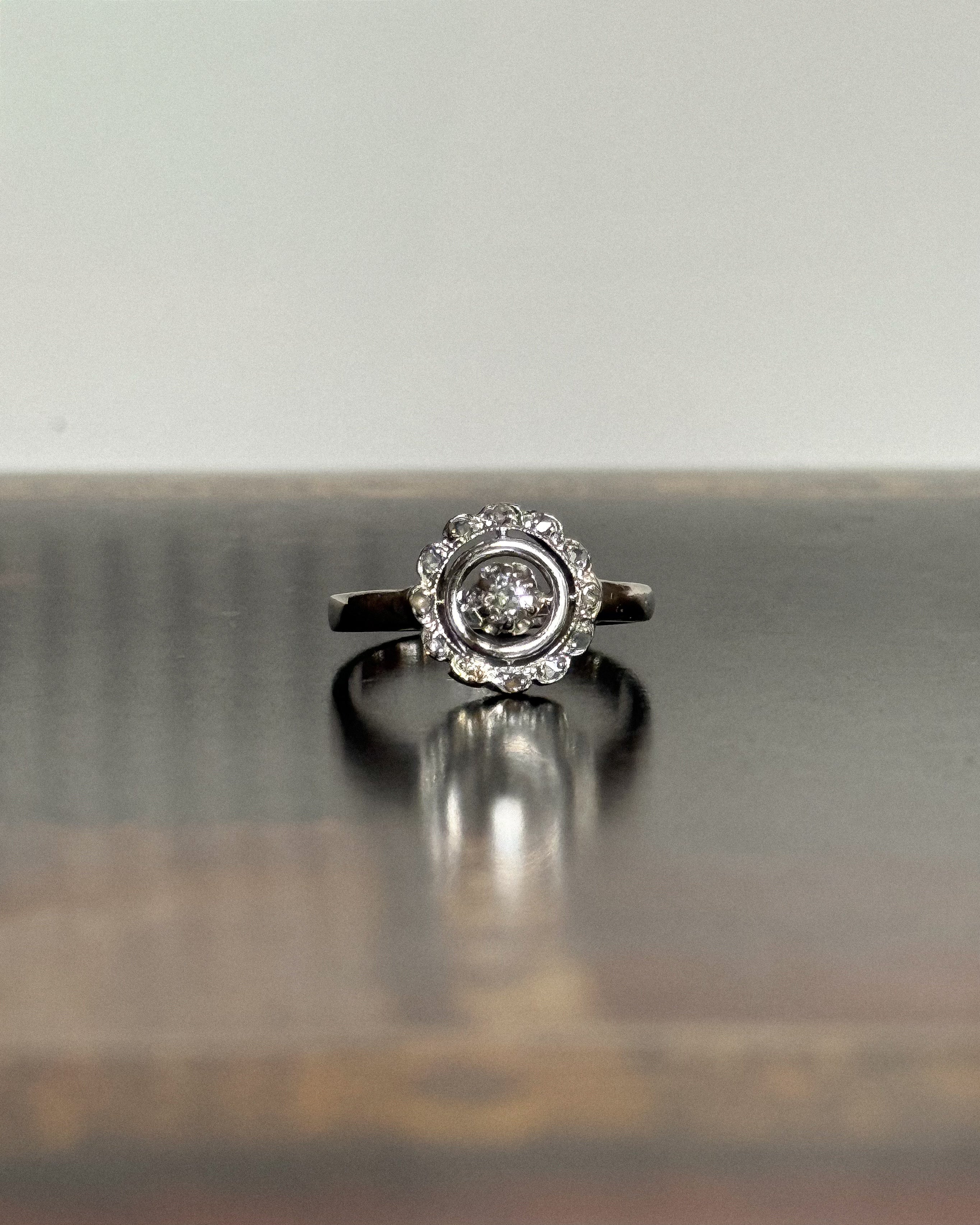 Témoin précieux d’un savoir-faire révolu, la bague fleur or blanc Maxine incarne l’élégance des bijoux façonnés au début du XXᵉ siècle. Son plateau circulaire, inspiré des motifs floraux de l’époque édouardienne, accueille en son cœur un diamant taille ancienne d’environ 0,10 carat, soigneusement maintenu par six griffes.