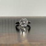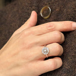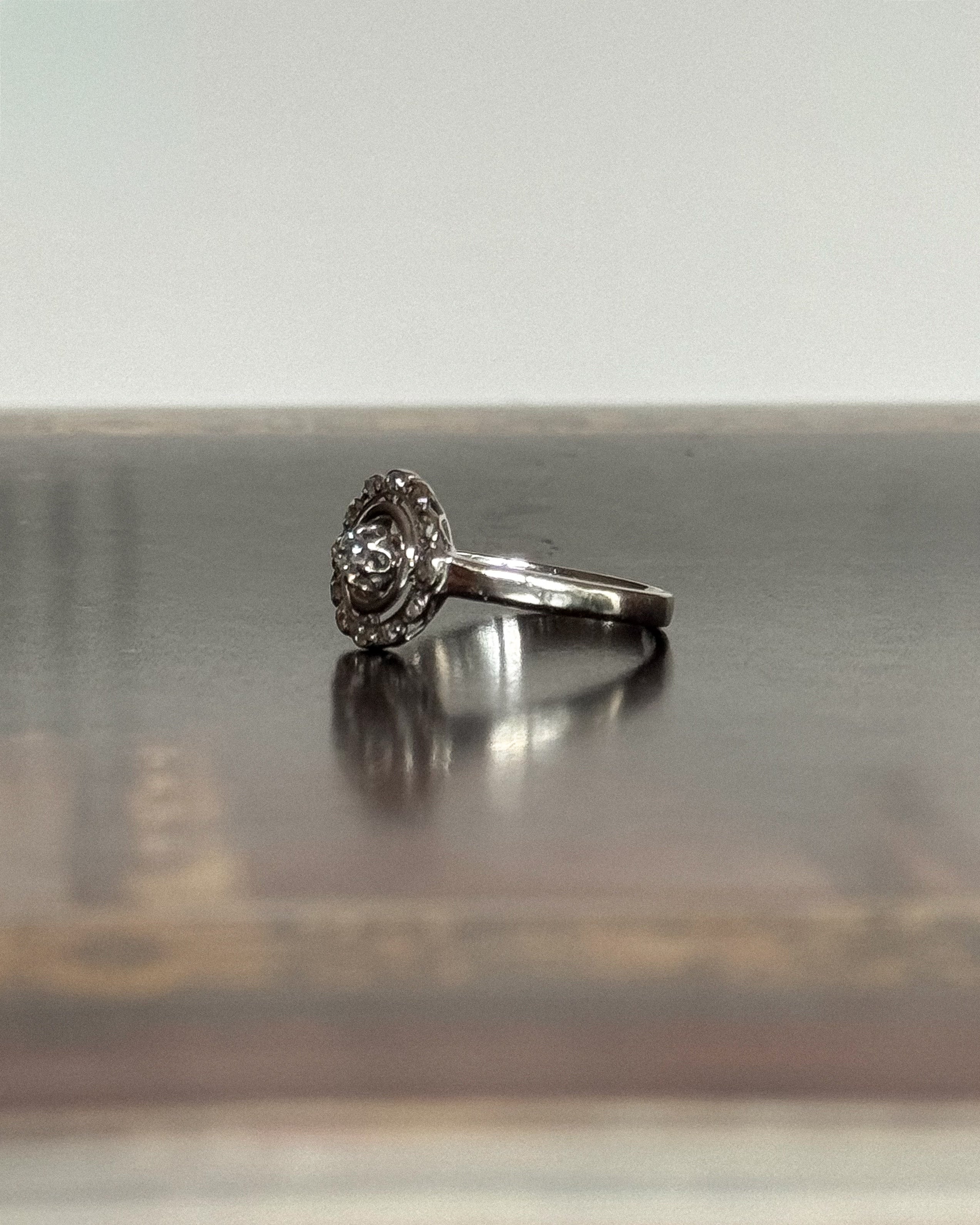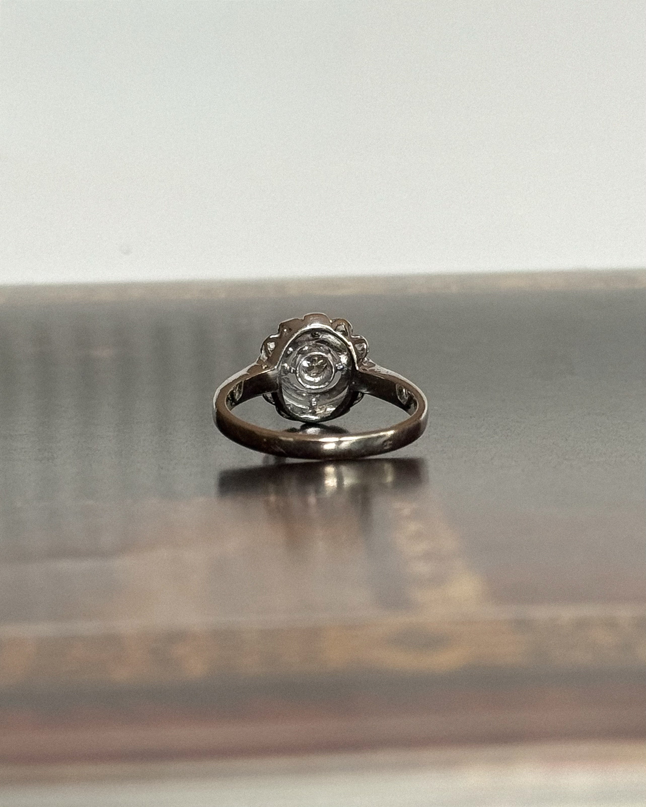 Autour de lui, une guirlande de diamants taillés en roses capte la lumière avec une brillance douce, typique des pièces d’époque. L’or blanc 18 carats, rare à l’époque, souligne le raffinement discret de ce bijou ancien restauré, dont l’anneau a été solidement consolidé sans altérer sa structure d’origine.