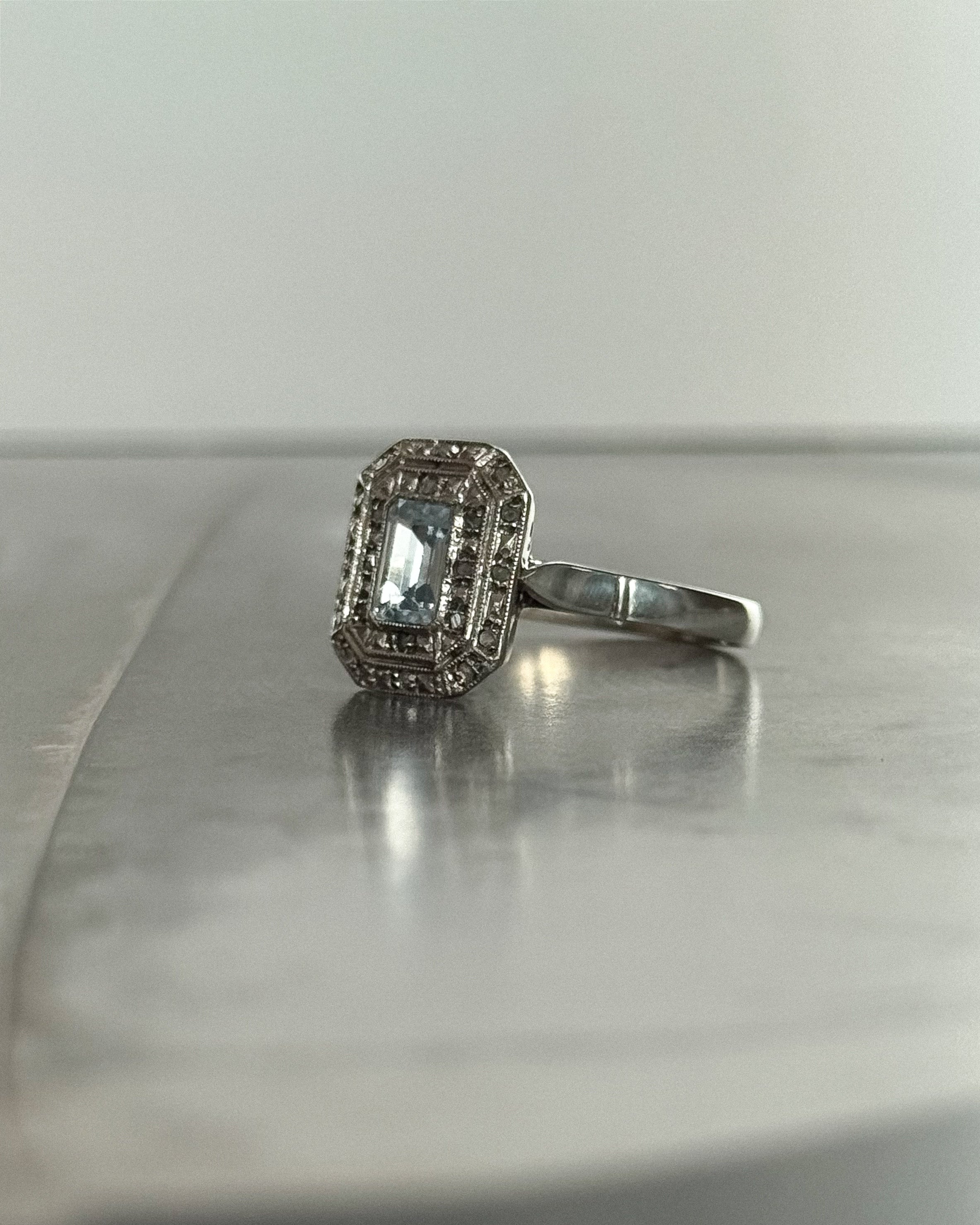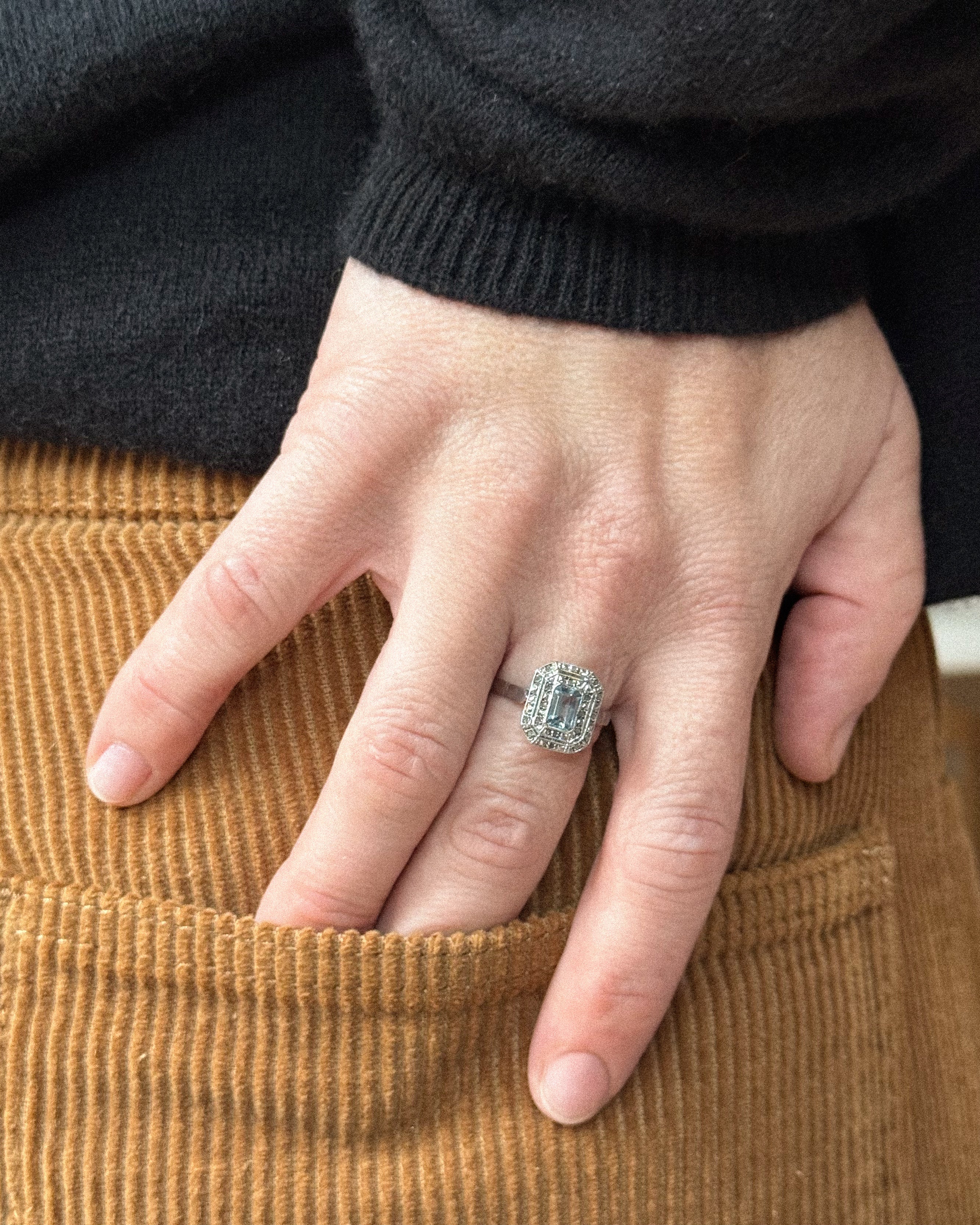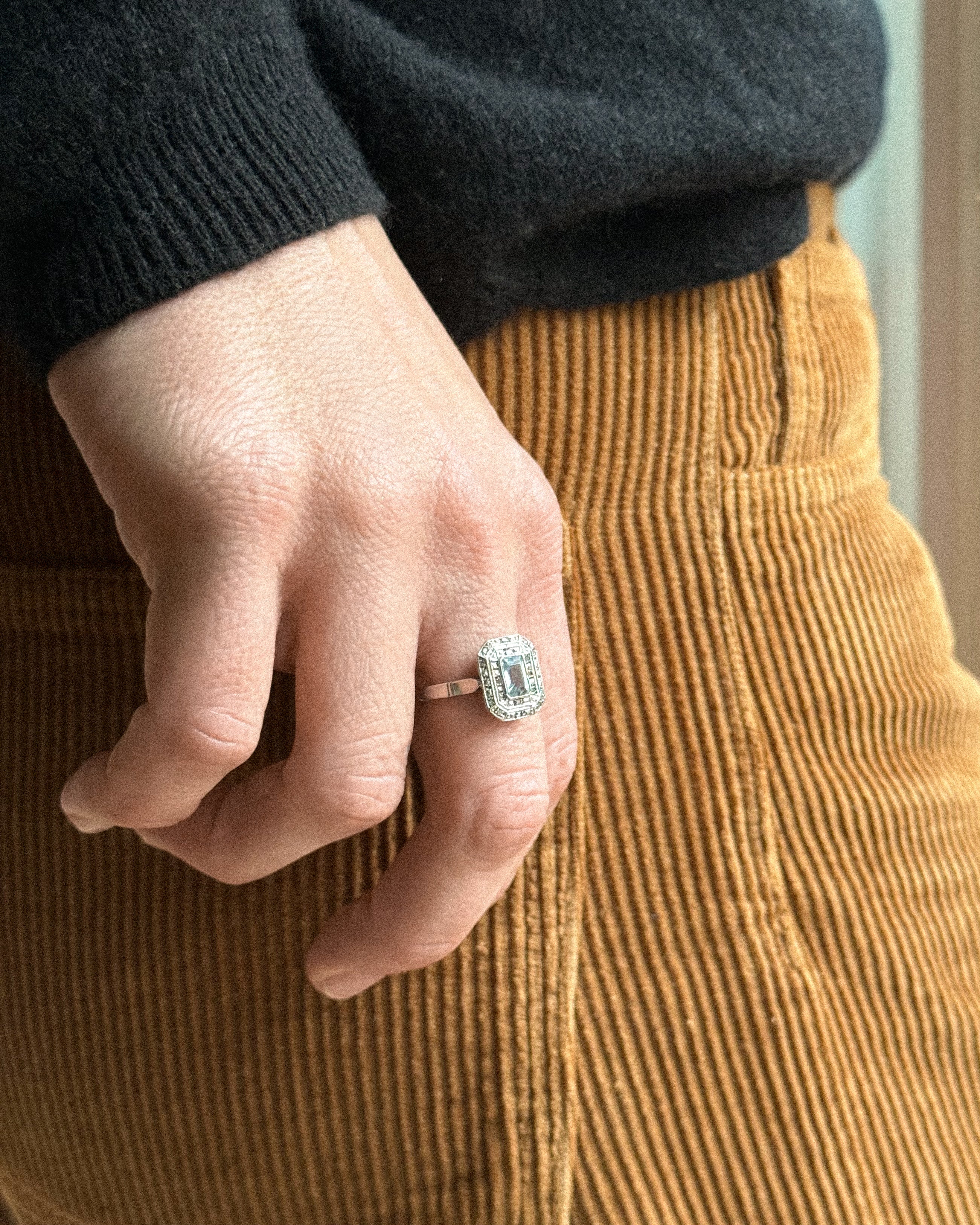 Son plateau octogonal, d’une grande pureté, rappelle les architectures Art Déco, où la symétrie et le détail se faisaient bijoux. En son centre, une aigue-marine rectangulaire à pans coupés offre une transparence cristalline, presque céleste. Sa teinte bleu pâle capte la lumière avec subtilité, comme un souffle d’air glacé glissé sur la peau.
