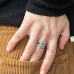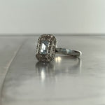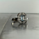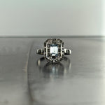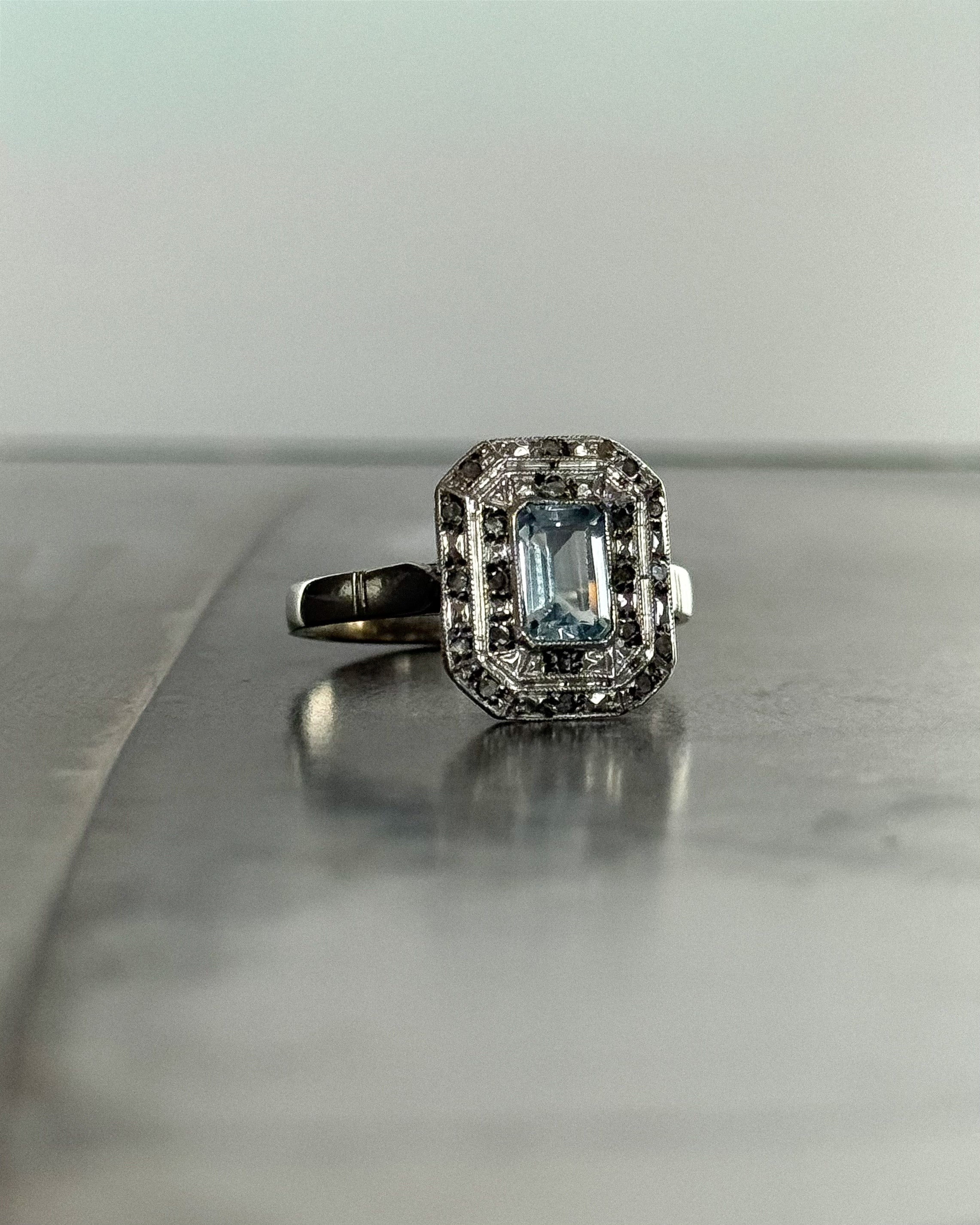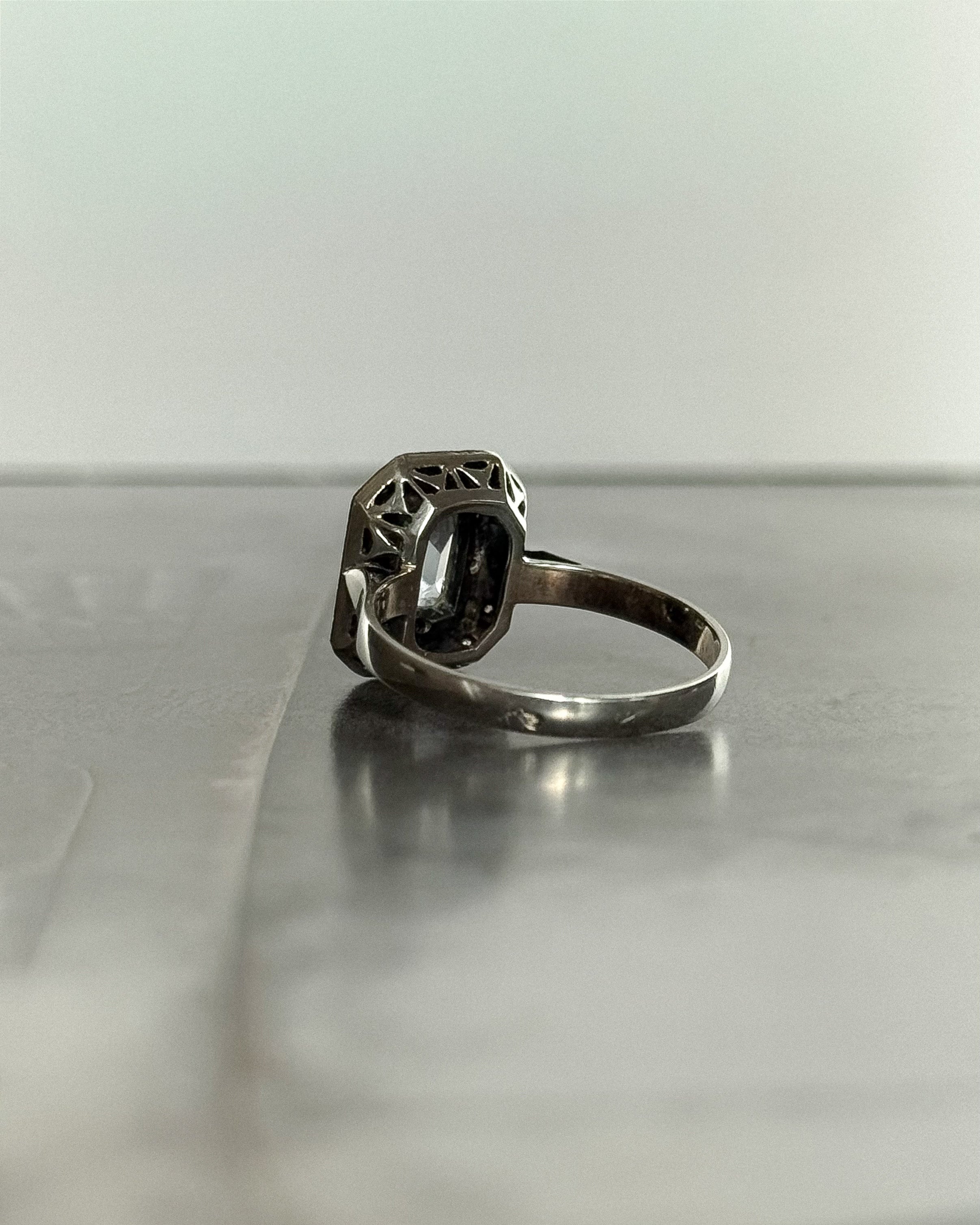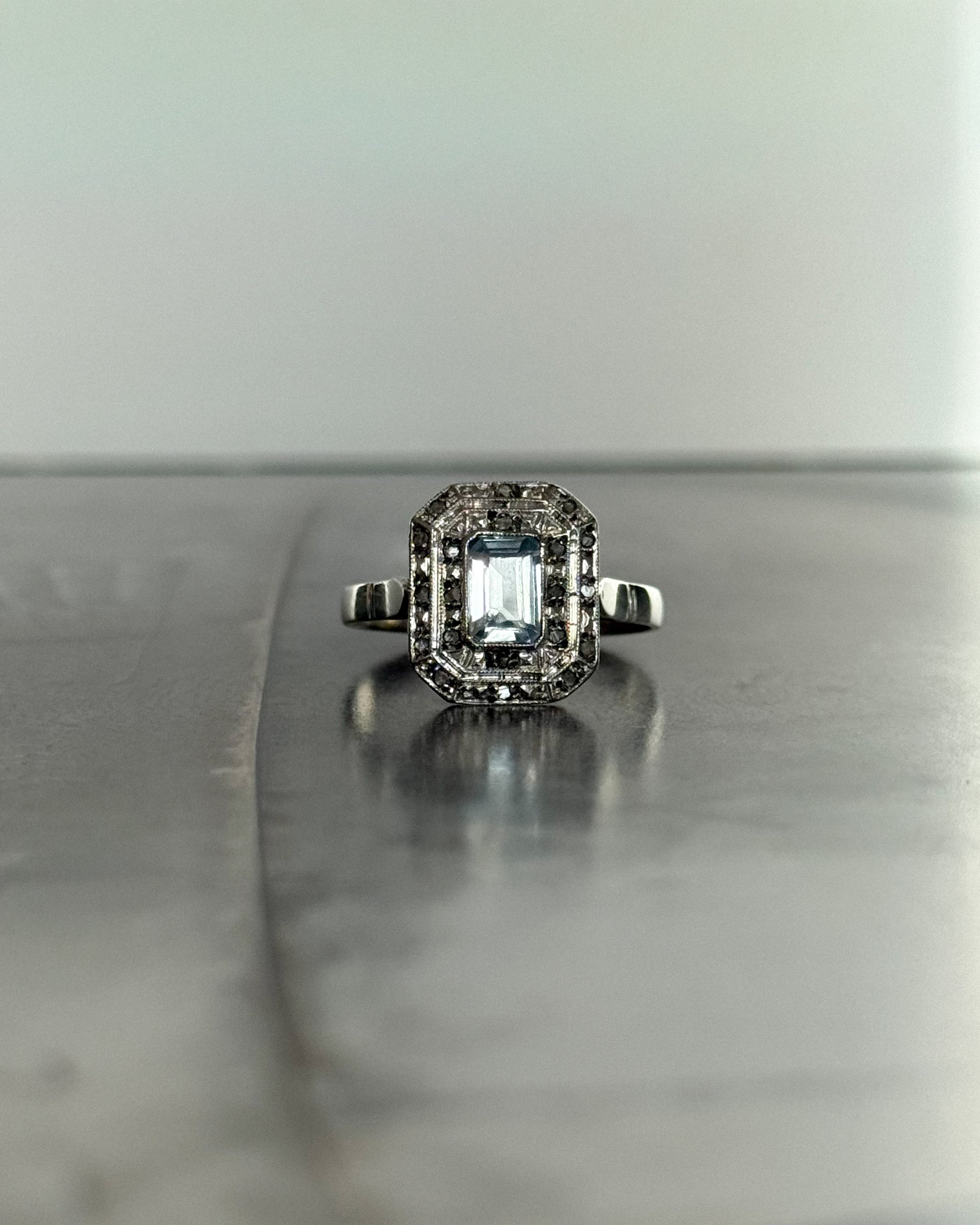 Son plateau octogonal, d’une grande pureté, rappelle les architectures Art Déco, où la symétrie et le détail se faisaient bijoux. En son centre, une aigue-marine rectangulaire à pans coupés offre une transparence cristalline, presque céleste. Sa teinte bleu pâle capte la lumière avec subtilité, comme un souffle d’air glacé glissé sur la peau.