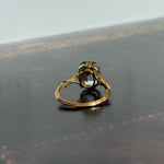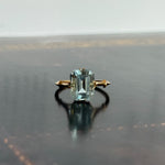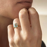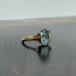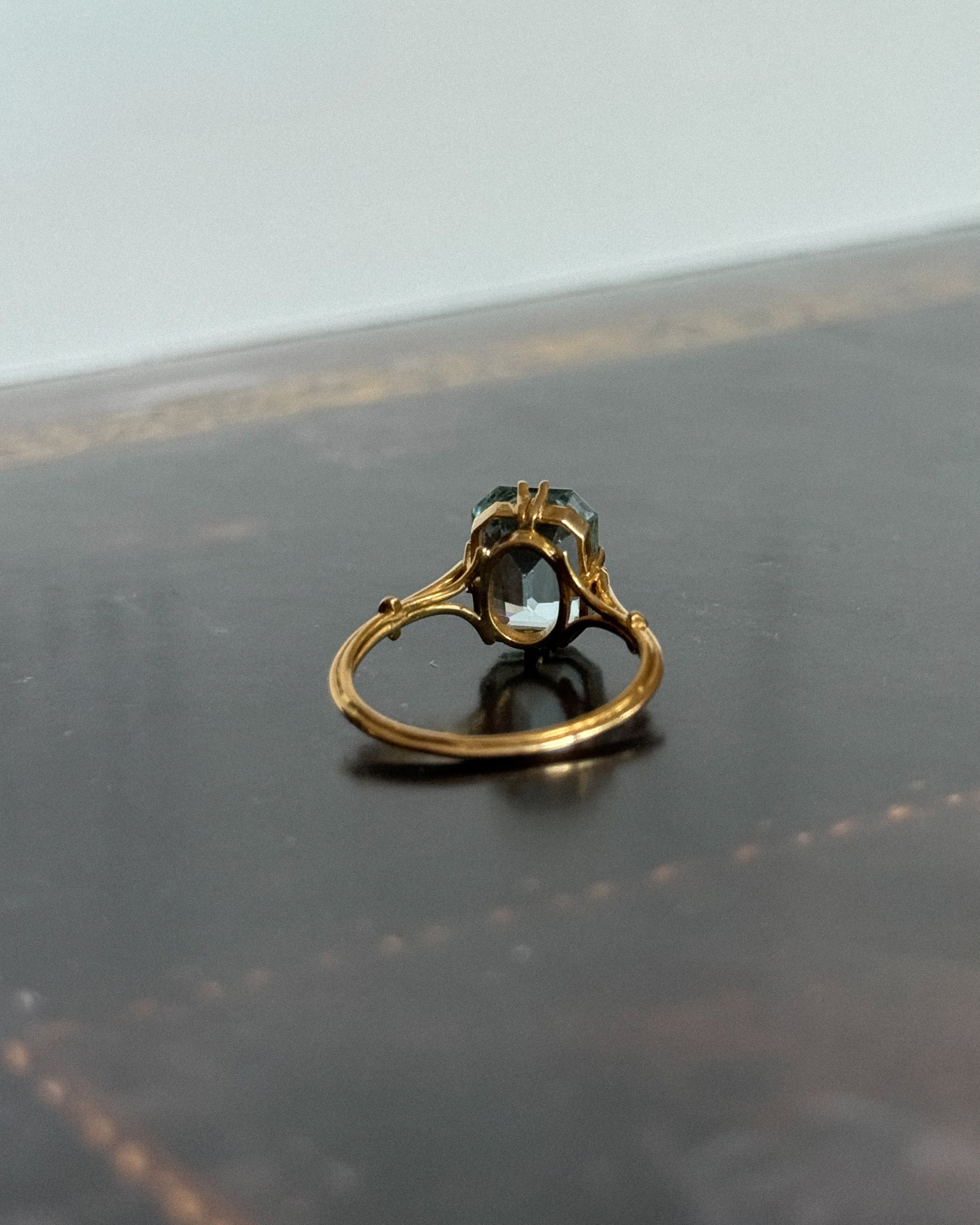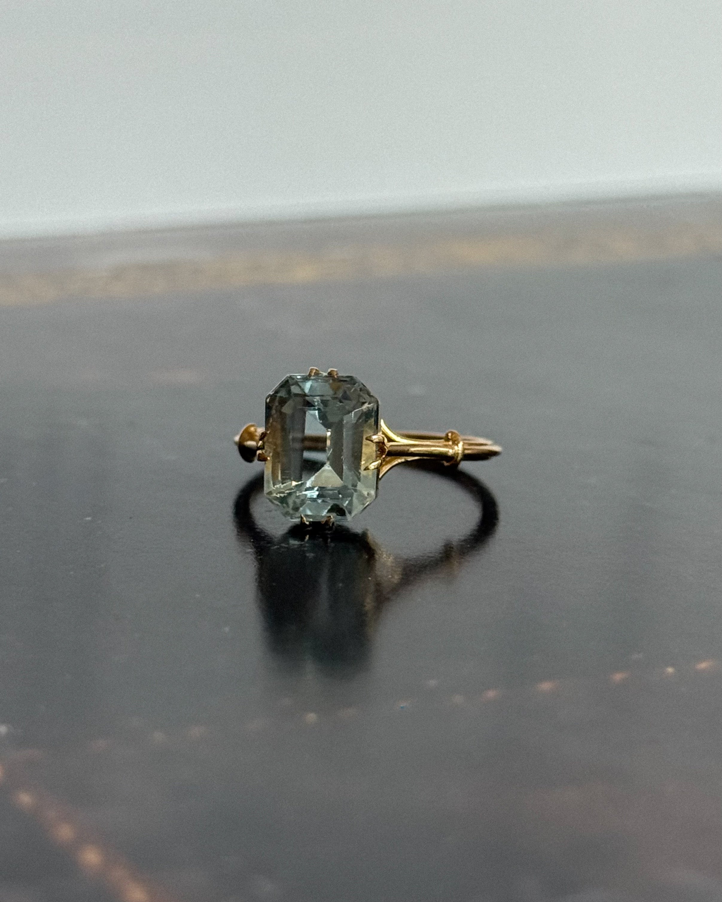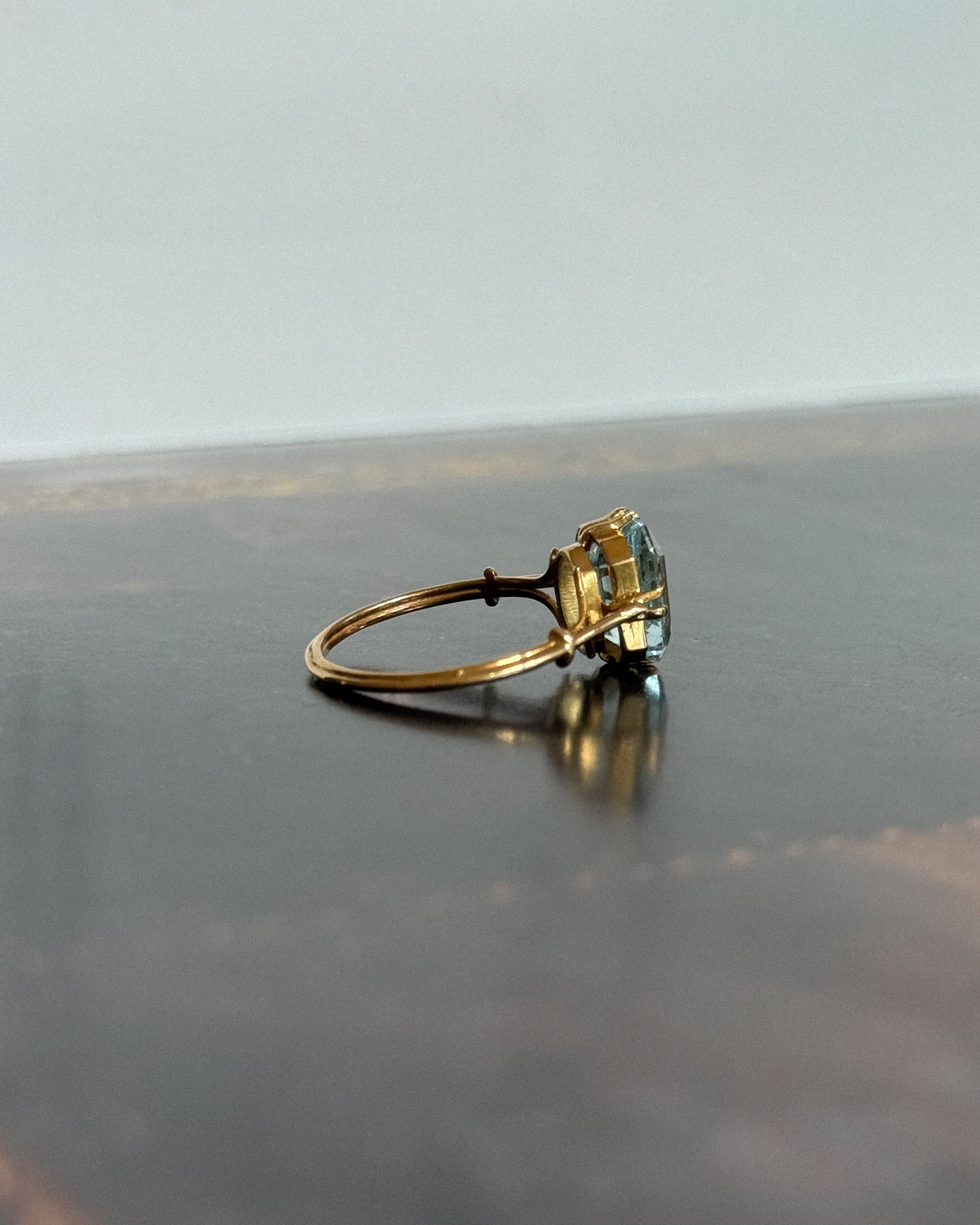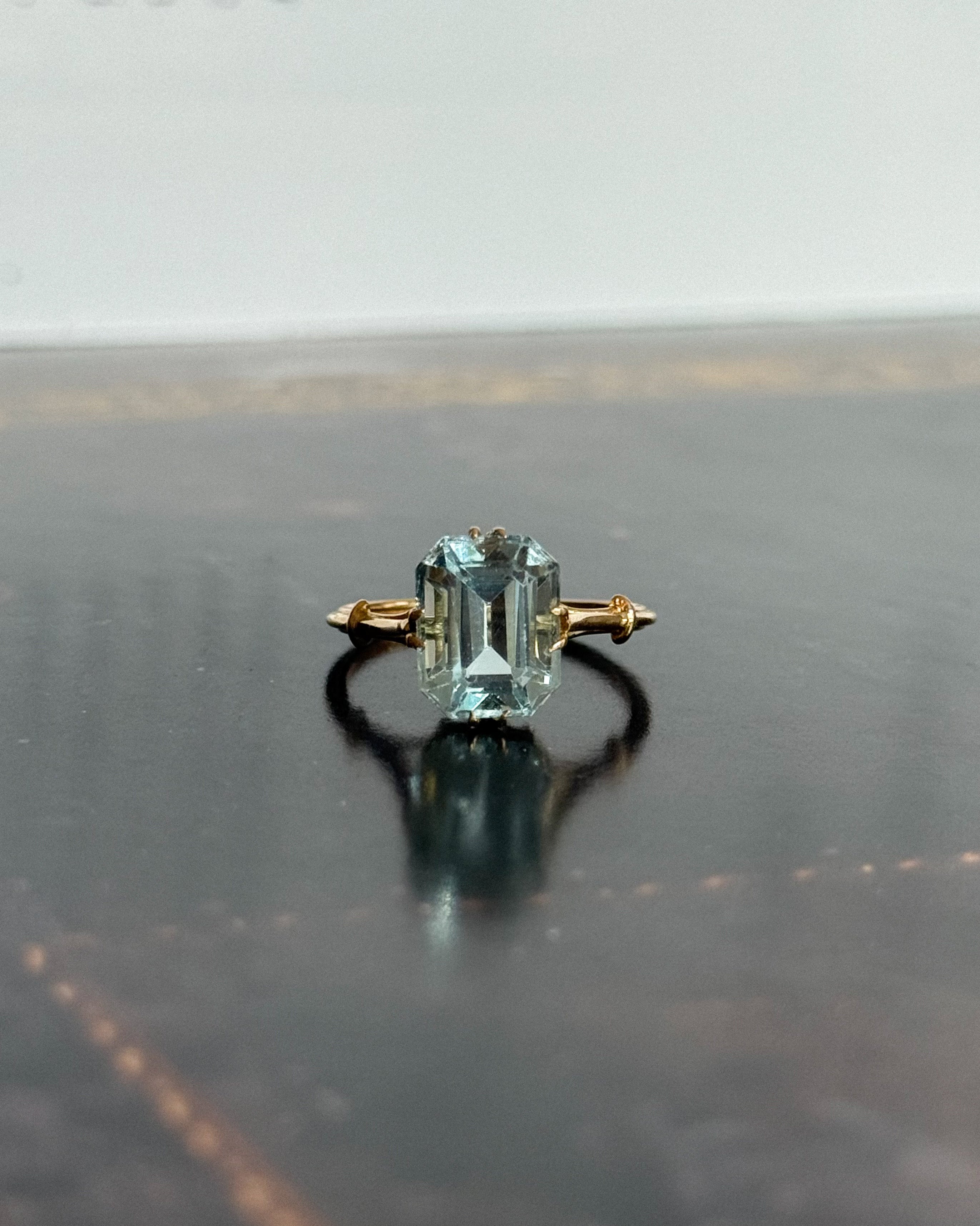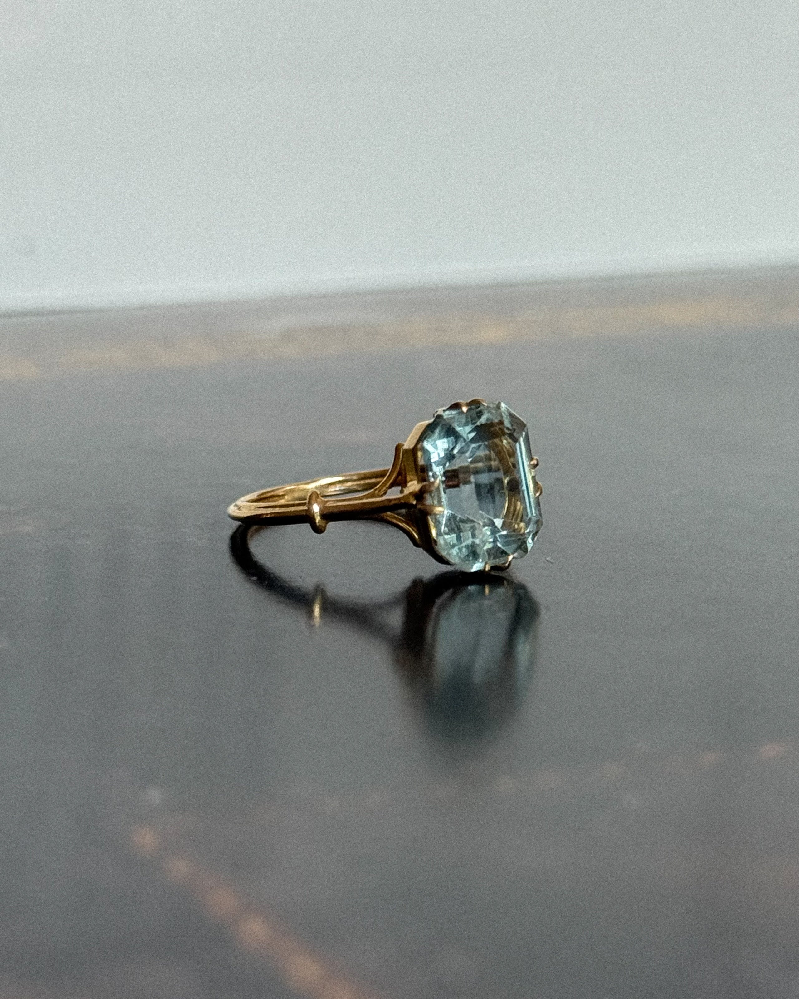 Cette bague aigue-marine vintage illustre une maîtrise joaillière rare. L’or jaune 18 carats, travaillé en anneau double, assure à la fois solidité et finesse visuelle. Sa monture corbeille, montée sur deux niveaux, optimise l’exposition de la pierre à la lumière, révélant l'éclat de l’aigue-marine, taille coussin, soigneusement facettée pour intensifier la réfraction.