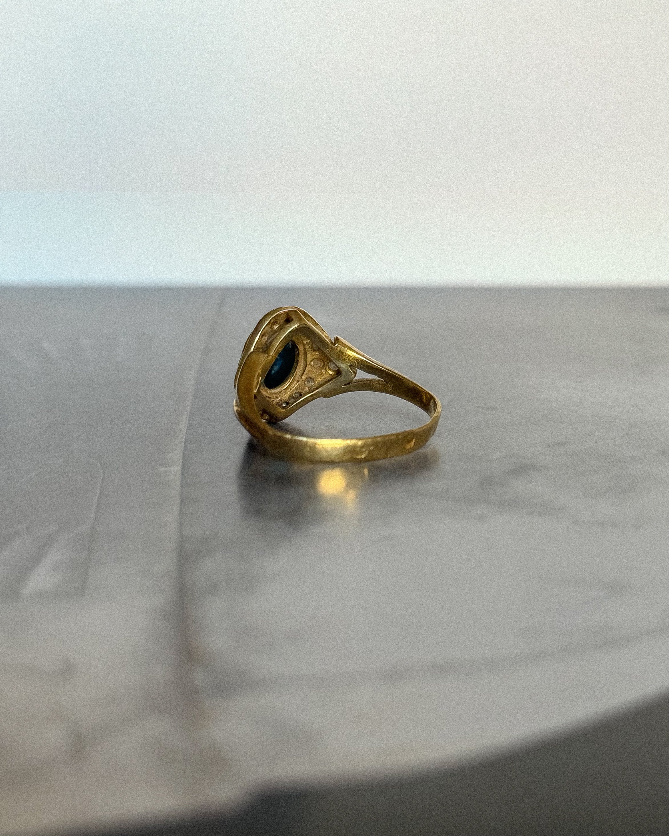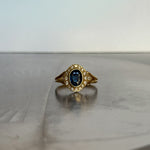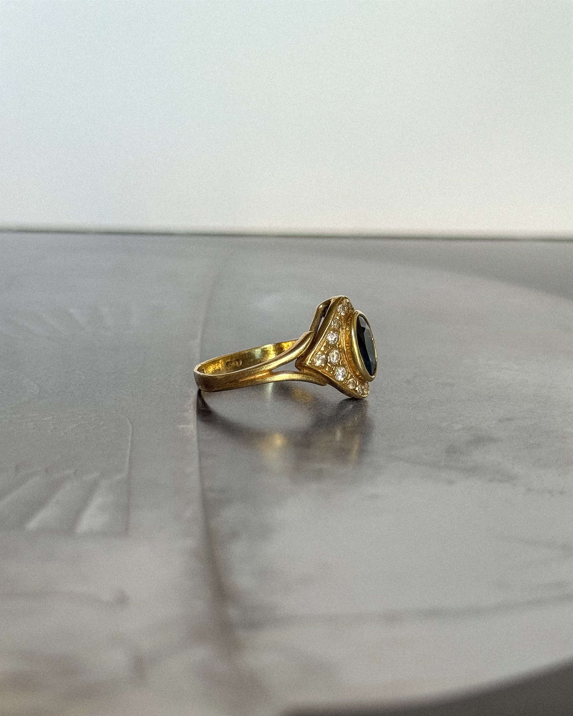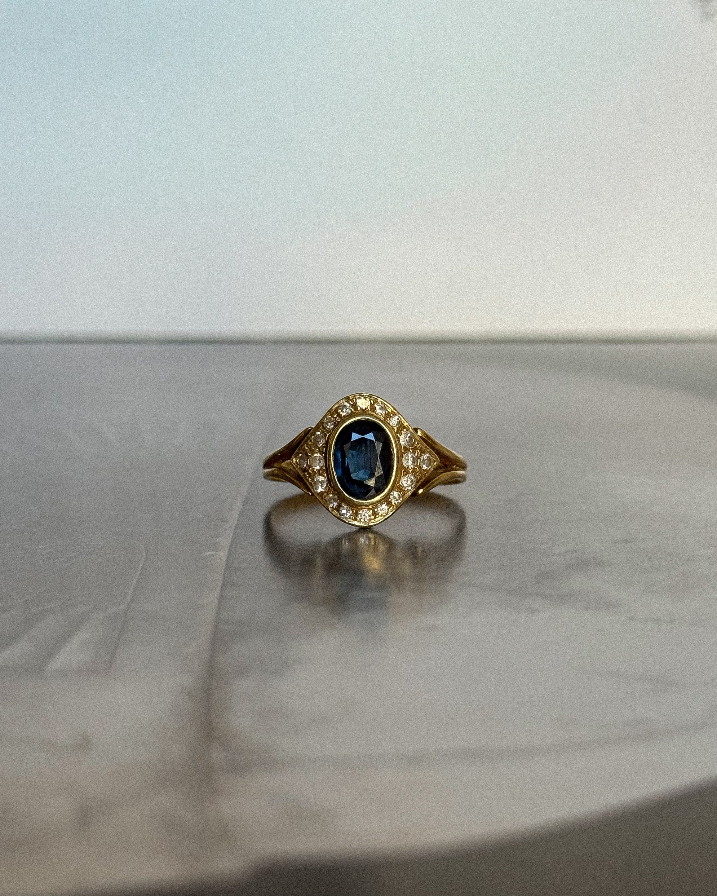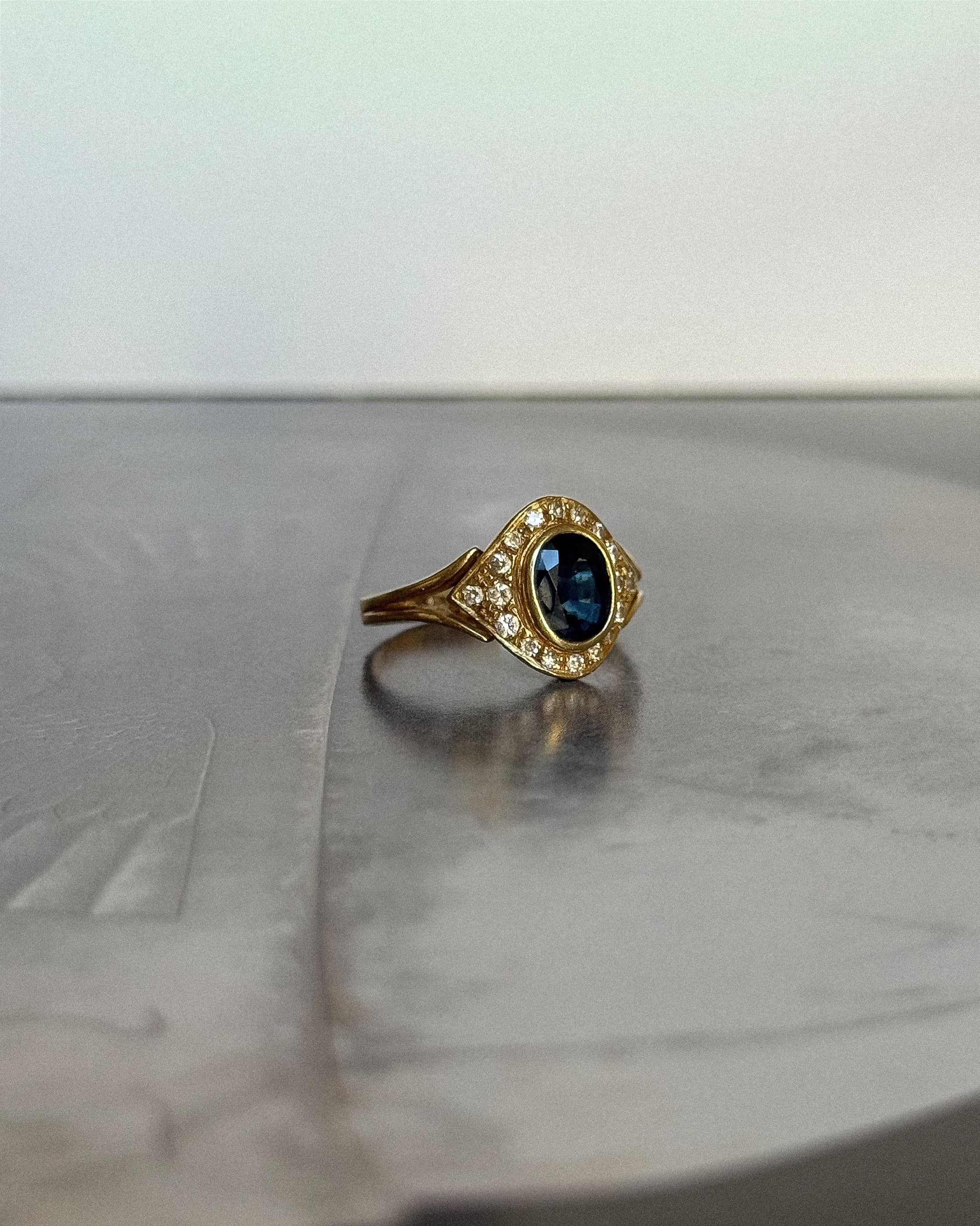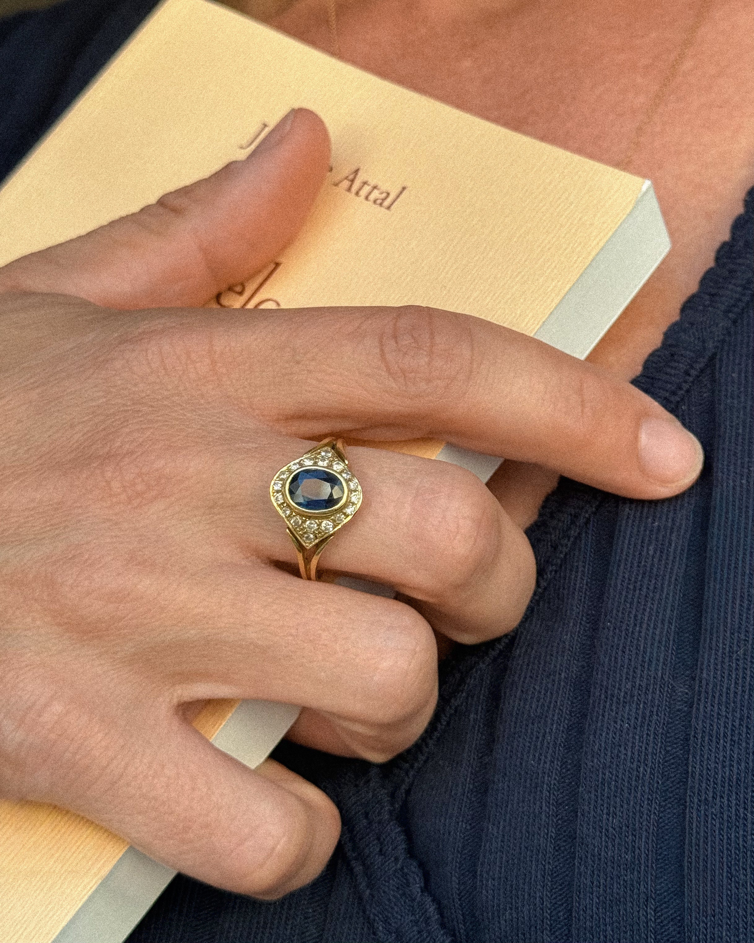 La bague vintage saphir Octavia incarne la noblesse du travail italien vintage, alliant précision artisanale et force expressive. Son saphir facetté ovale, d’environ 1,5 carats, capte la lumière avec intensité grâce à un serti clos parfaitement ajusté, garant d’une excellente tenue au quotidien.