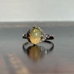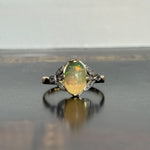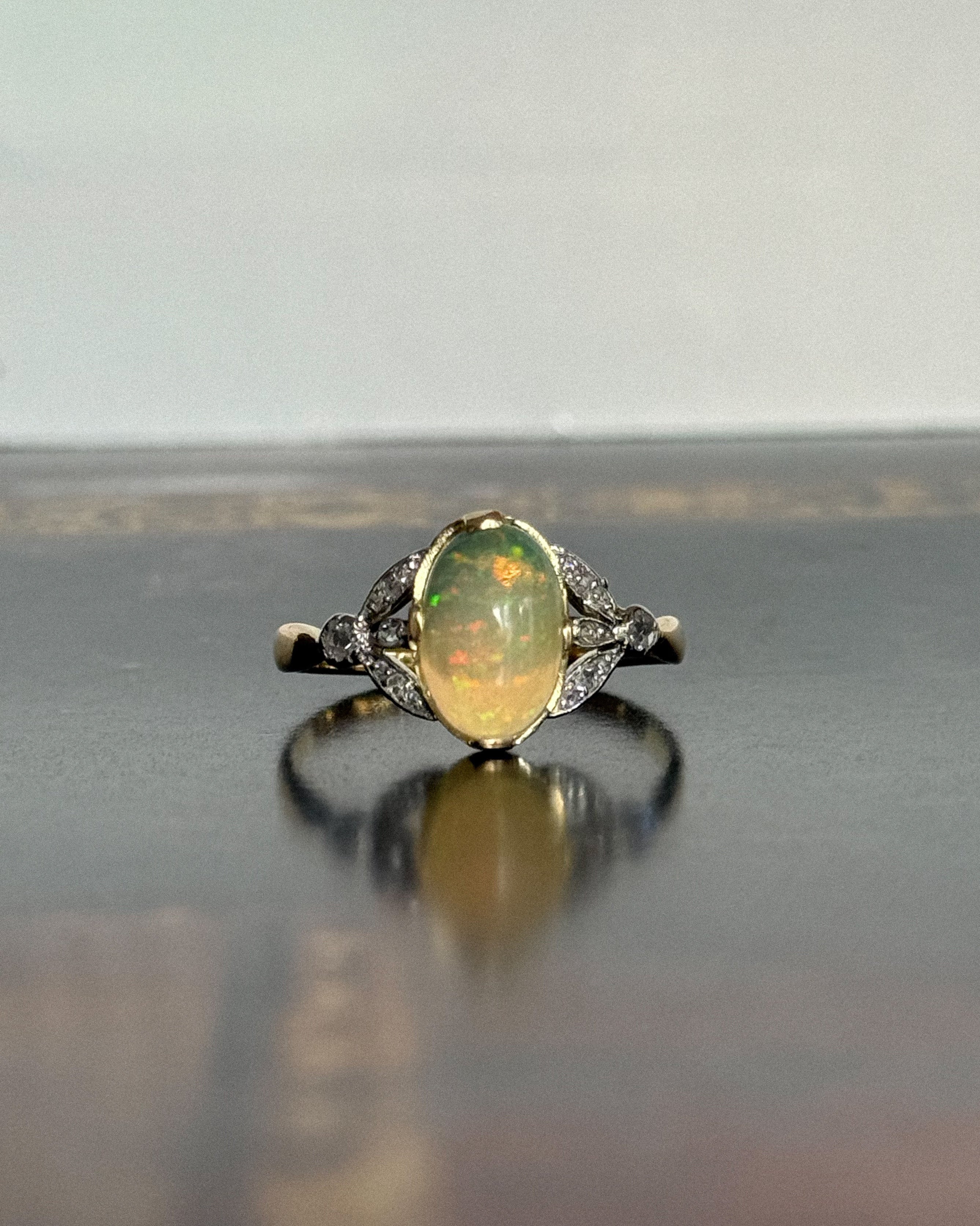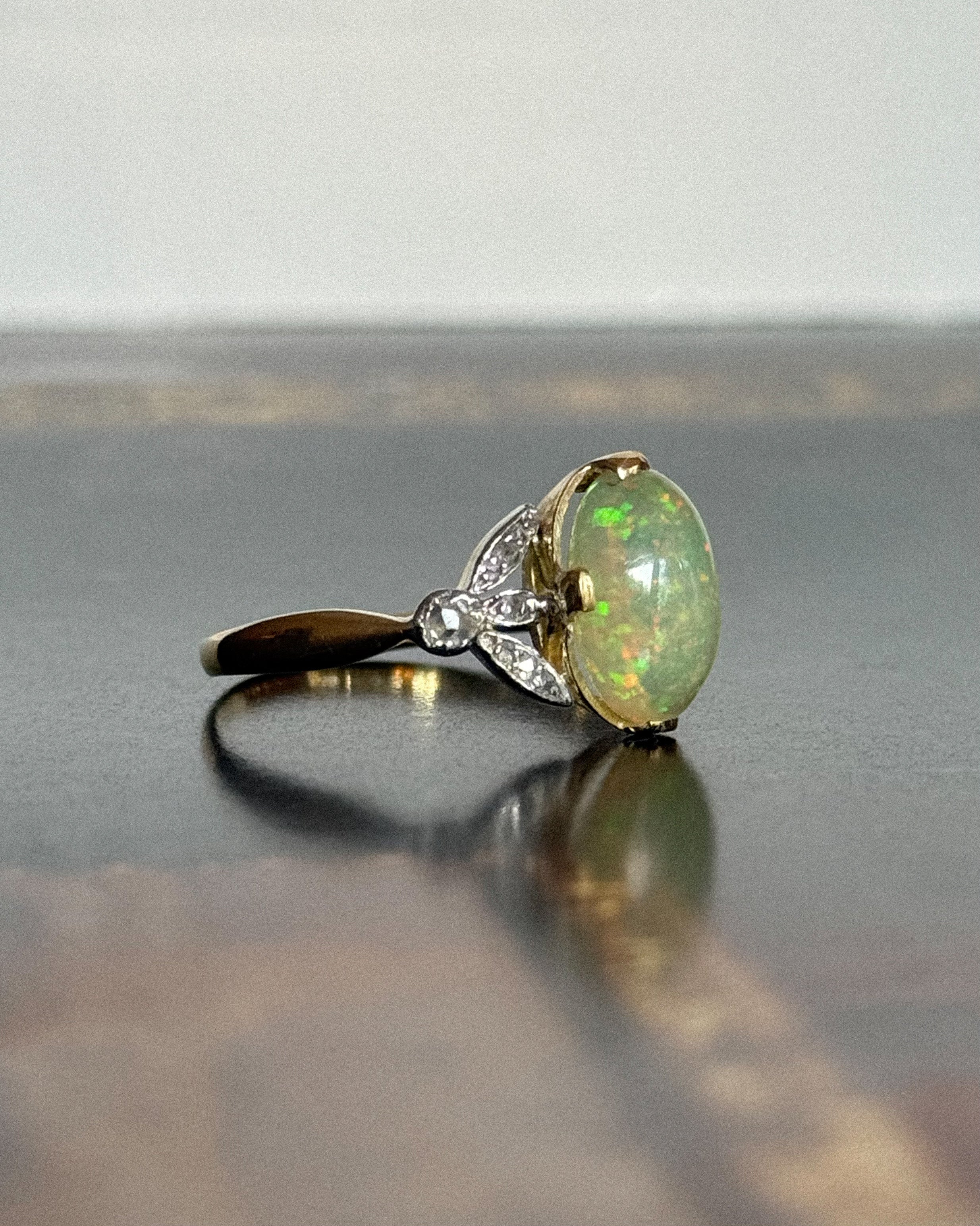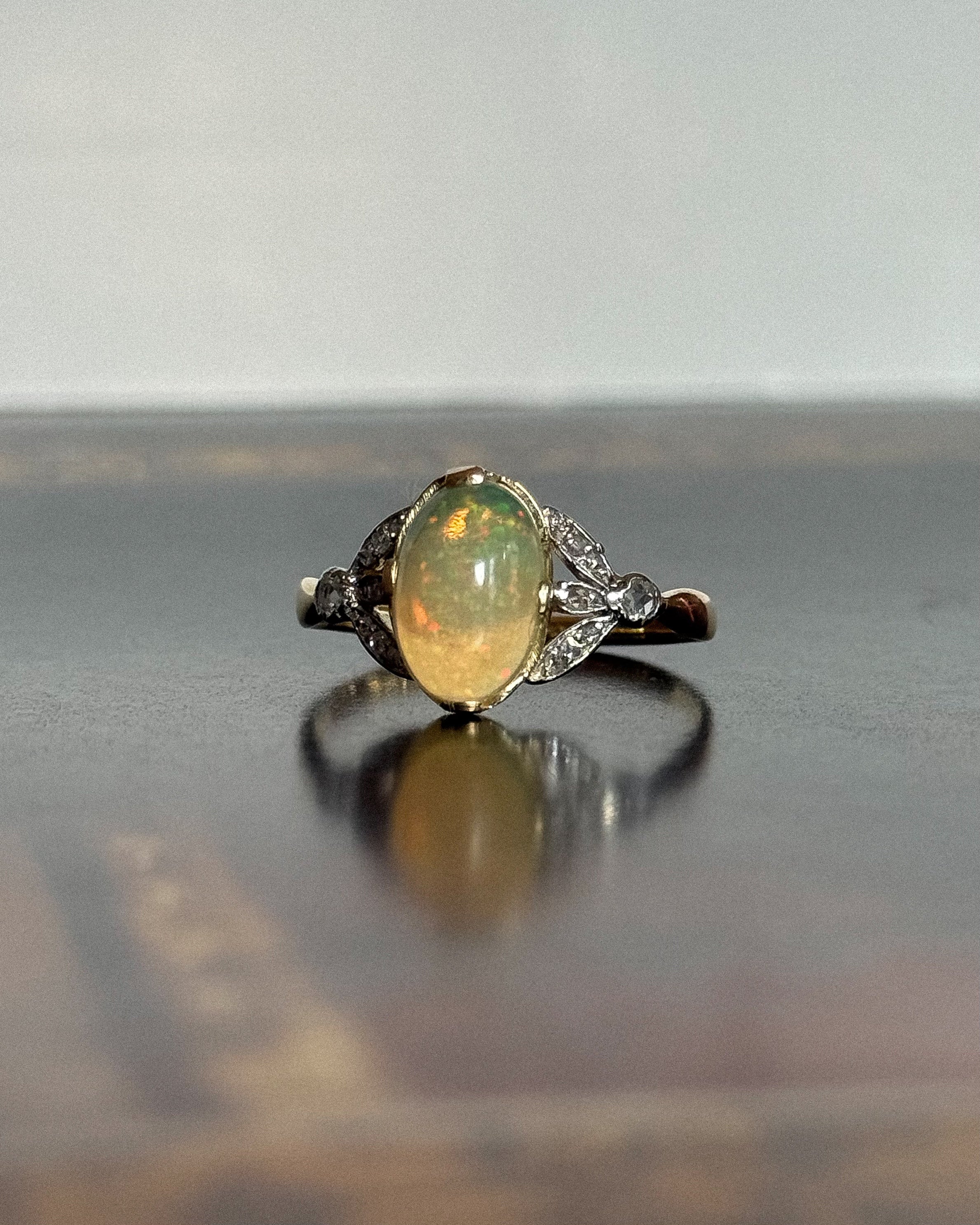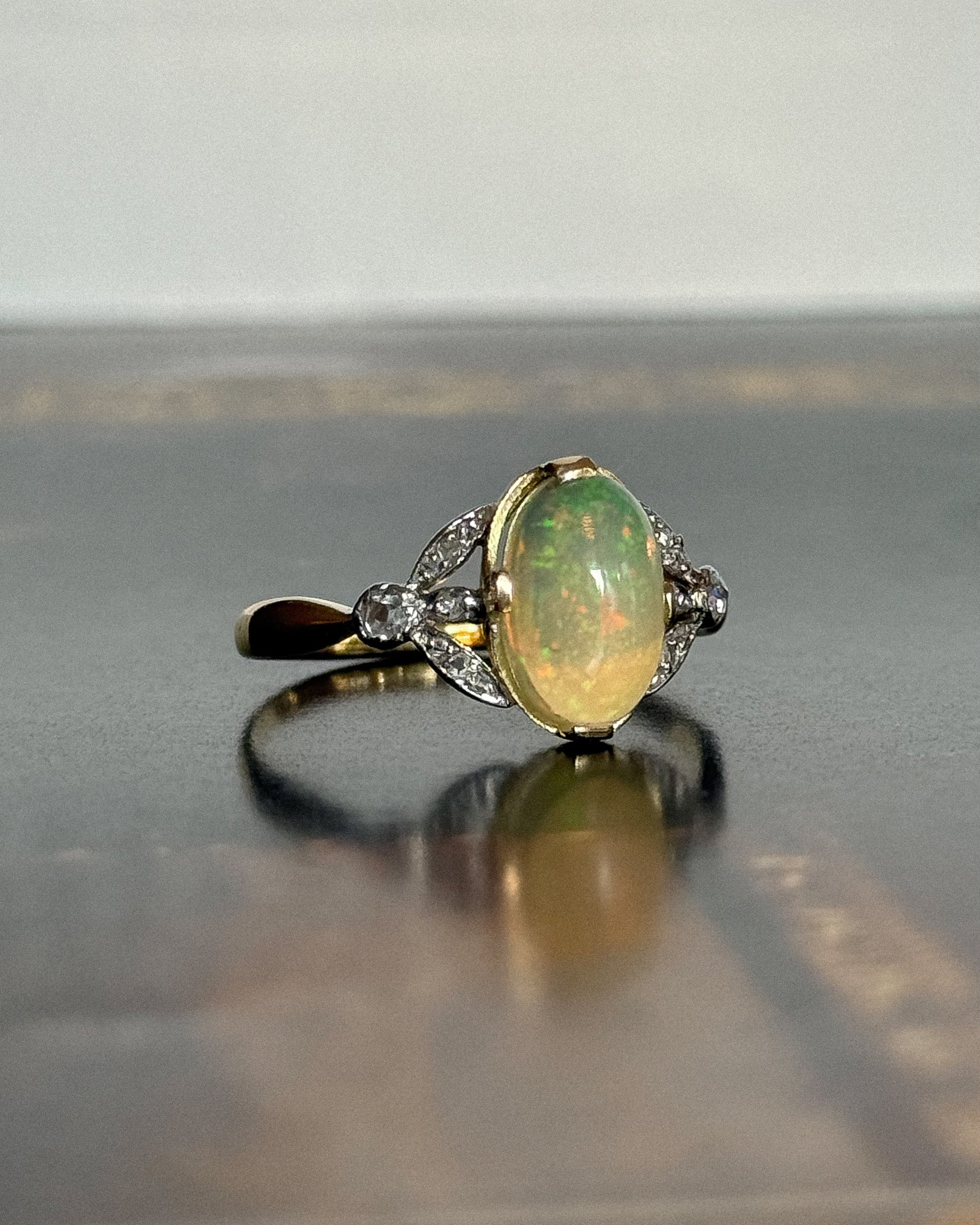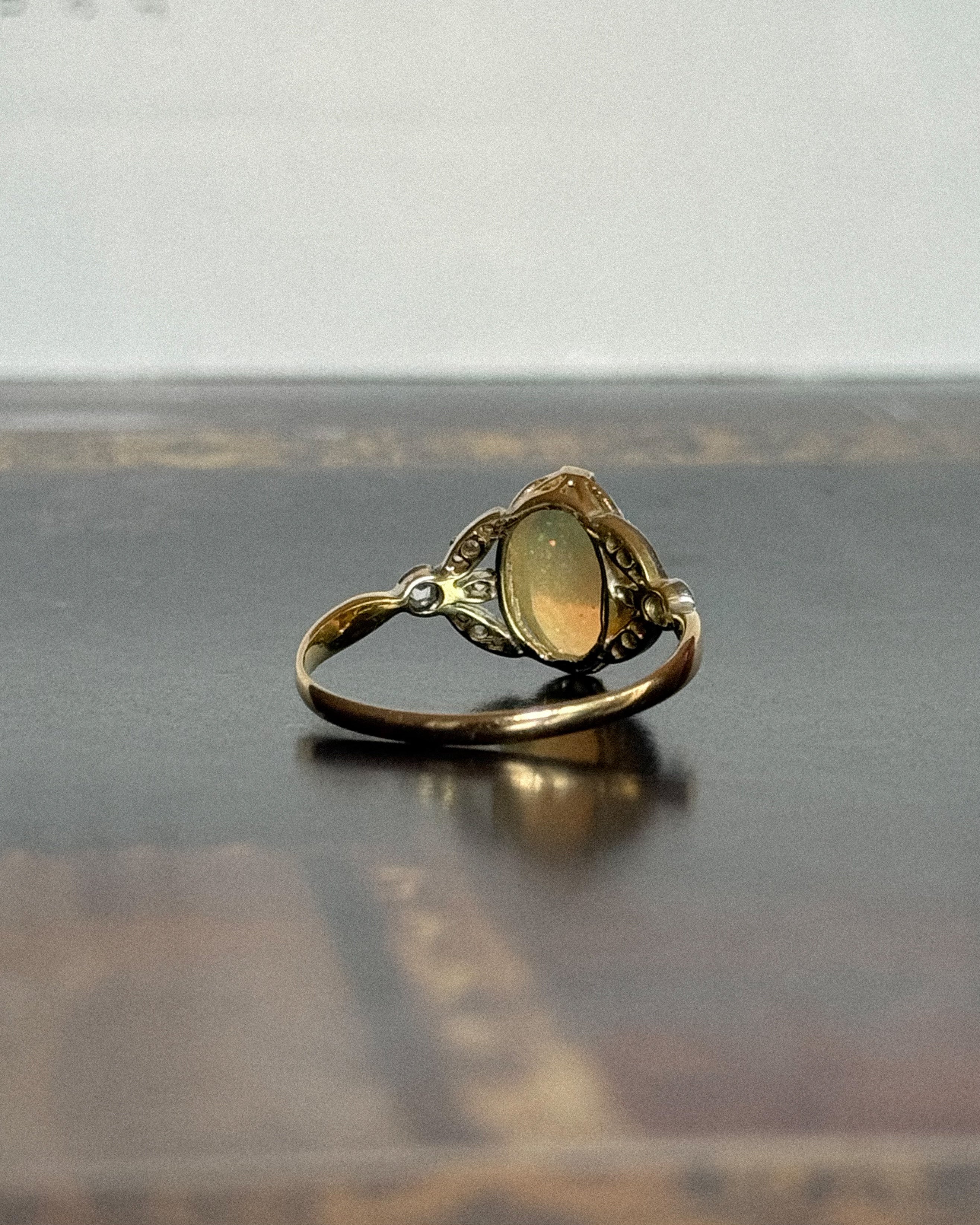 Cette bague opale ancienne, datée des années 1890 environ, reflète avec justesse l’esthétique Art Nouveau, mêlant inspiration végétale et savoir-faire d’orfèvre.