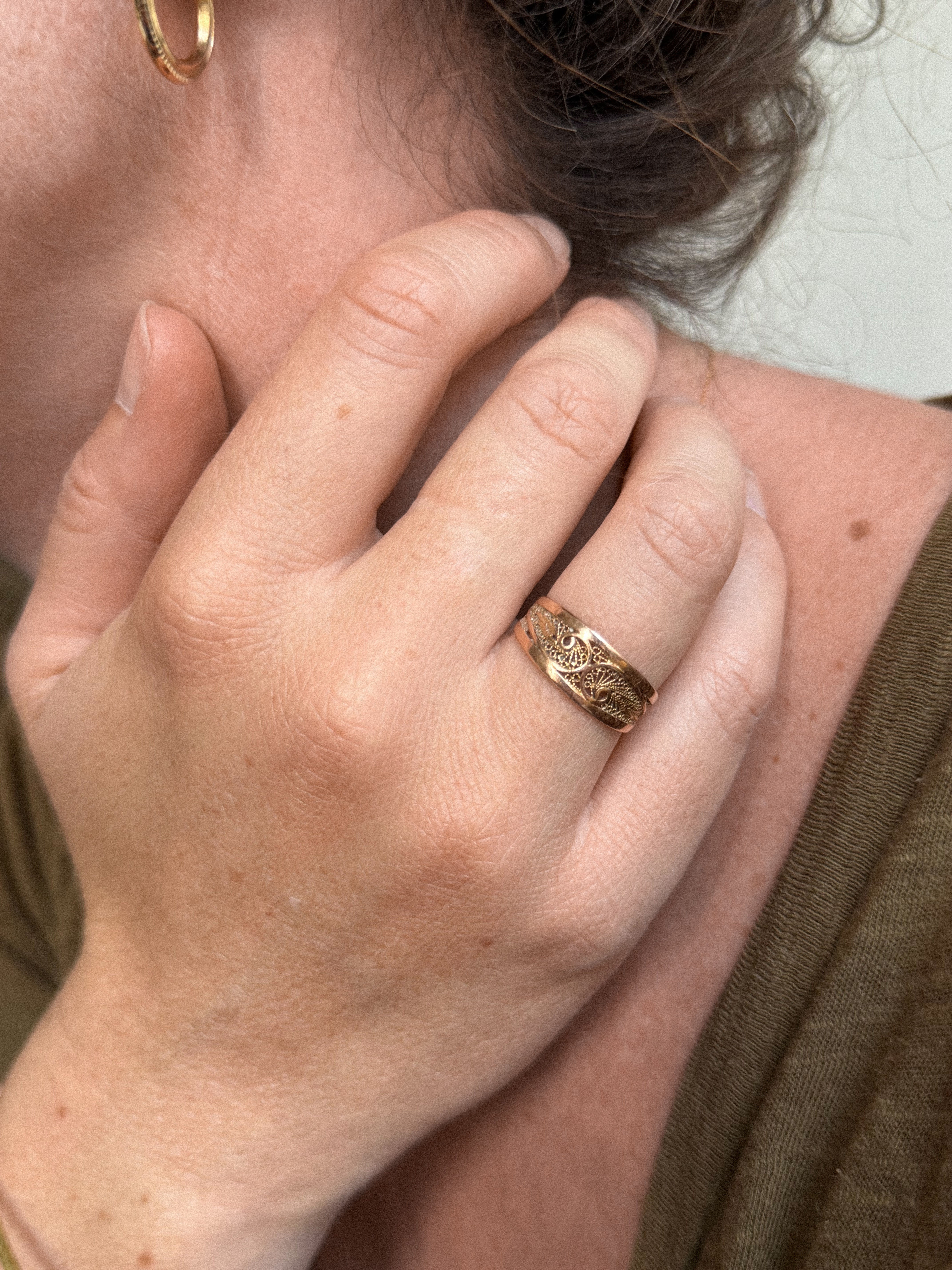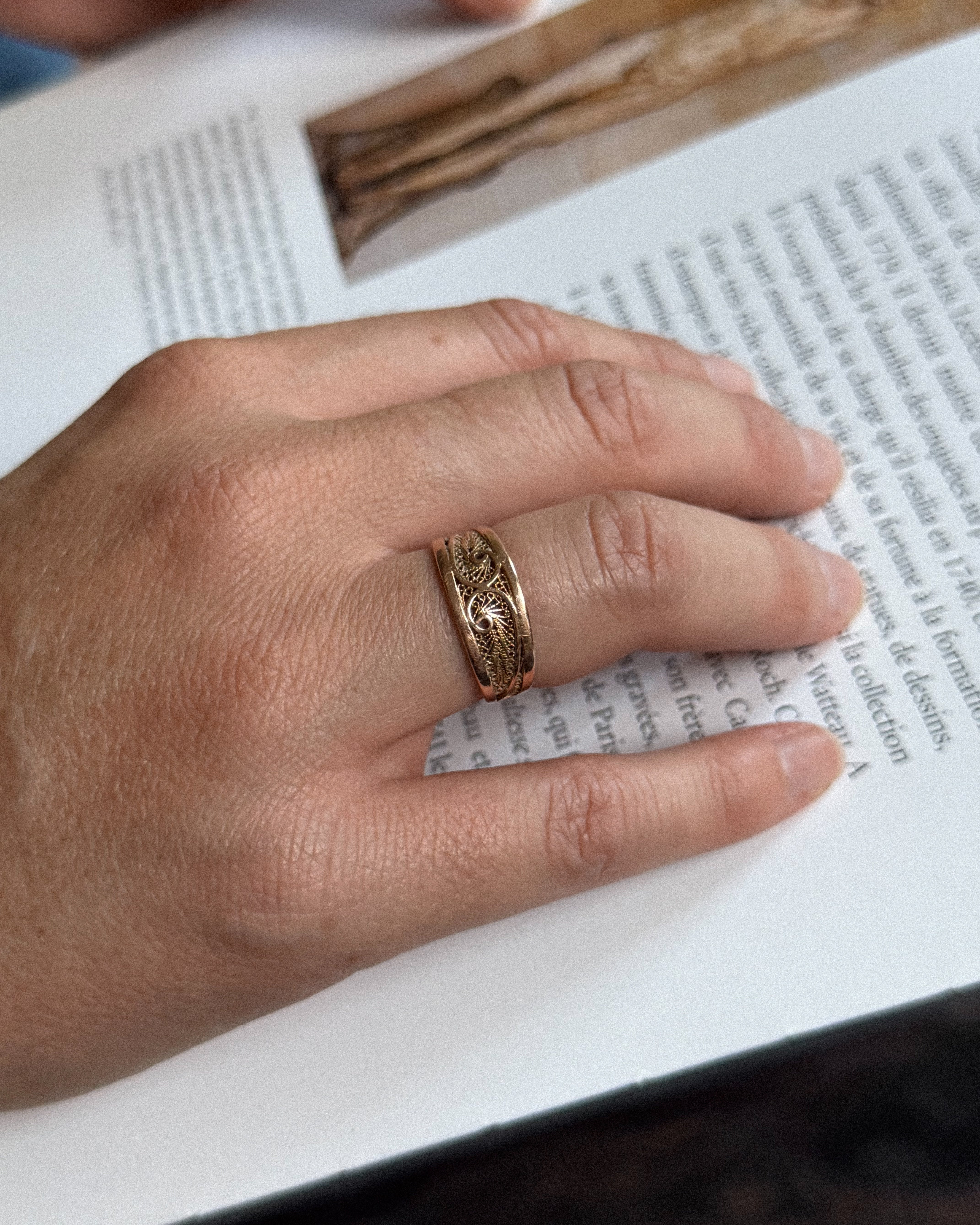 Cette bague or filigrané séduit par la douceur de sa matière, mais aussi par l’équilibre de sa forme bandeau, stable et confortable.