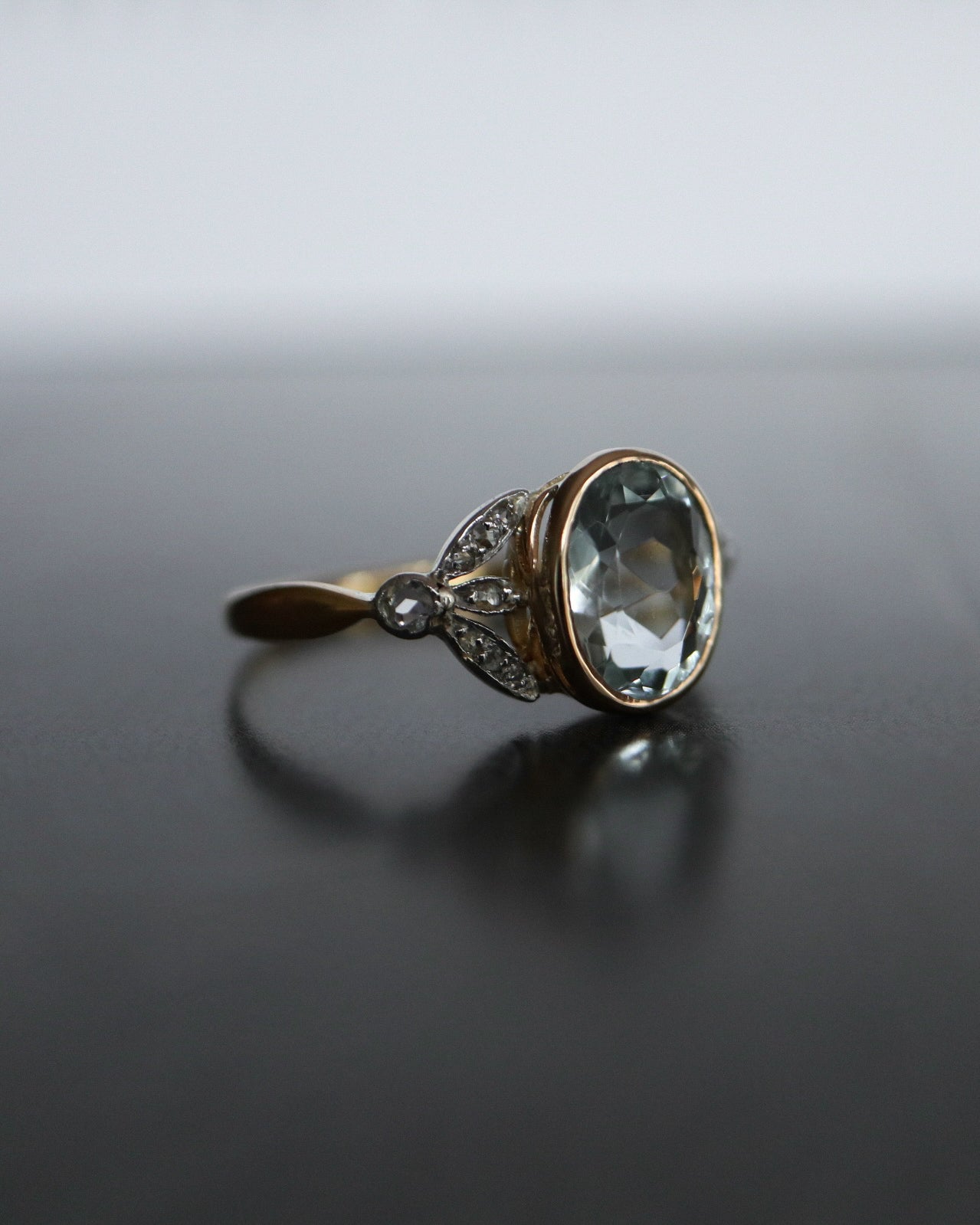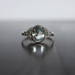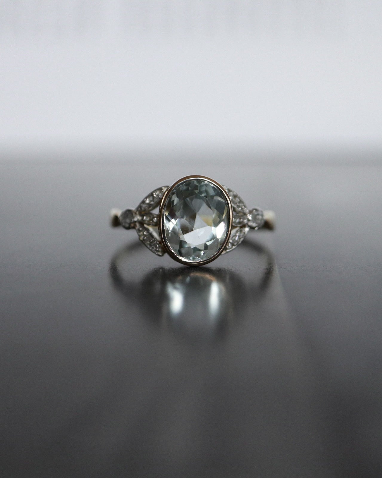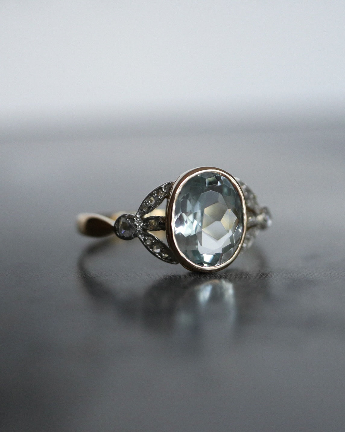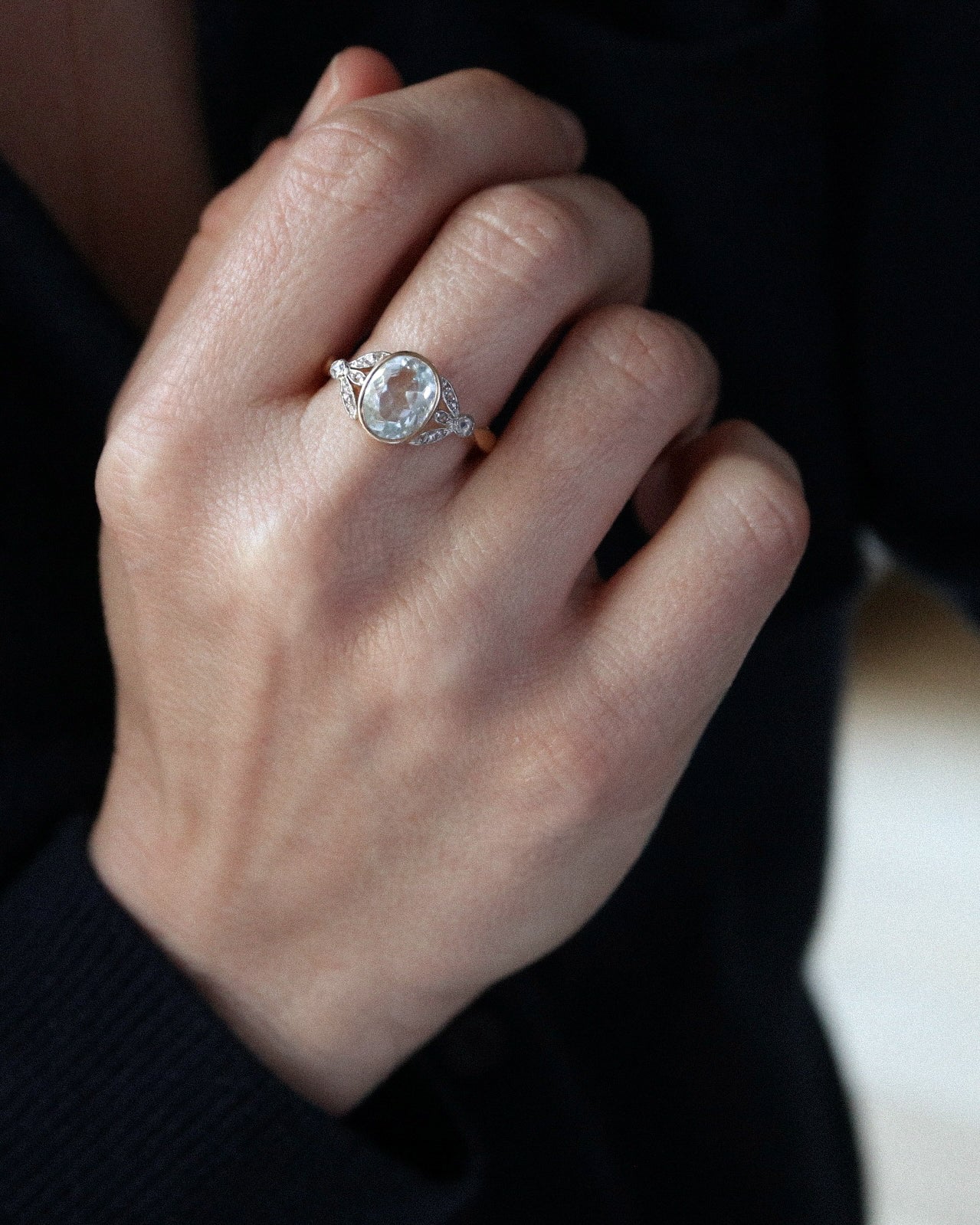 À l’origine sertie d’une pierre de synthèse en son centre, la bague a fait l’objet d’une restauration réfléchie, guidée par le respect de son dessin d’origine et la volonté d’en révéler toute la noblesse. Elle accueille désormais une aigue-marine ovale de 2,02 carats, sertie clos, dont la teinte limpide et apaisante évoque une eau claire en mouvement.