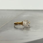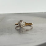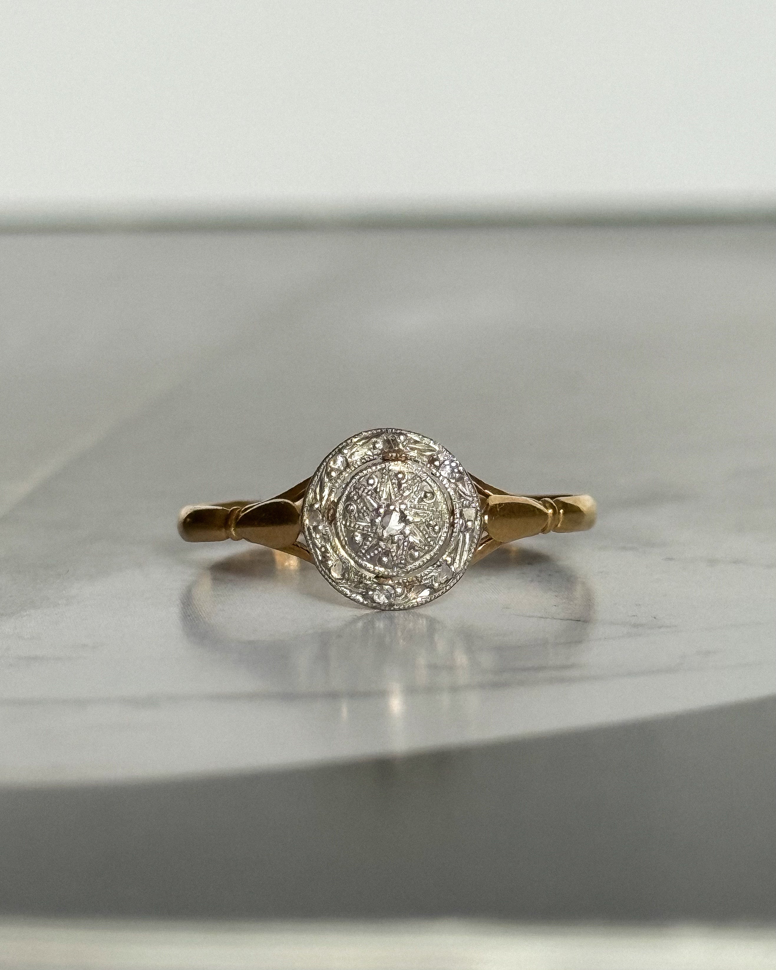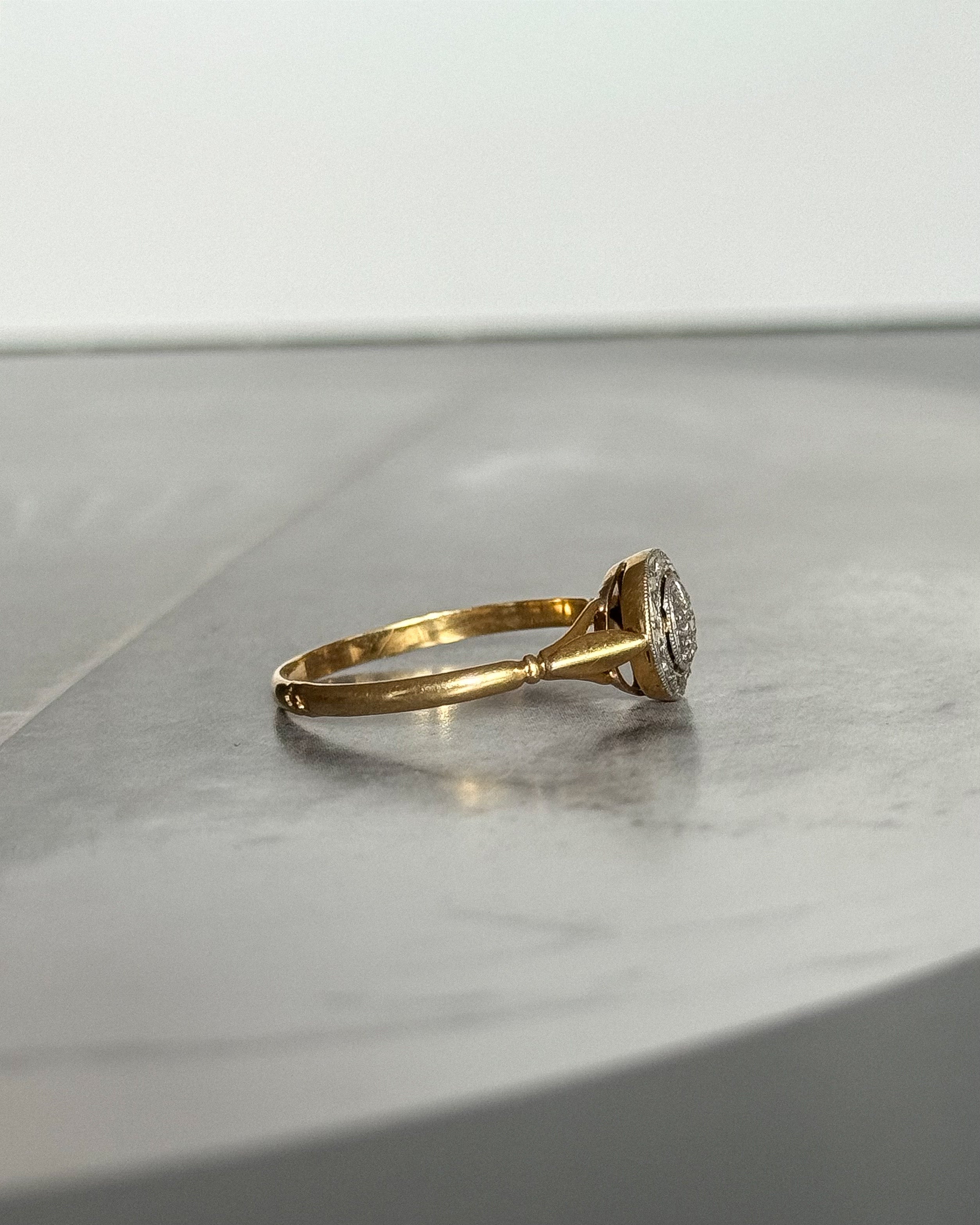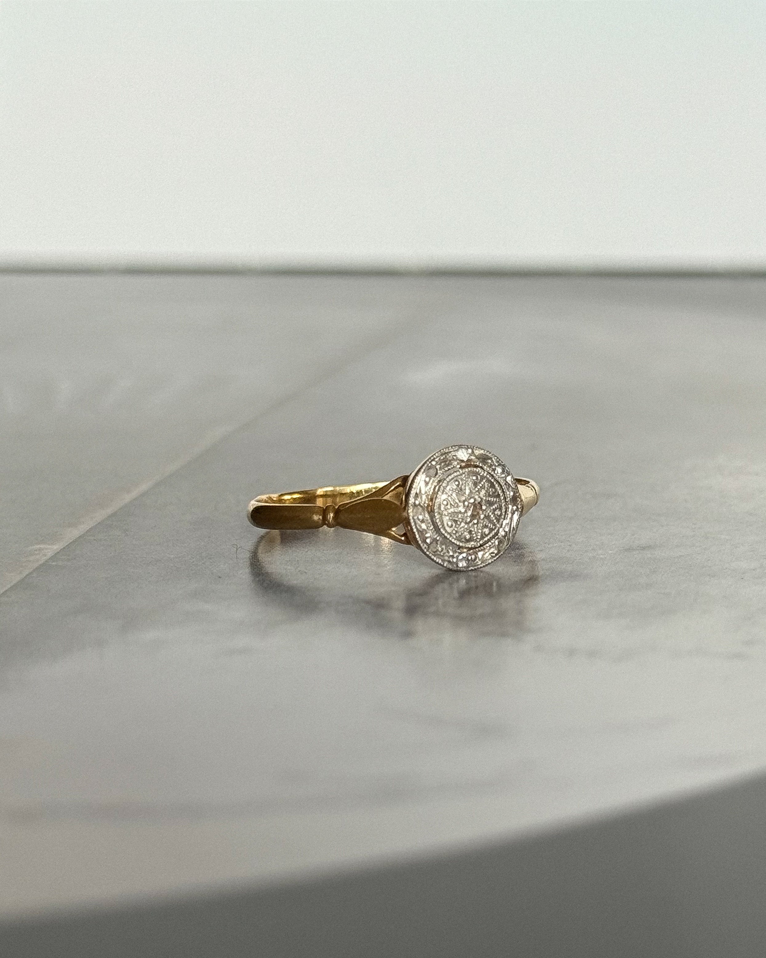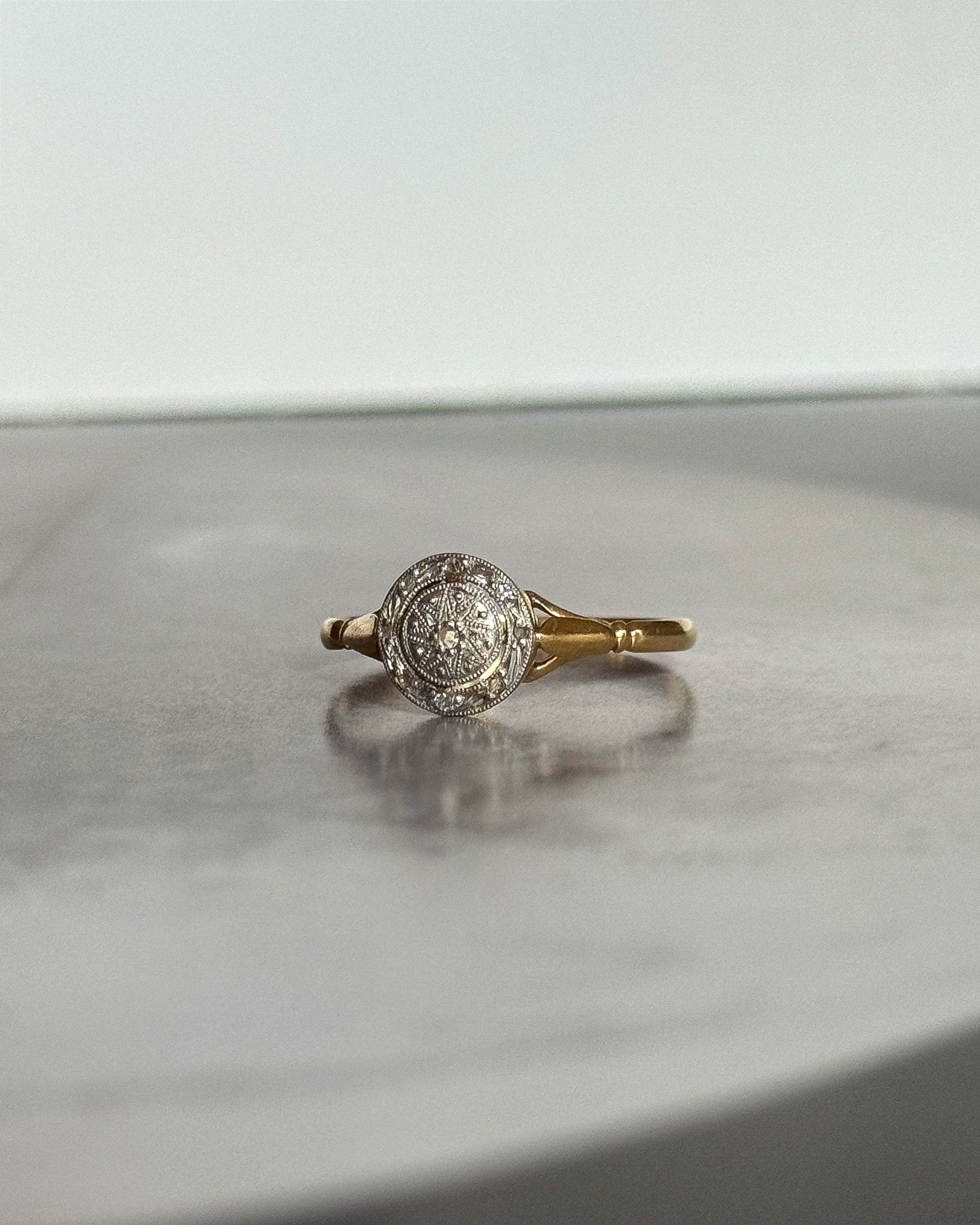 La bague Art Déco ancienne Vicky incarne l’excellence du travail joaillier français des années 1920–1930. Composée de platine et d’or jaune 18 carats, elle présente un plateau circulaire au dessin équilibré, typique de l’esthétique géométrique de la période Art Déco.