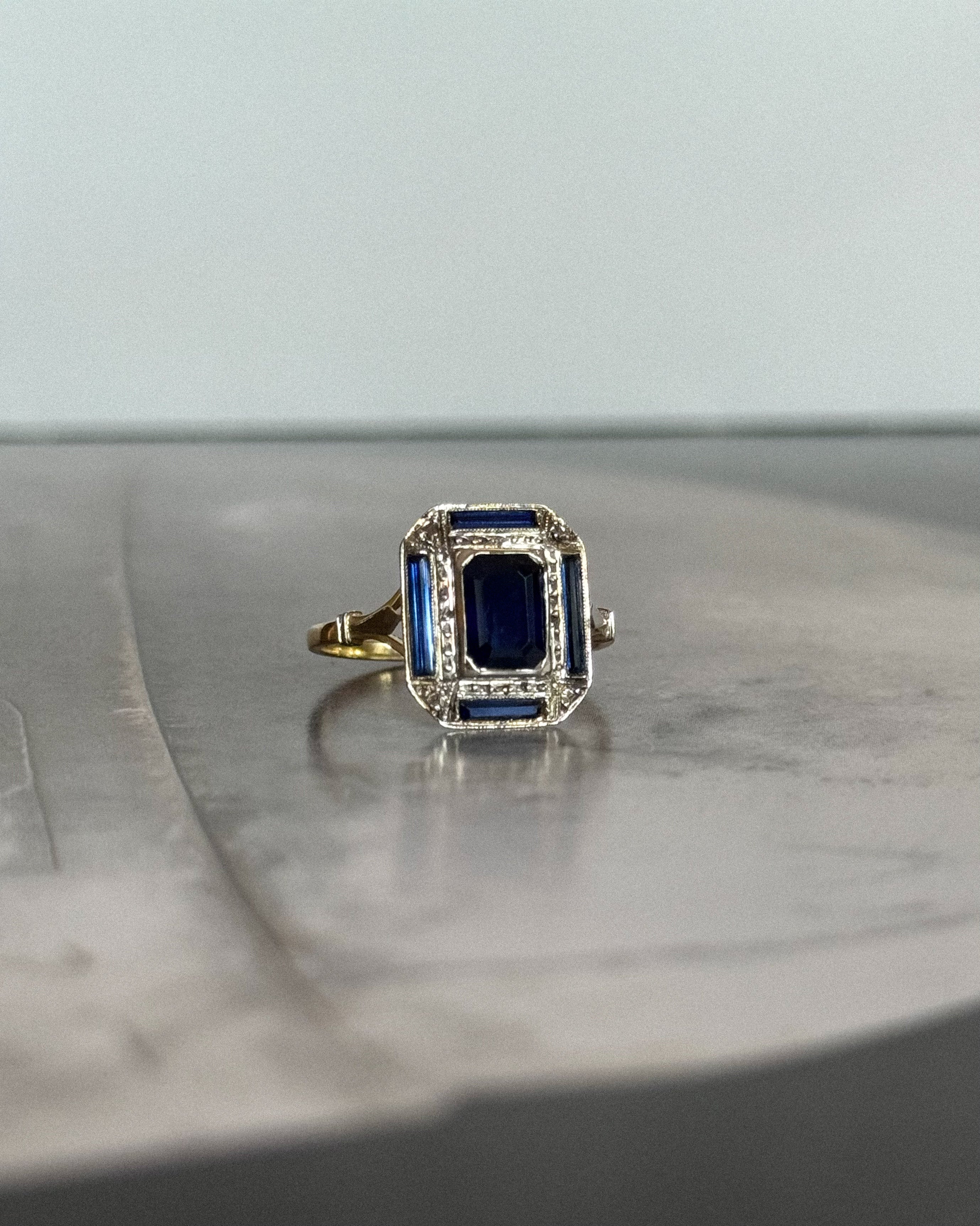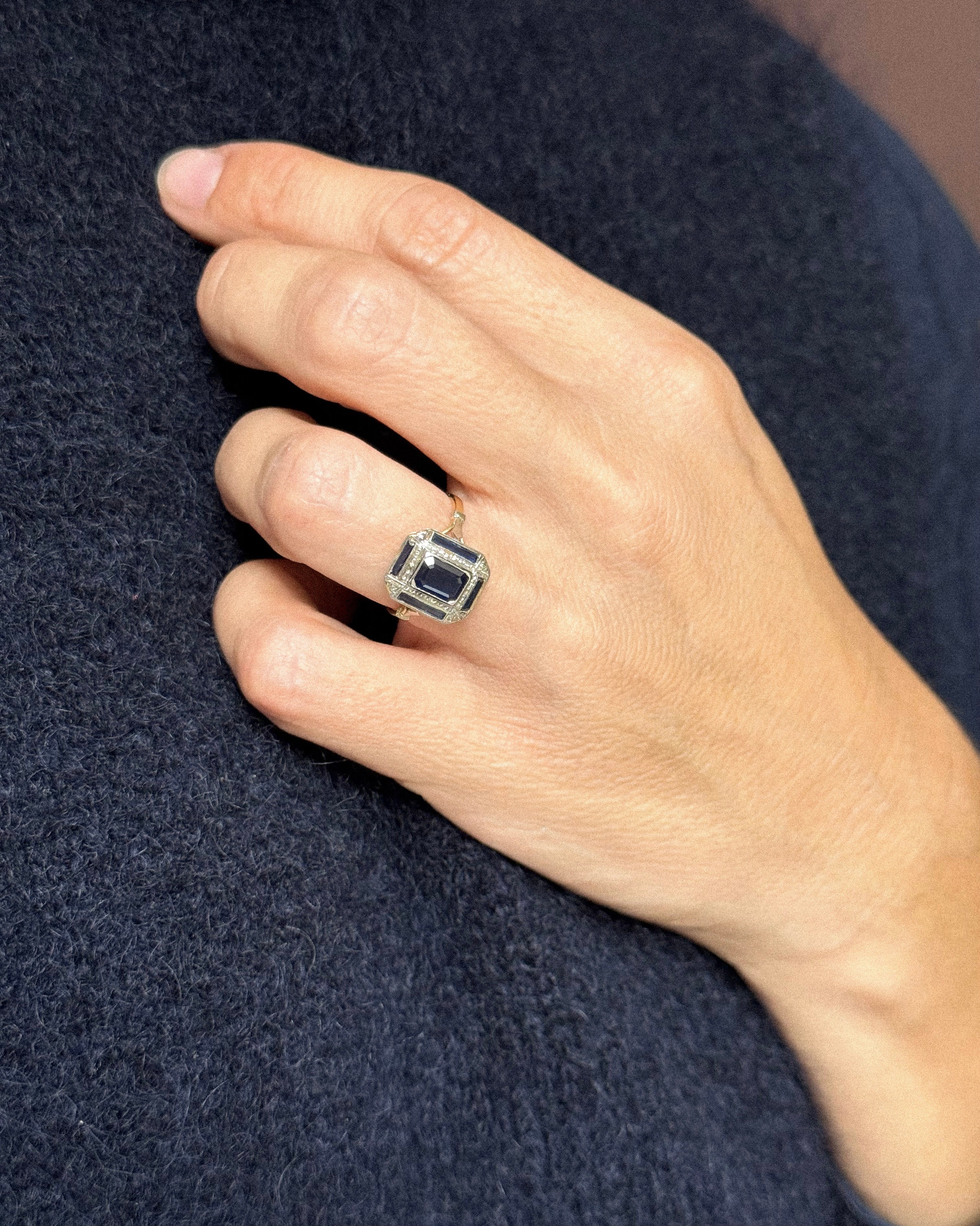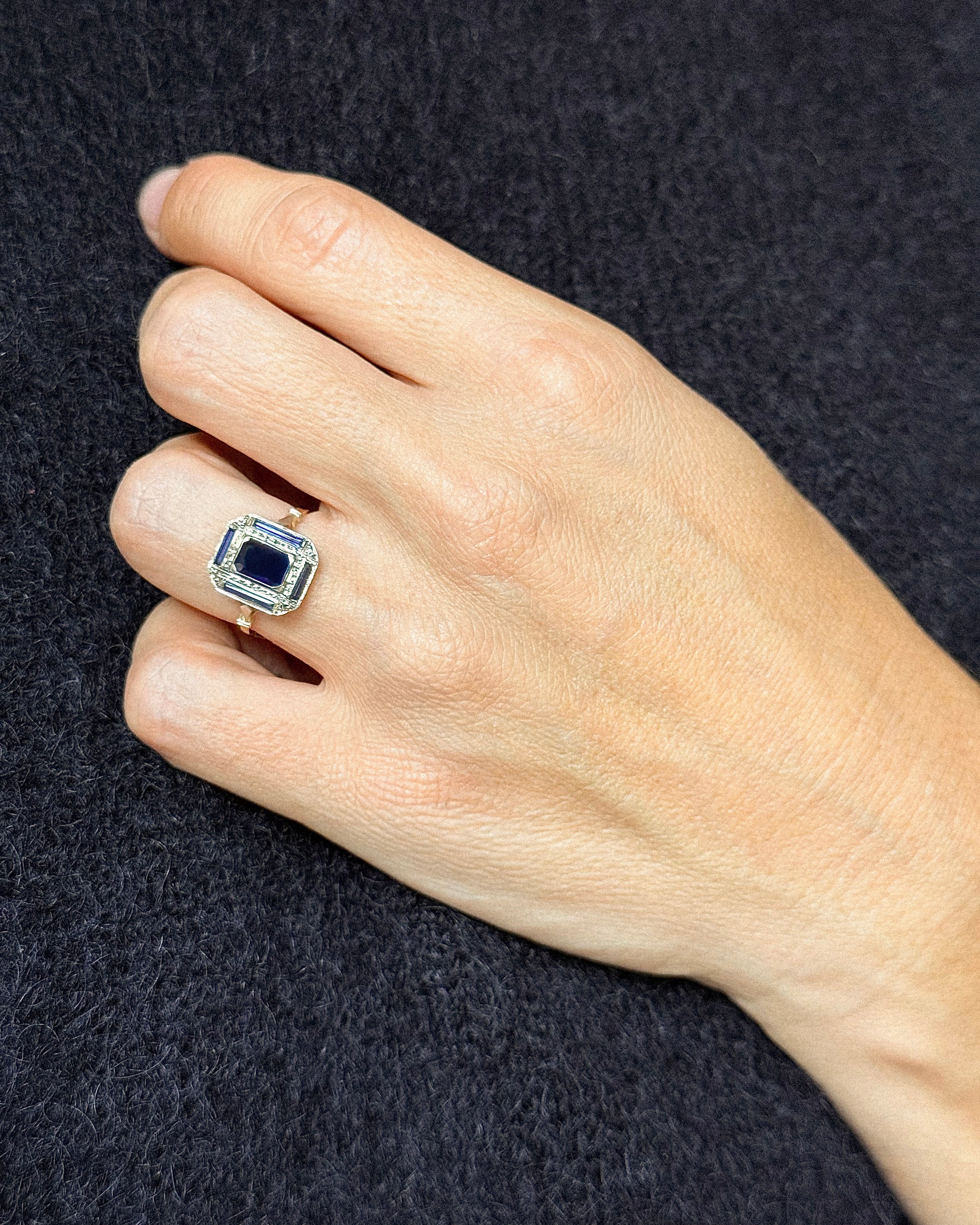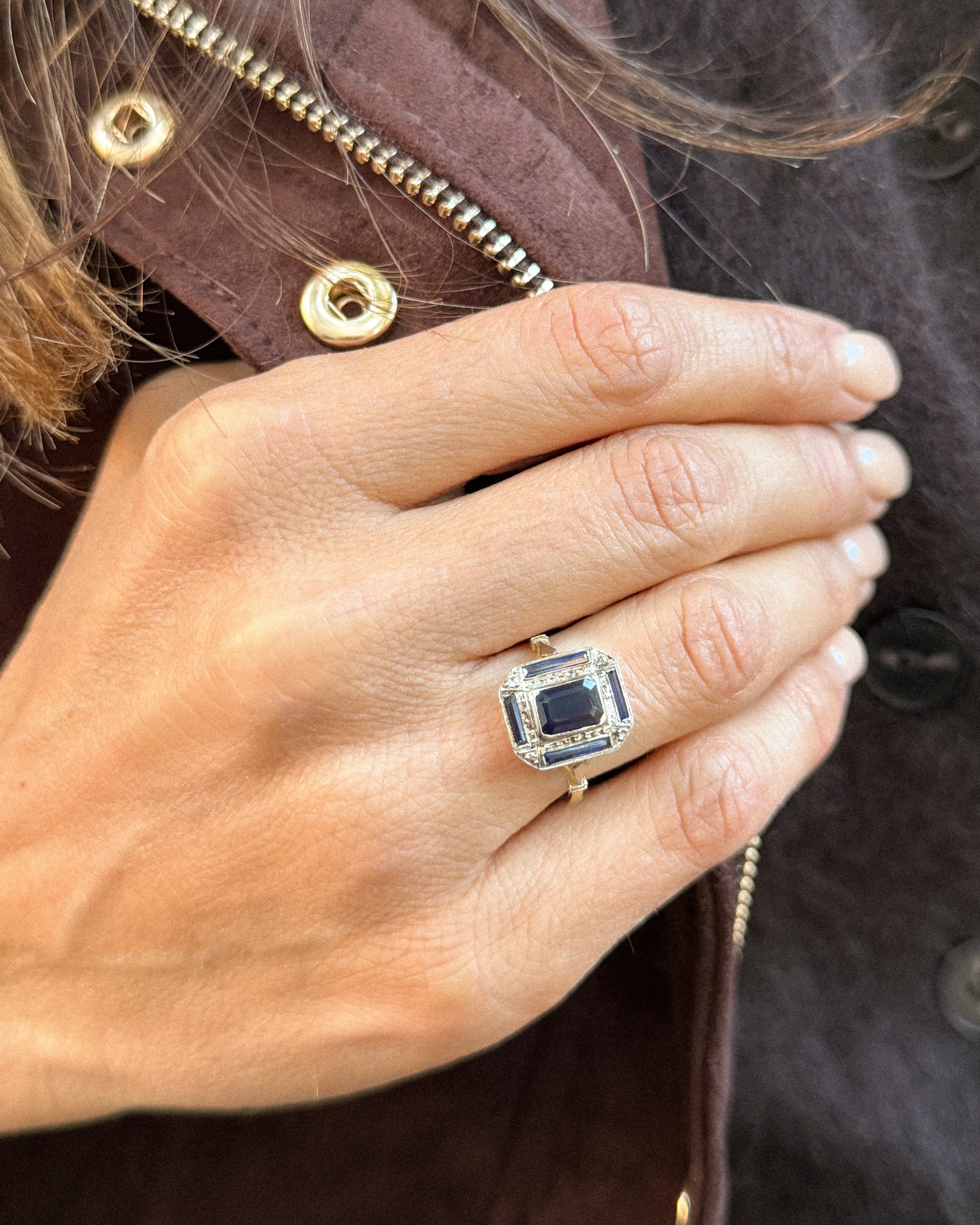La bague art déco saphir Victorine incarne l’intelligence du design joaillier des années 1920. Son plateau octogonal, typique du mouvement Art Déco, séduit par l’équilibre de ses volumes et la précision de ses lignes.