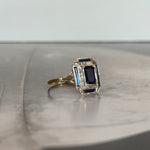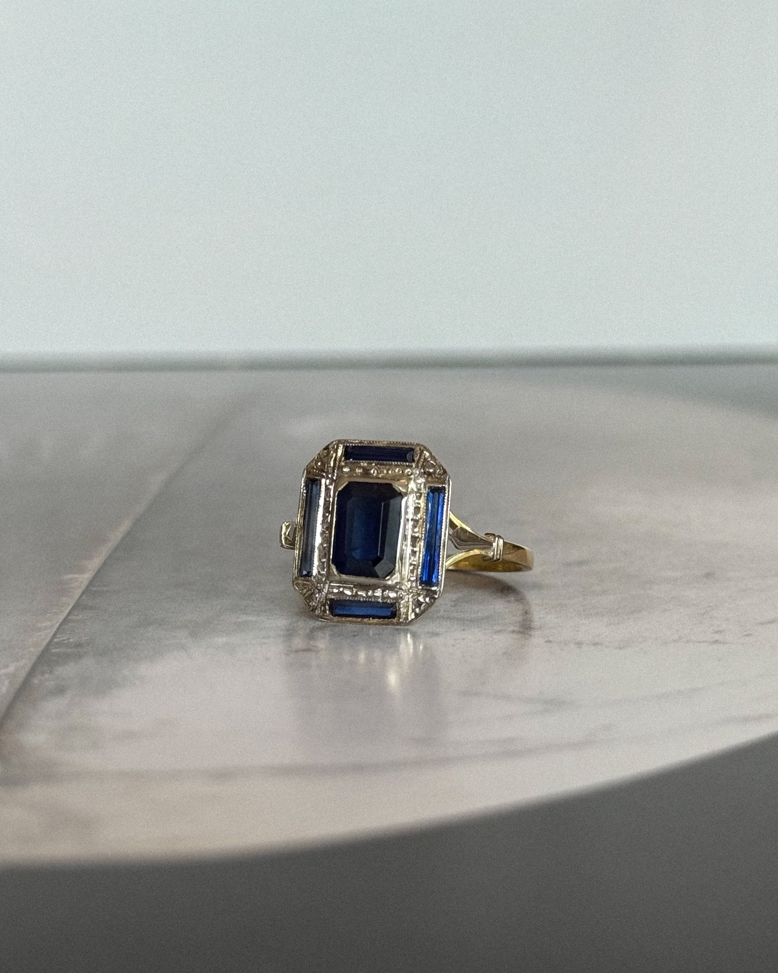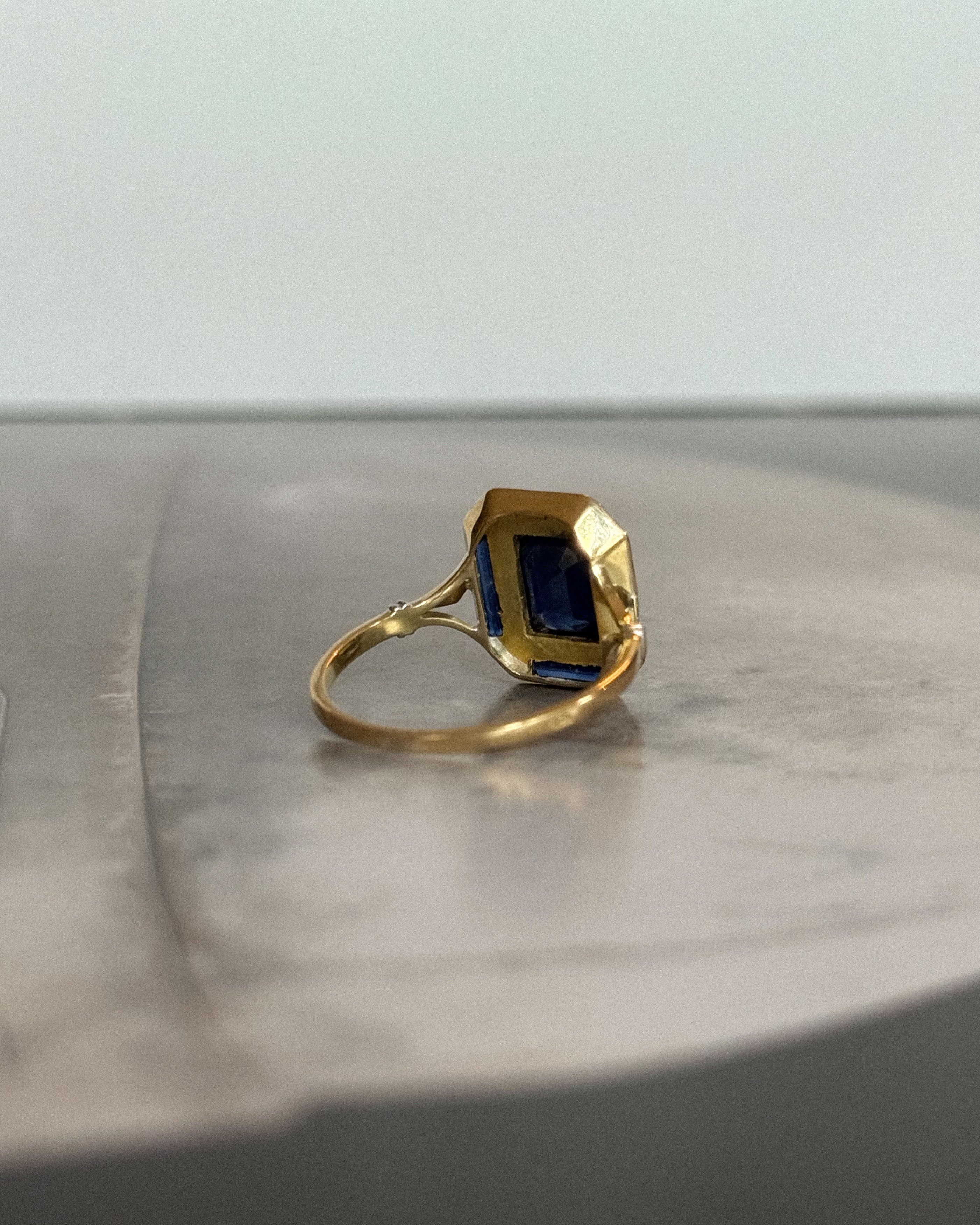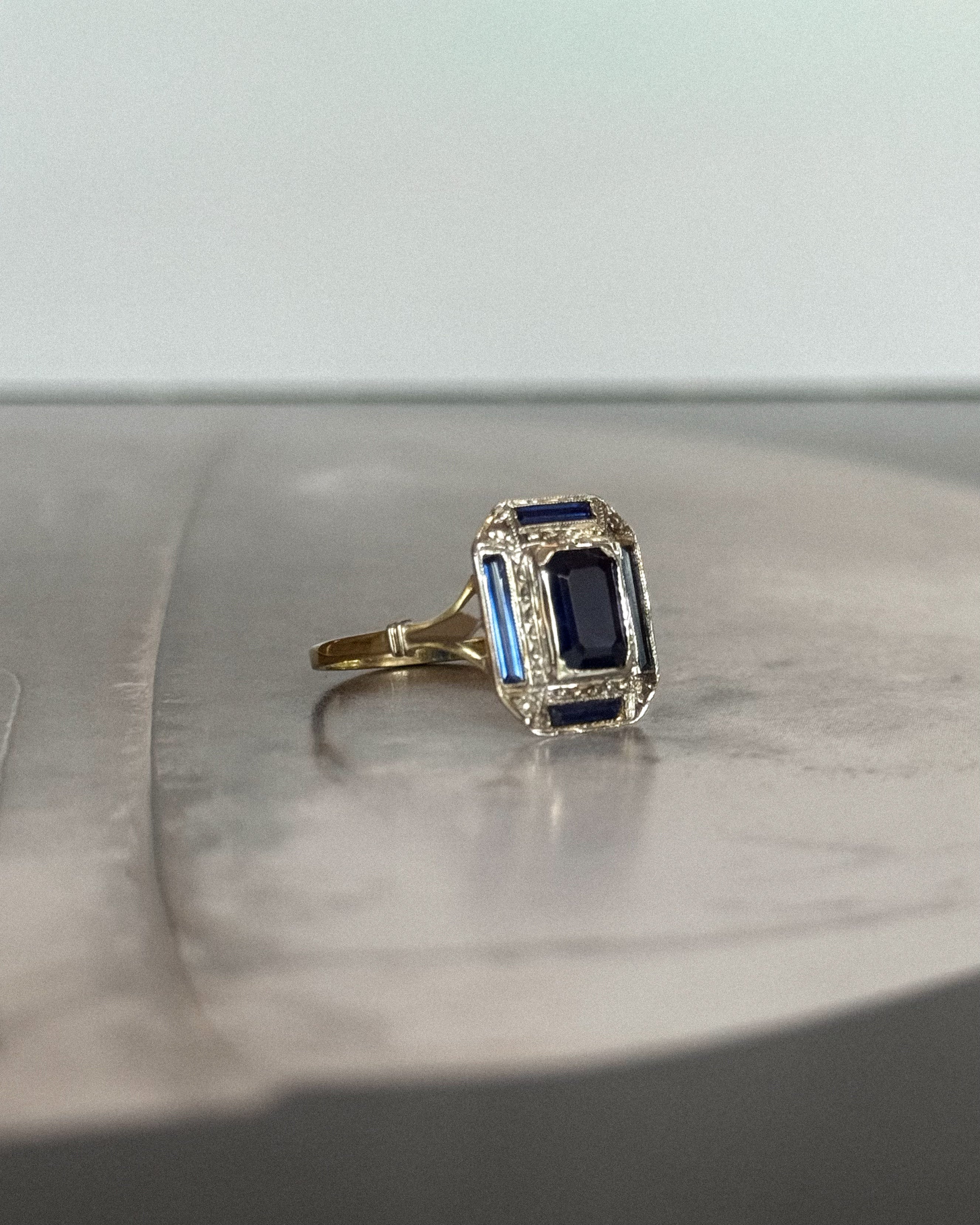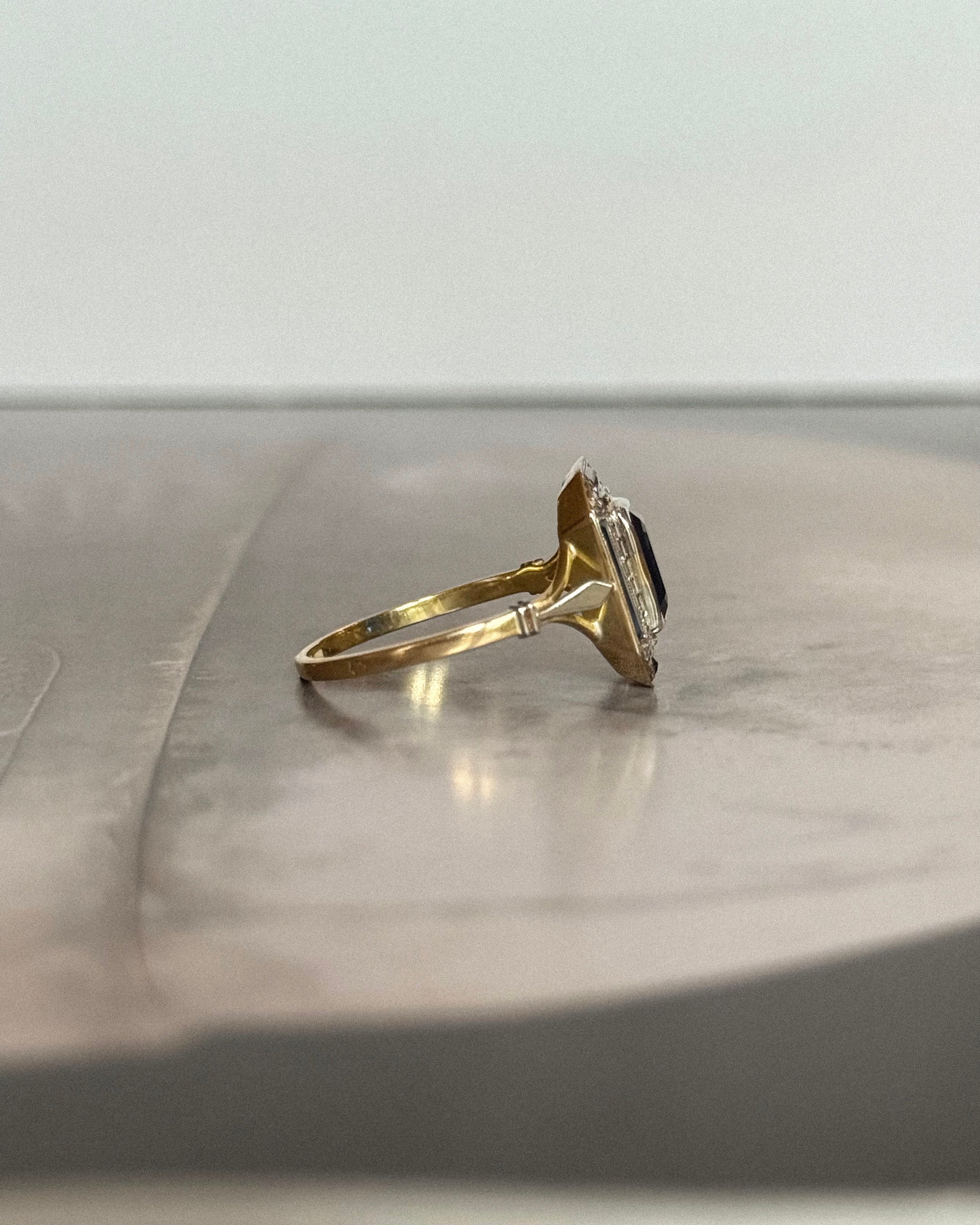 La bague art déco saphir Victorine incarne l’intelligence du design joaillier des années 1920. Son plateau octogonal, typique du mouvement Art Déco, séduit par l’équilibre de ses volumes et la précision de ses lignes.