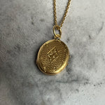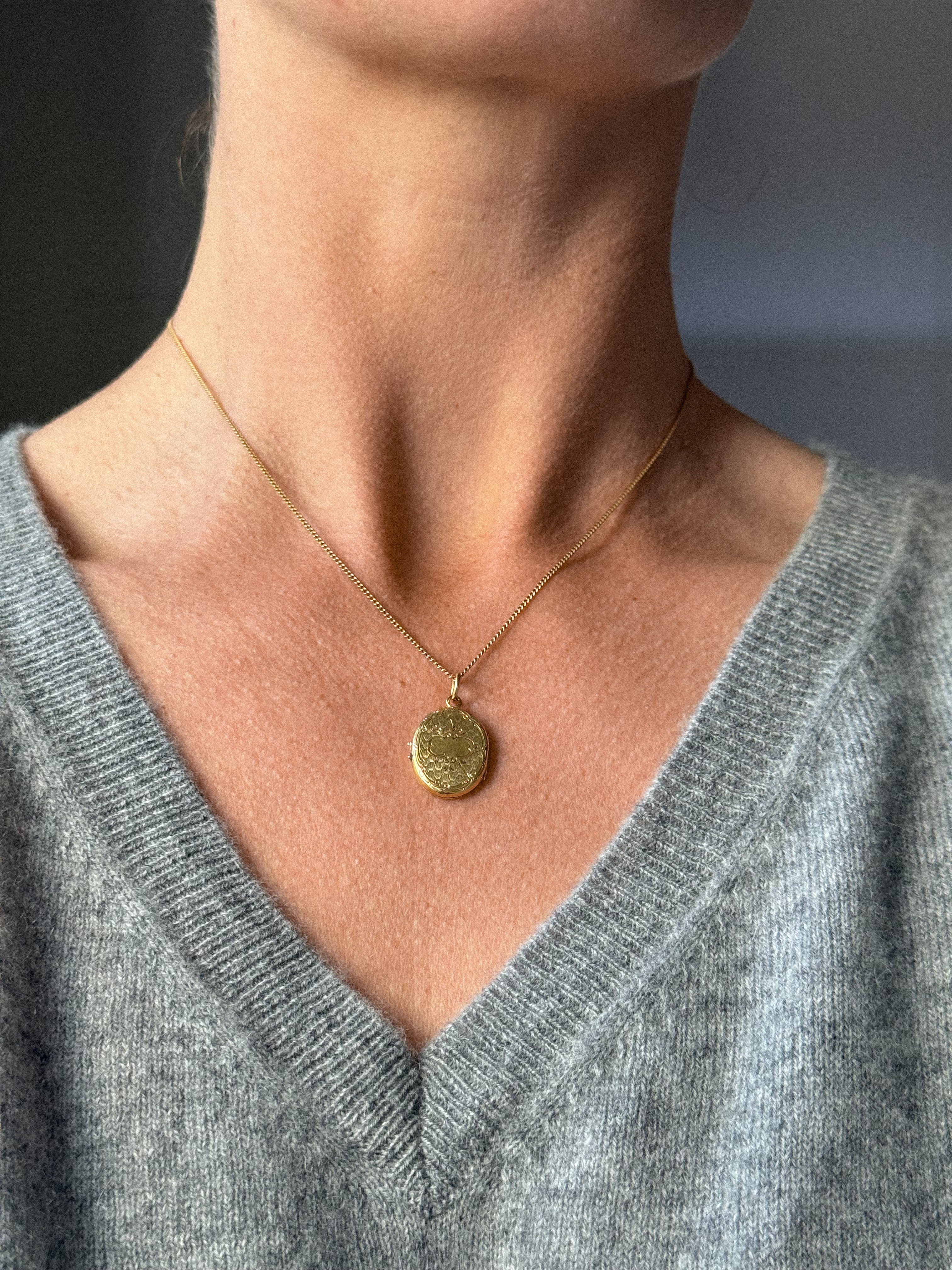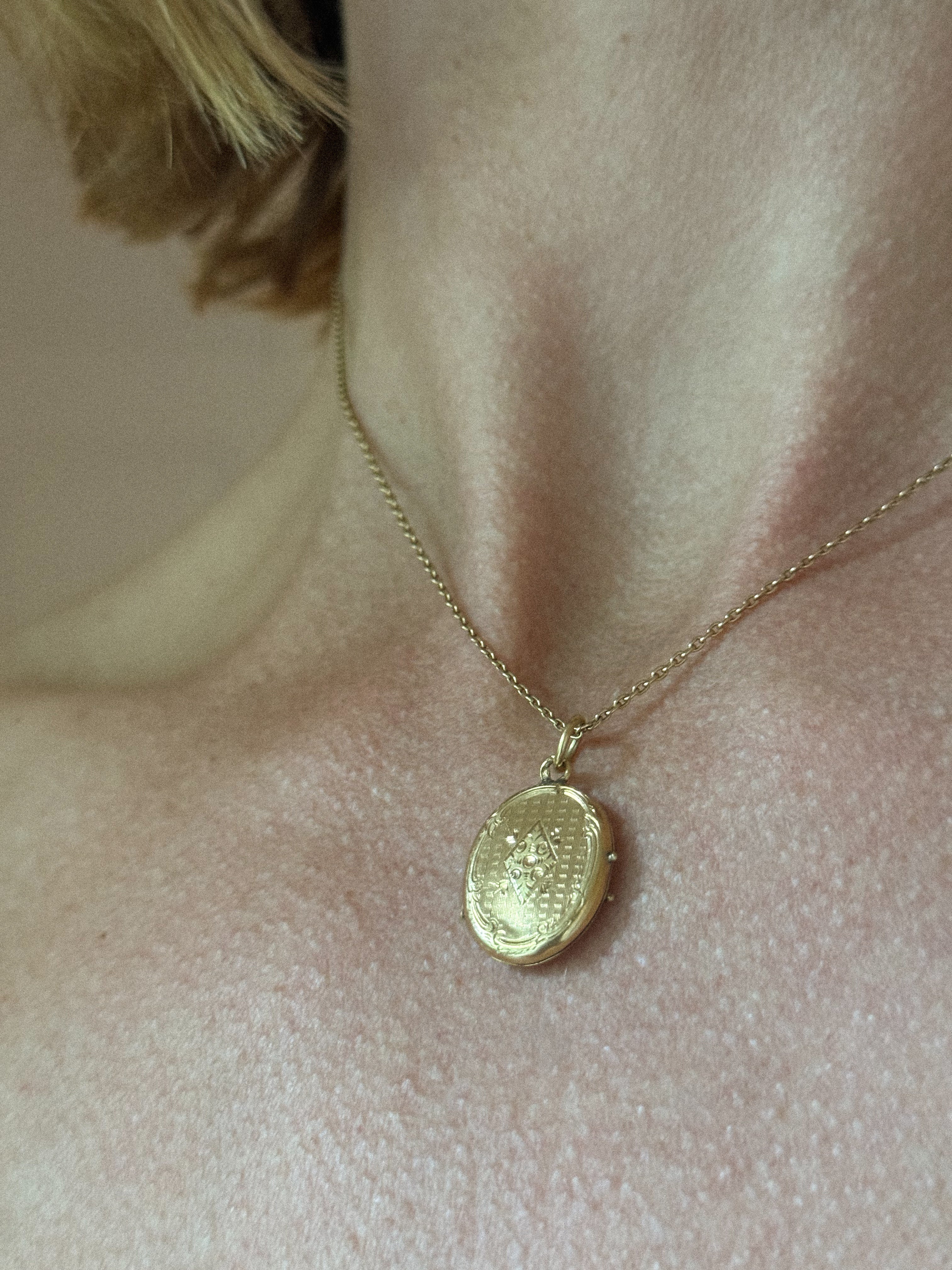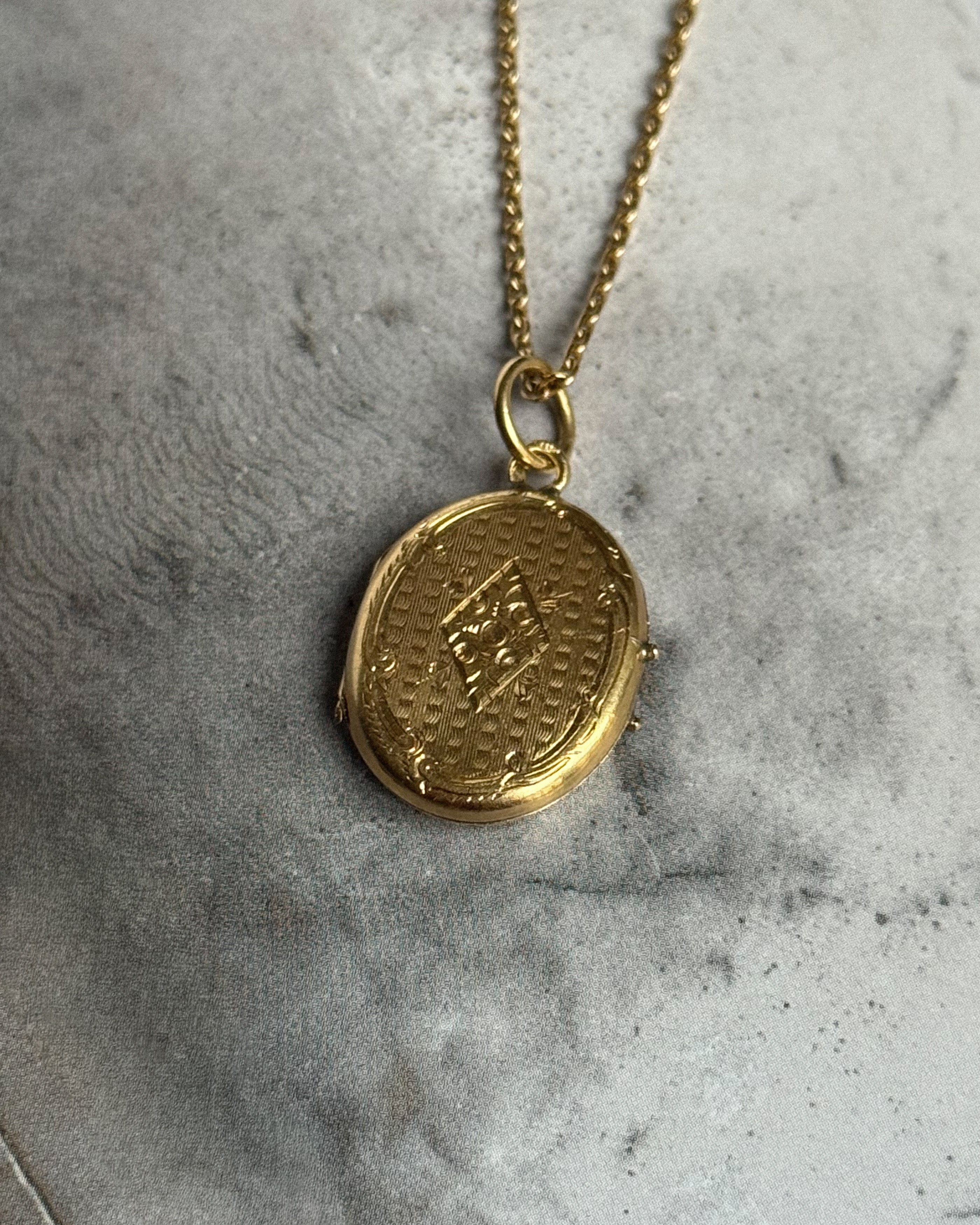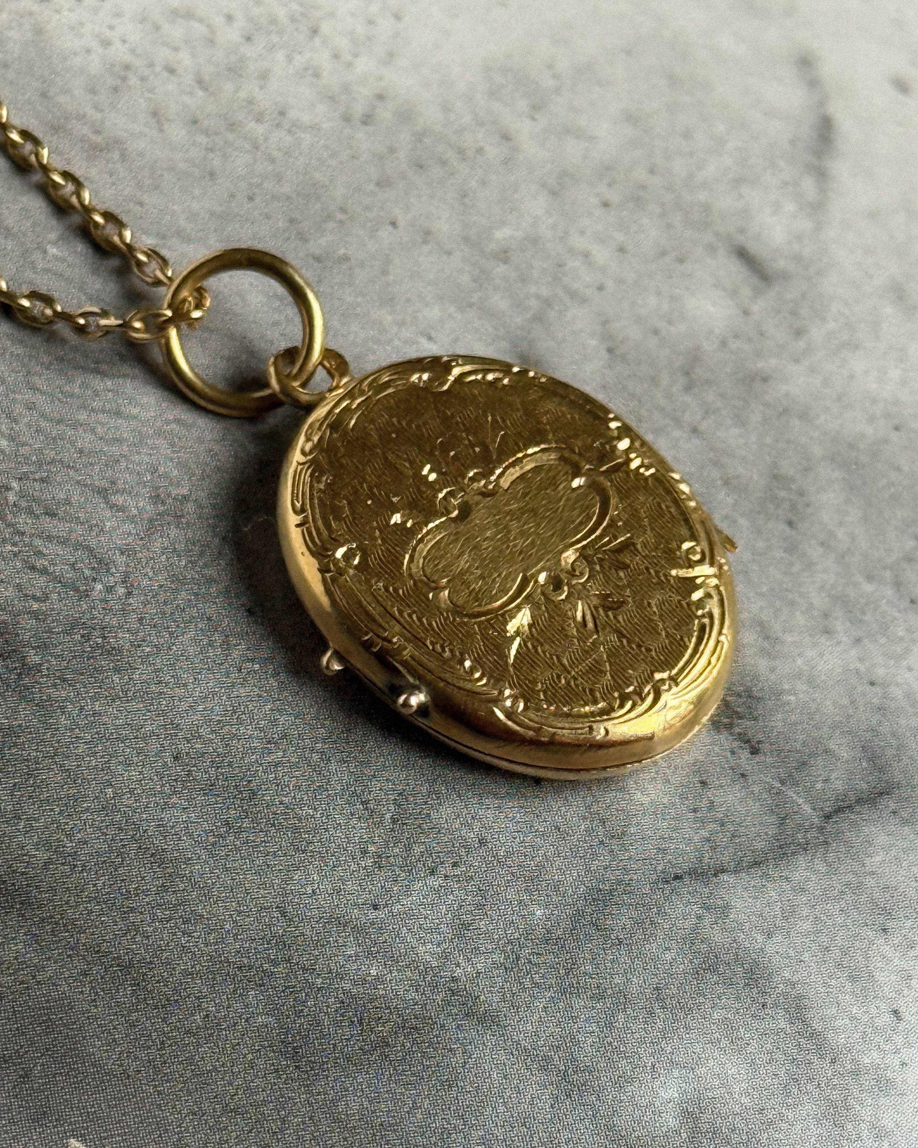 Le pendentif Arsène est un bijou d’époque, façonné en or jaune 18 carats et datant des années 1900. Son décor ciselé à la main évoque un raffinement ancien : au recto, un cartouche élégant peut accueillir une gravure personnalisée offerte, qu’il s’agisse d’initiales ou d’une date symbolique. Au verso, un motif délicat de fleurettes triangulaires renforce son charme intemporel.